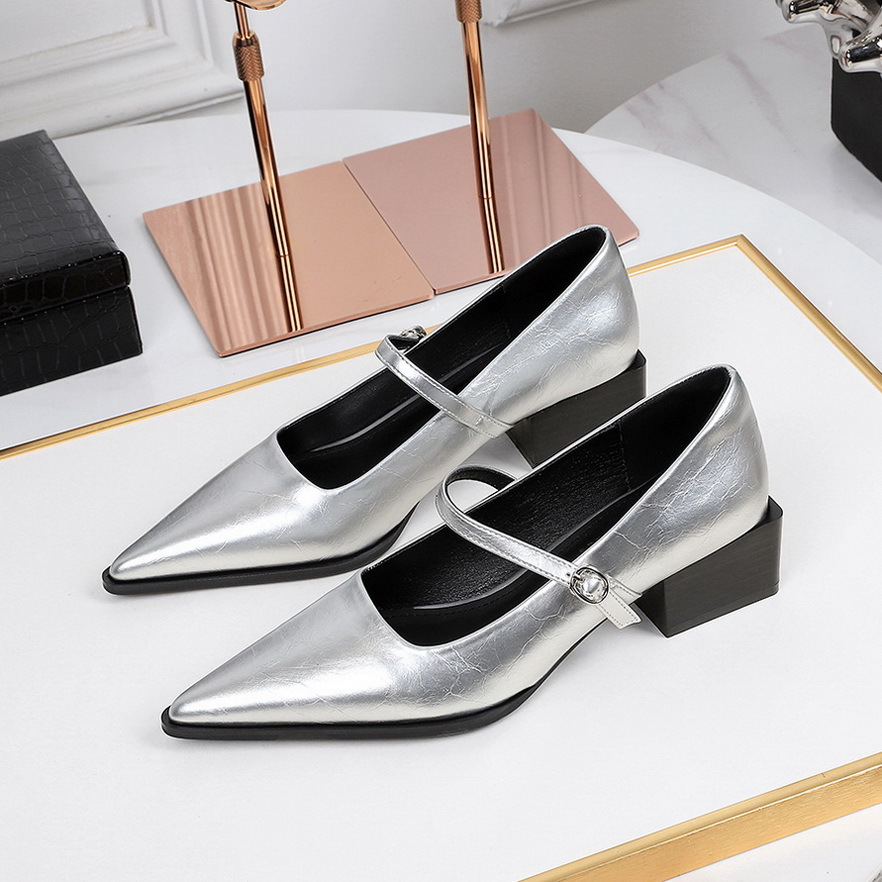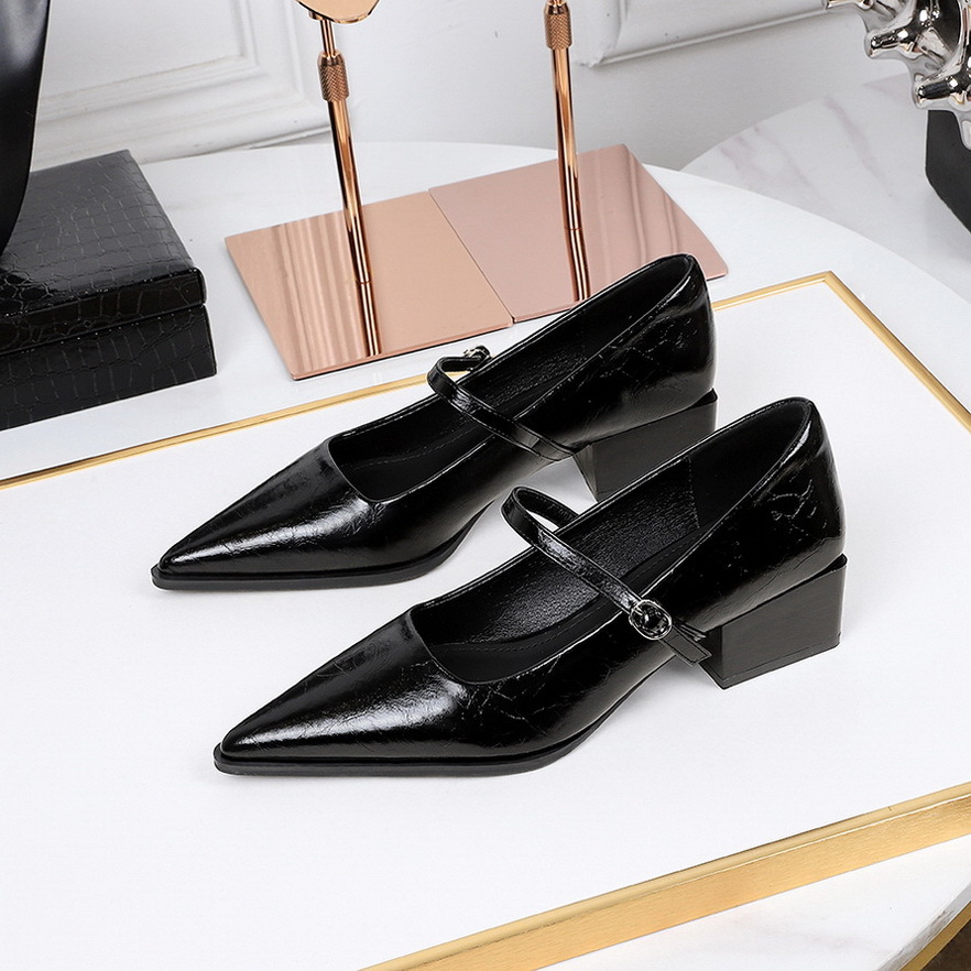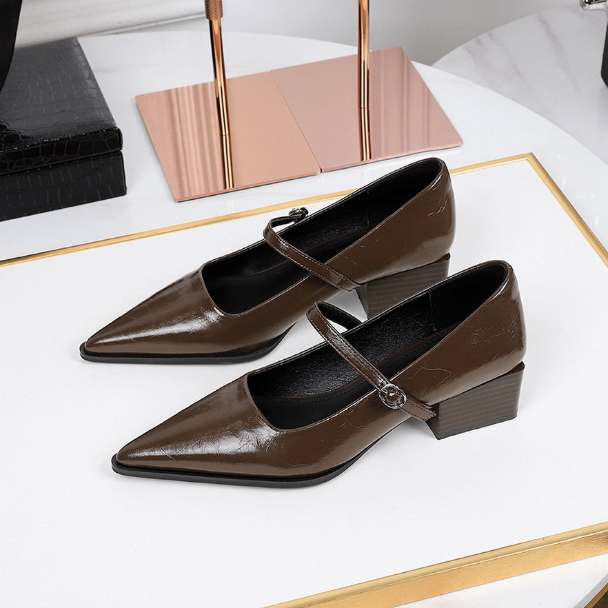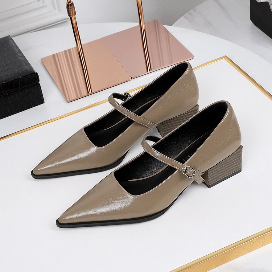 2838-1 봄과 가을 새로운 올 매치 포인팅 작은 가죽 신발 여성의 거친 힐 미드 힐 얕은 입 편안한 싱글 레이어 신발 우드 그레인