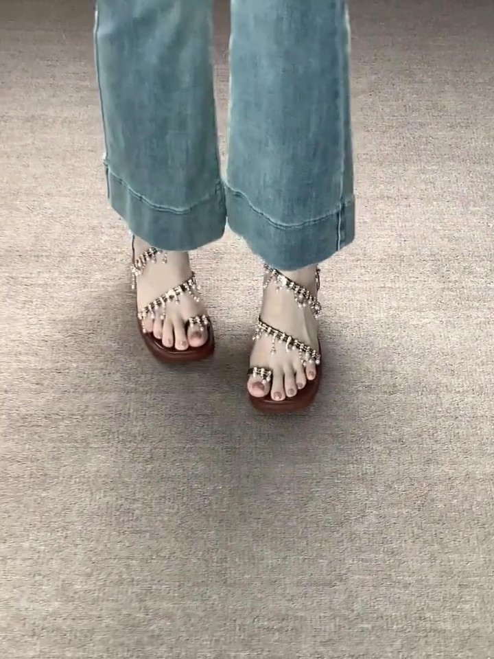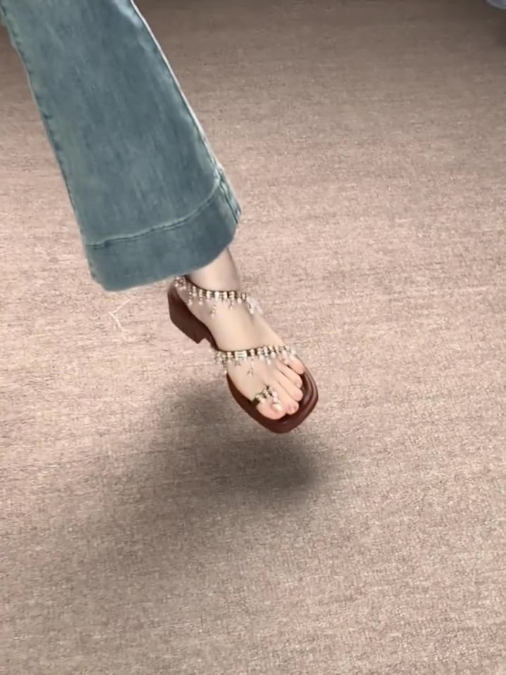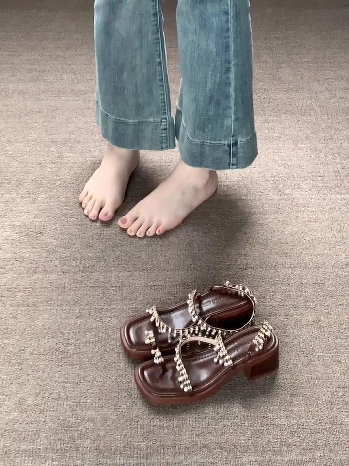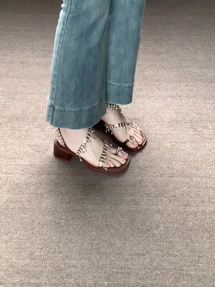 보헤미안 홀리데이 스타일 클립 발 두꺼운 힐 펄 펜던트 샌들 여자 여름 스퀘어 헤드 골든 라인스톤 로마 샌들스토어 가기