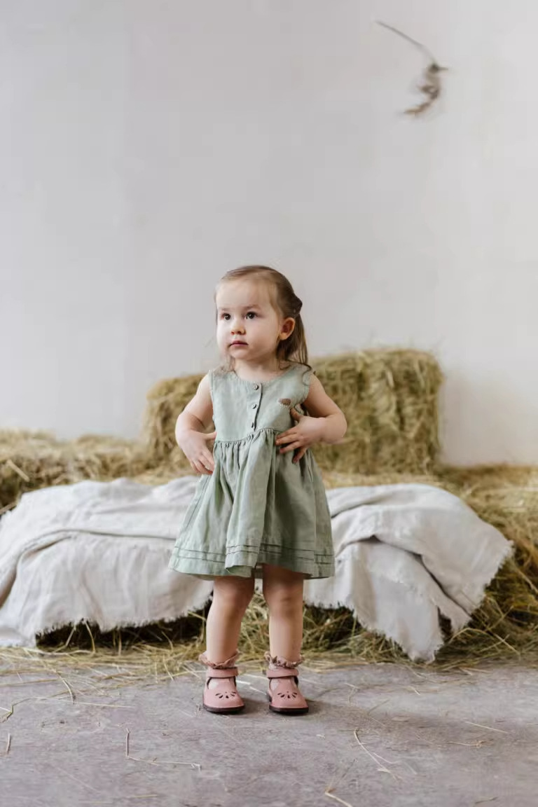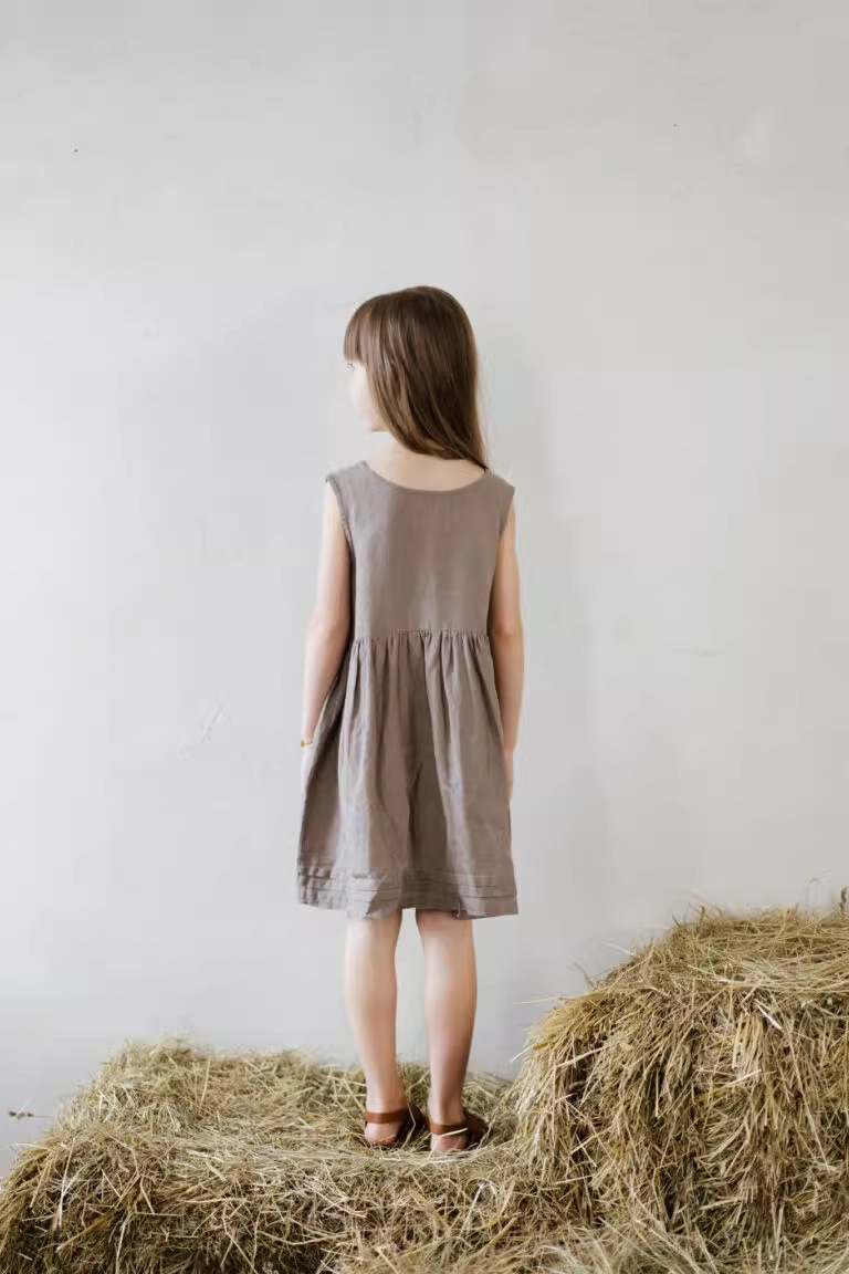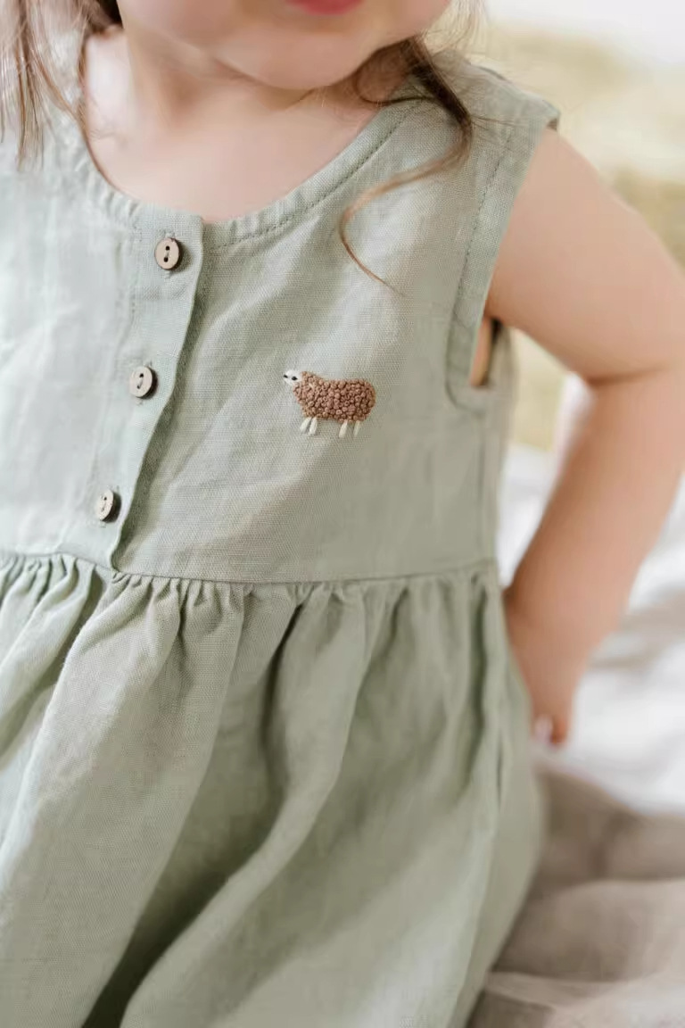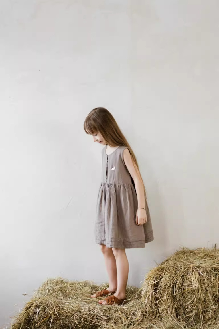 여아 여름 면 및 린넨 드레스, 아기 소녀의 예술적이고 심플한 허리 주름 디자인, 작은 앨리스 자수 스커트