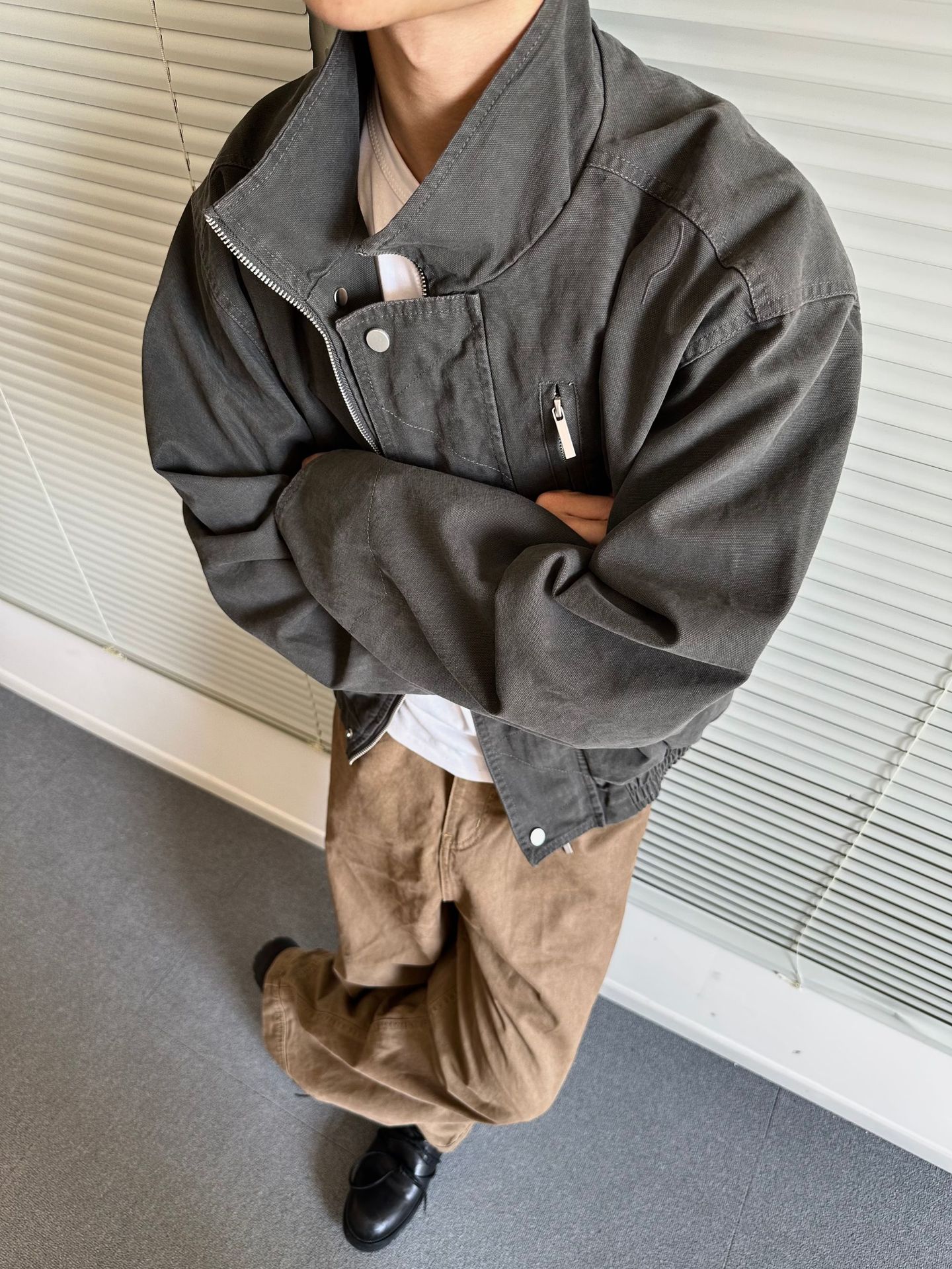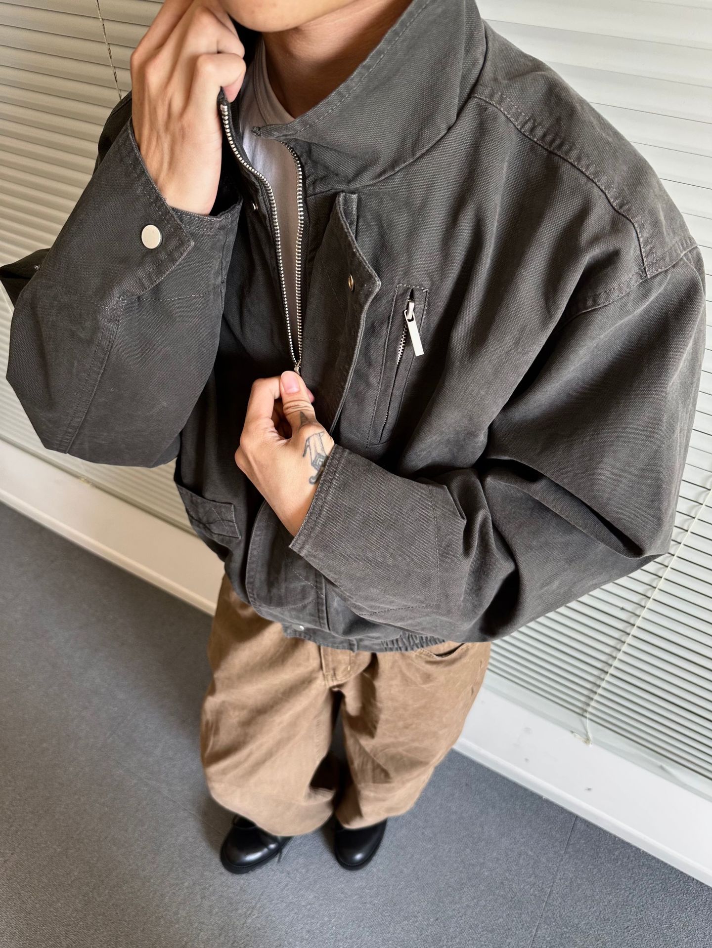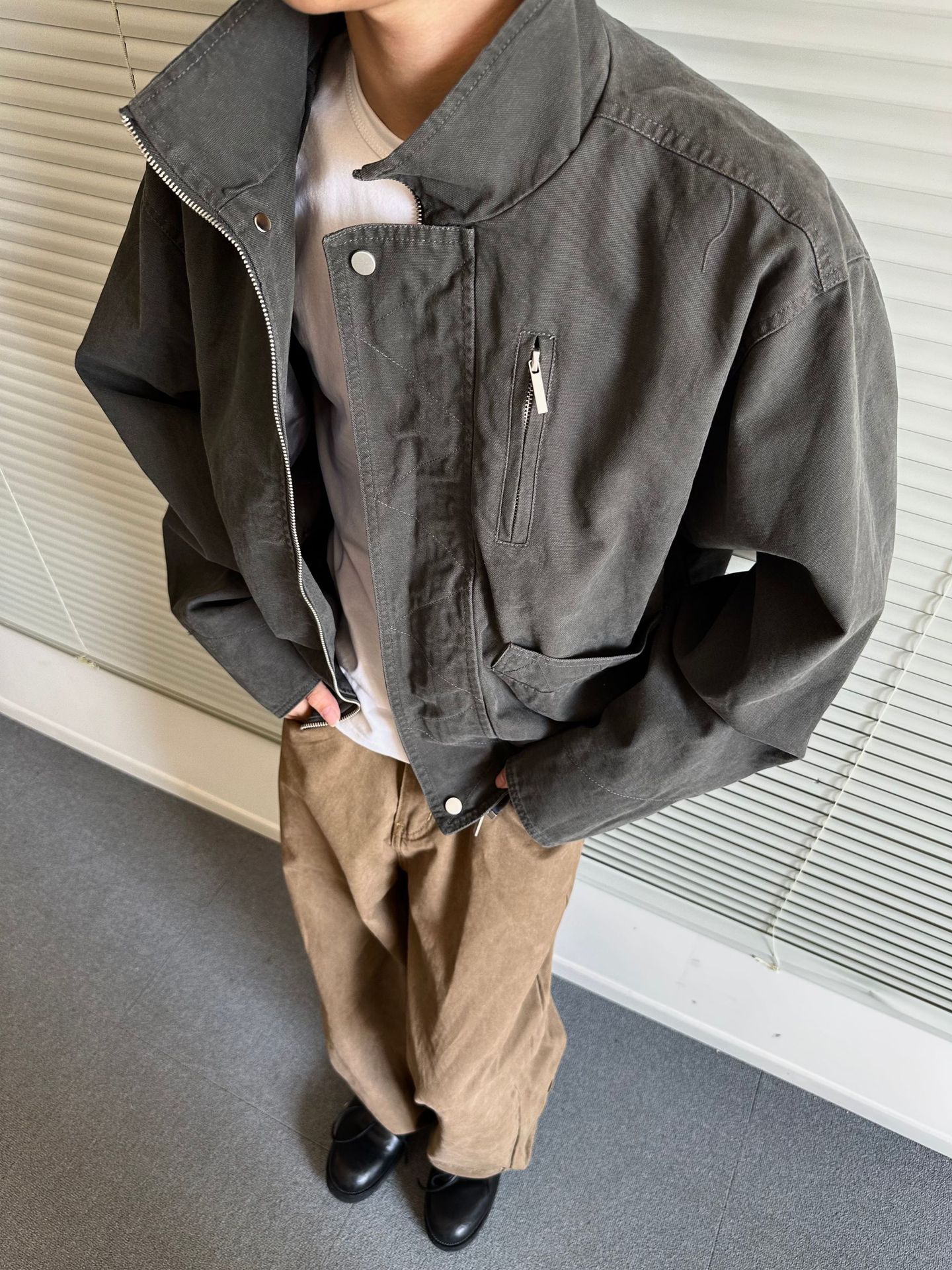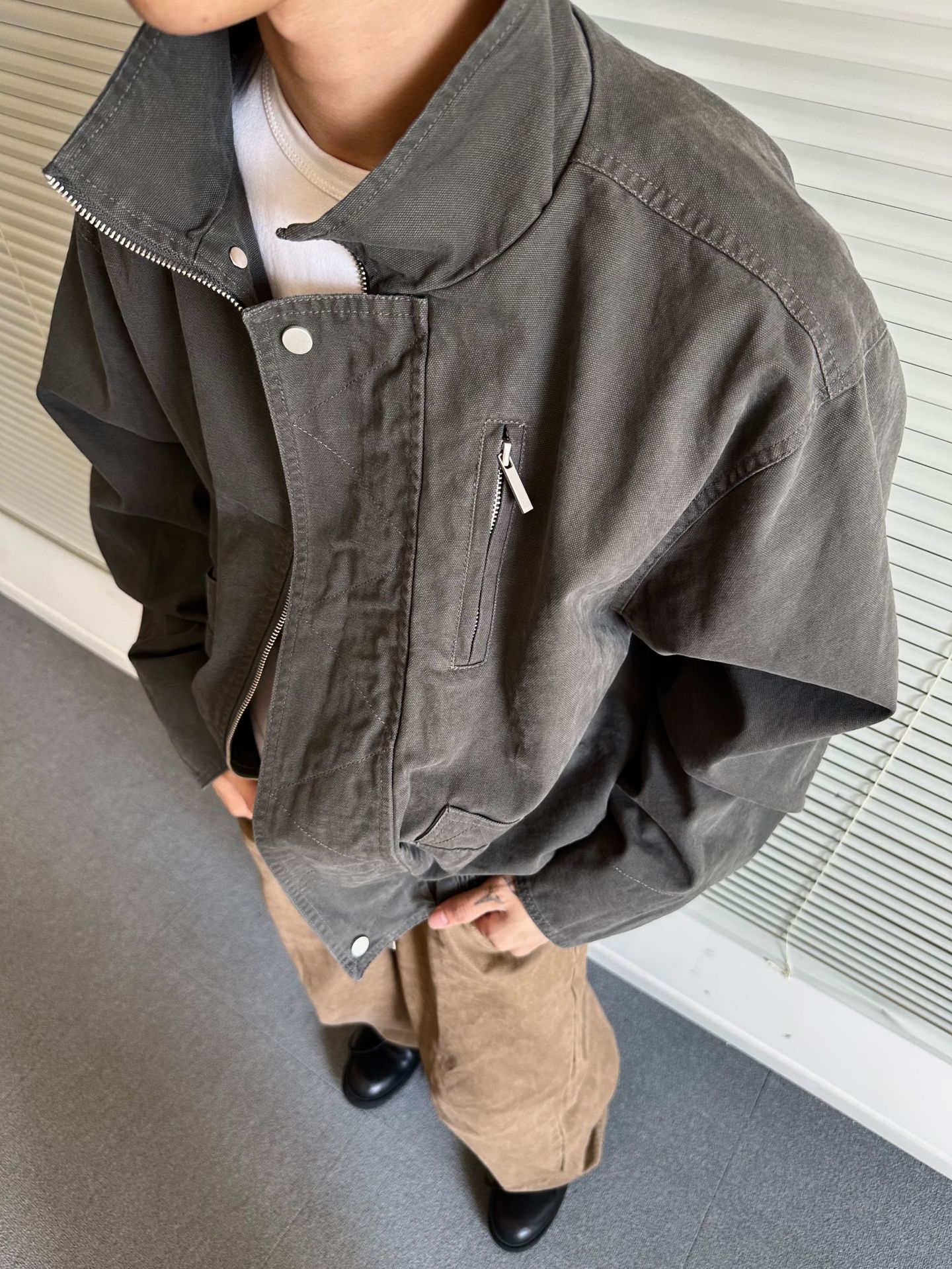 MADEEXTREME 봄 미국 복고풍 남성복 수직 칼라 폭격기 재킷 짧은 와이드 박스 작업복 세탁 재킷스토어 가기