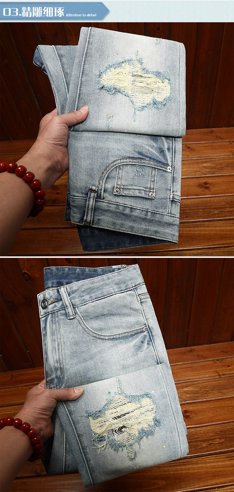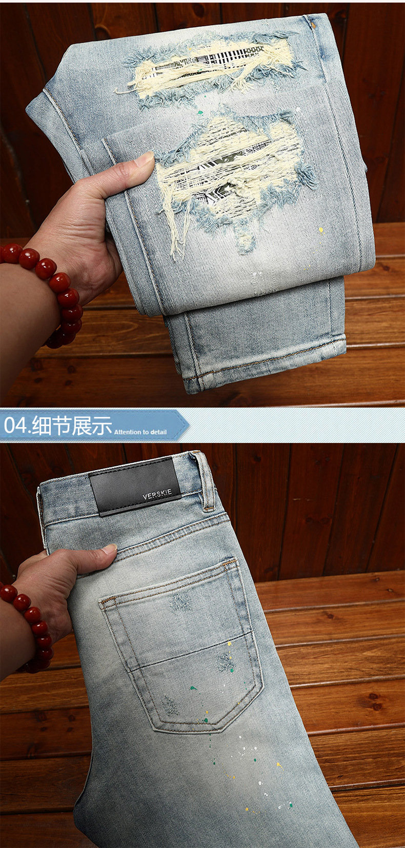 하이 엔드 유럽 청바지 남성용 찢어진 패치 슬림 핏 스트레치 잉크젯 그래피티 트렌디 캐주얼 롱 팬츠