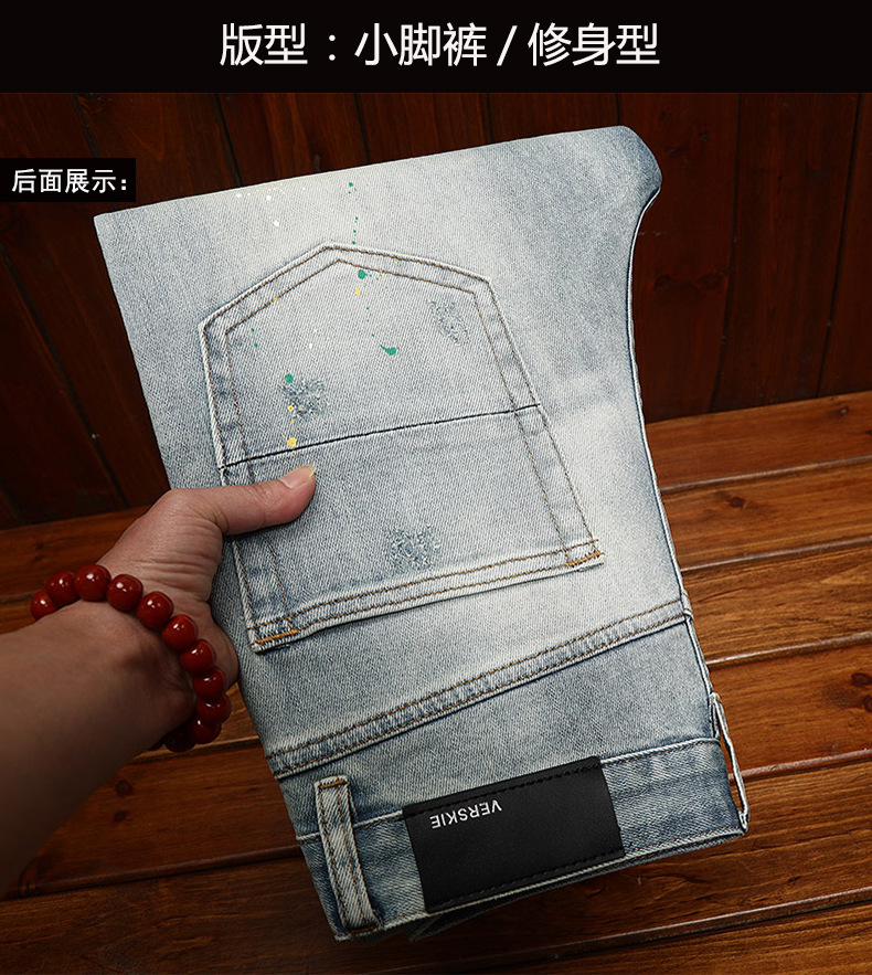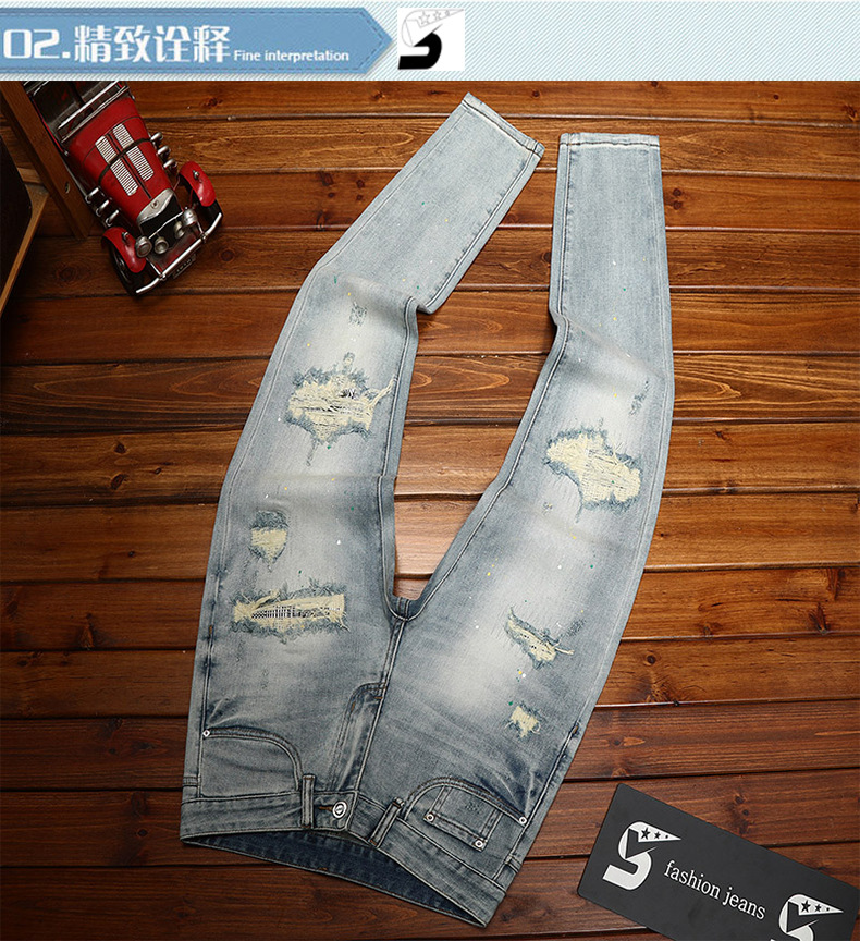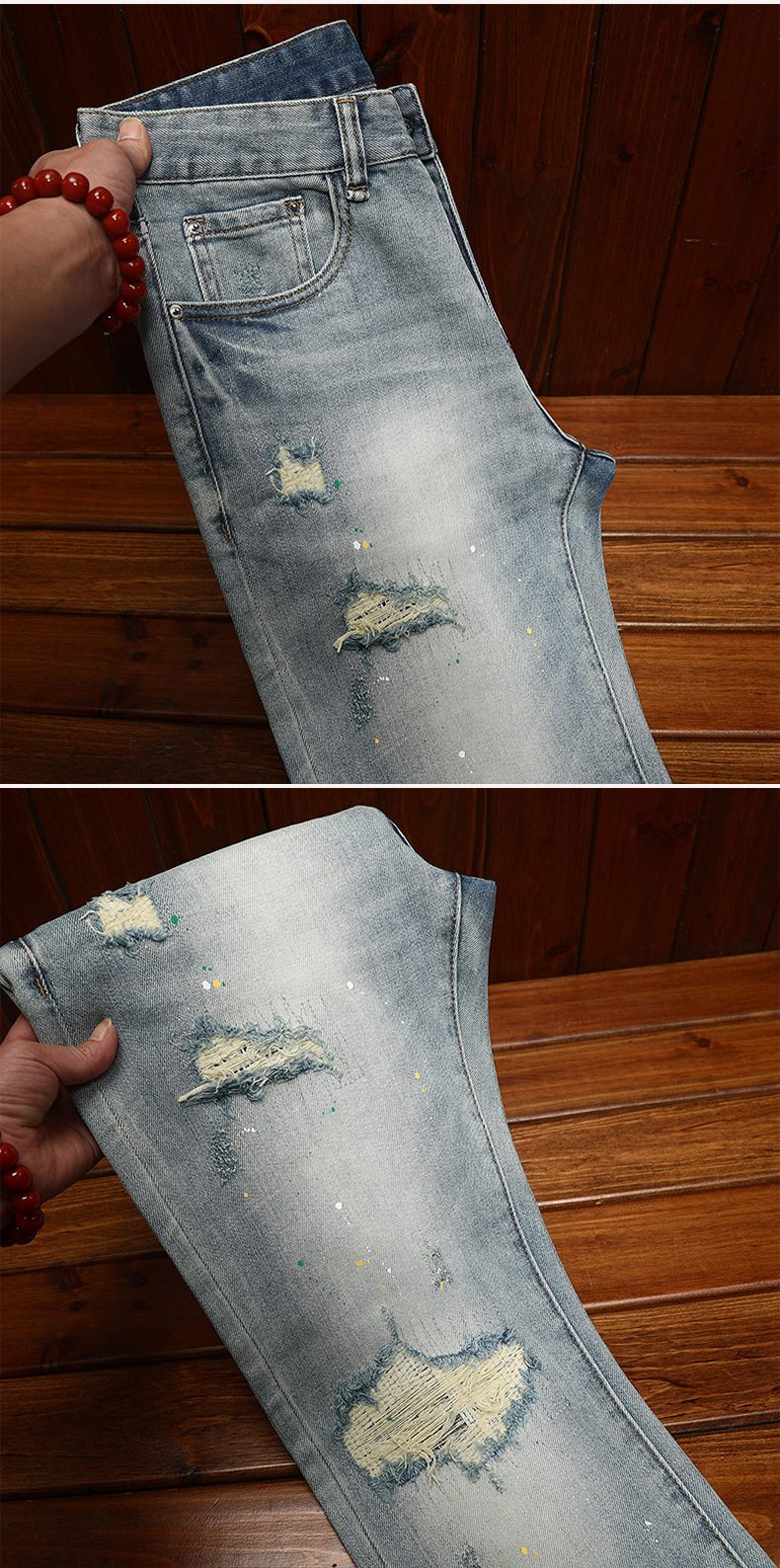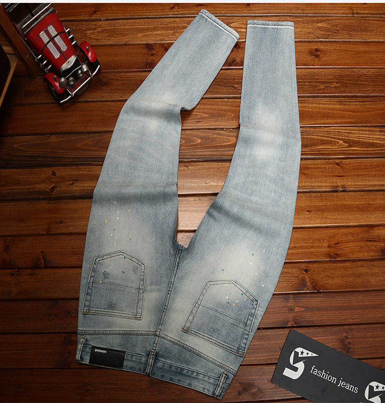 하이 엔드 유럽 청바지 남성용 찢어진 패치 슬림 핏 스트레치 잉크젯 그래피티 트렌디 캐주얼 롱 팬츠스토어 가기