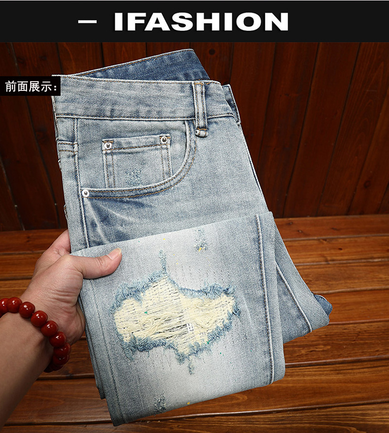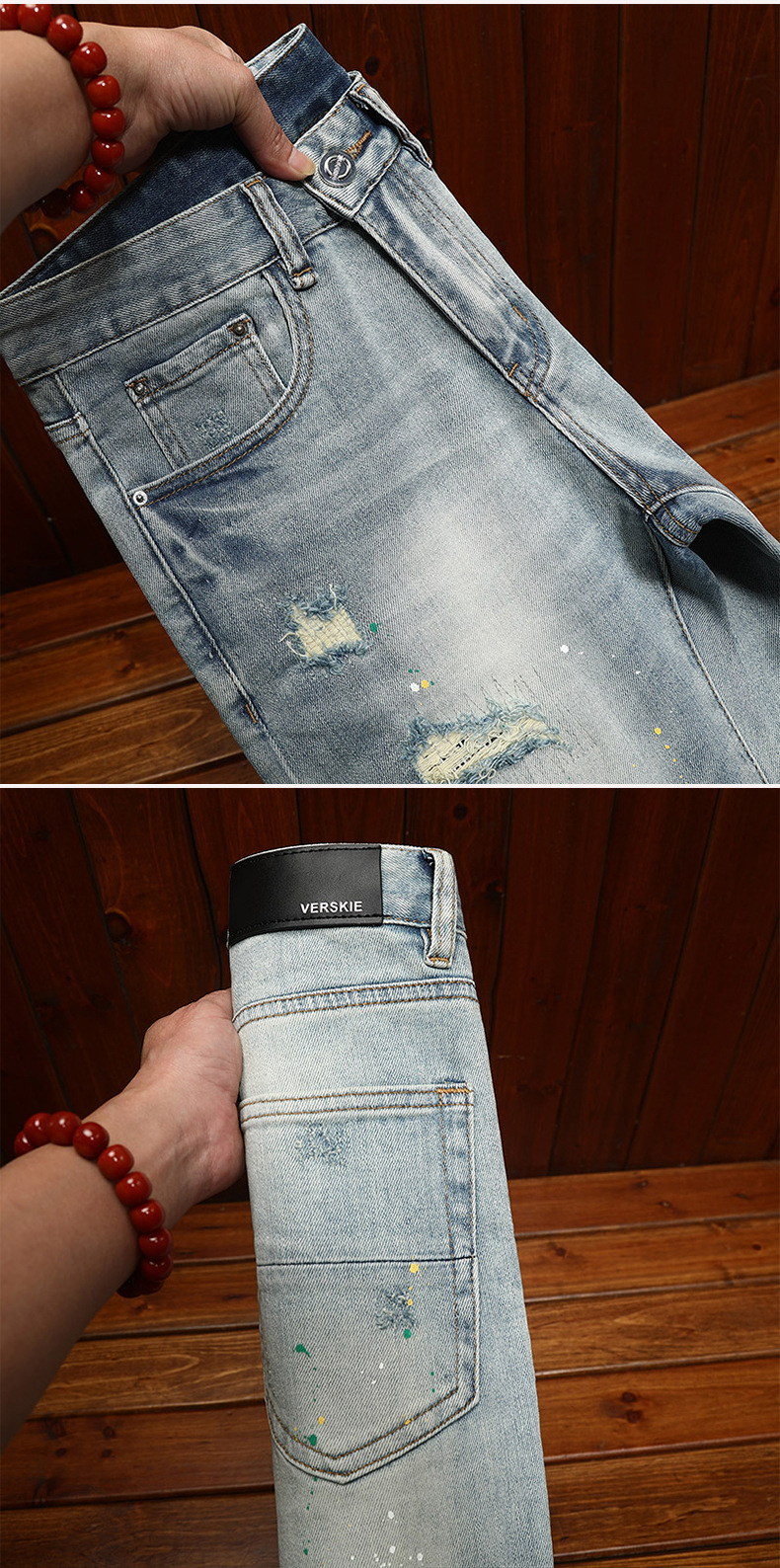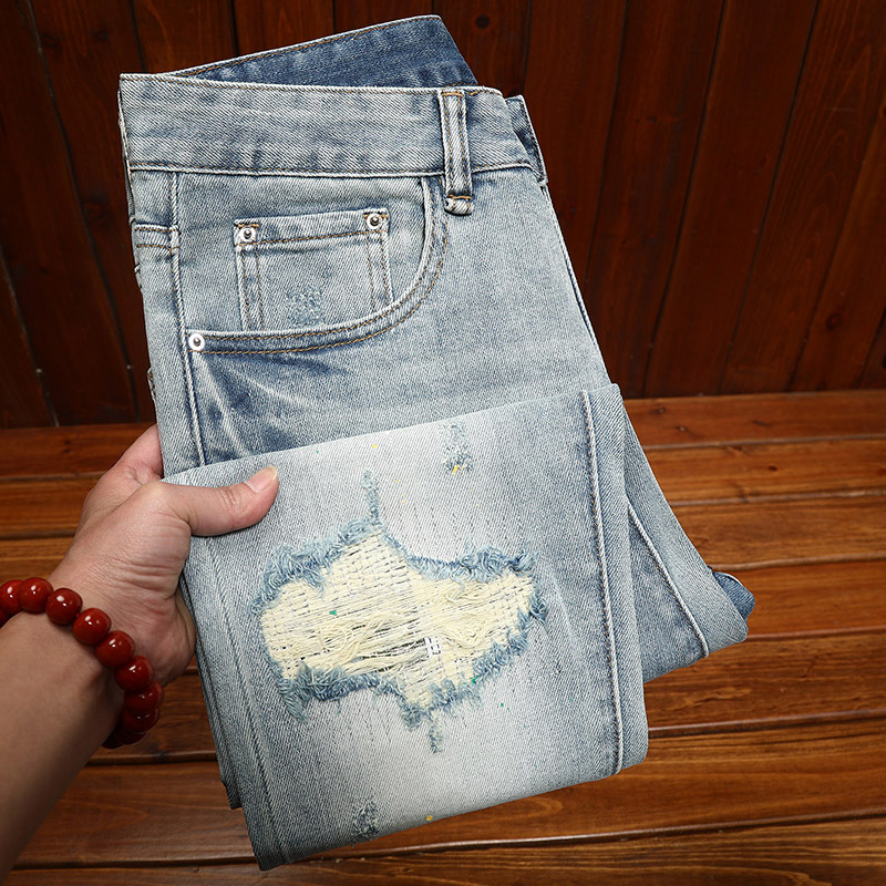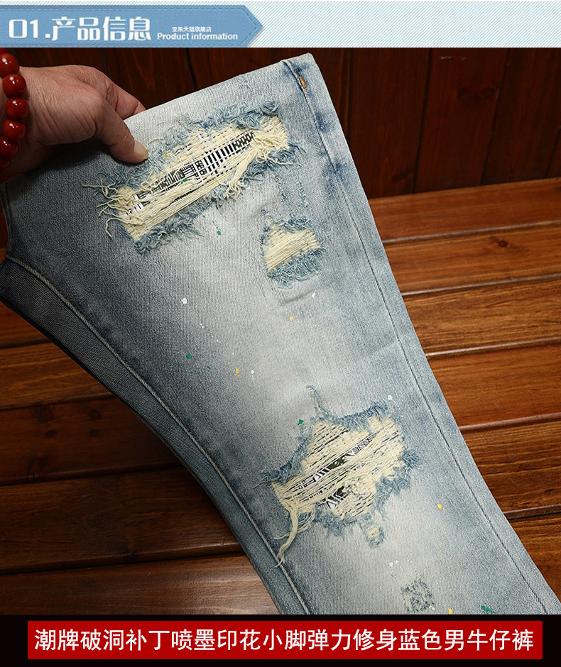 하이 엔드 유럽 청바지 남성용 찢어진 패치 슬림 핏 스트레치 잉크젯 그래피티 트렌디 캐주얼 롱 팬츠스토어 가기
