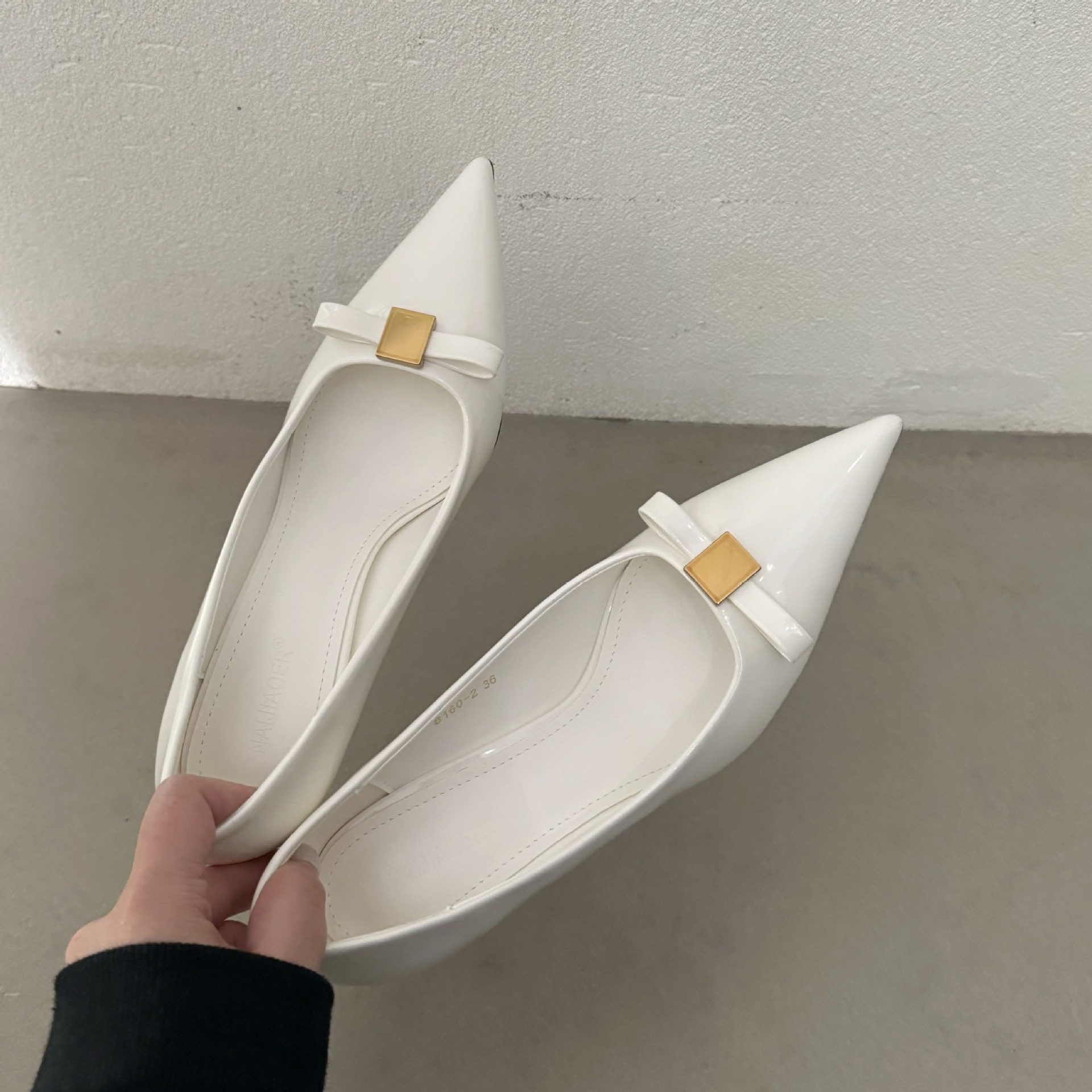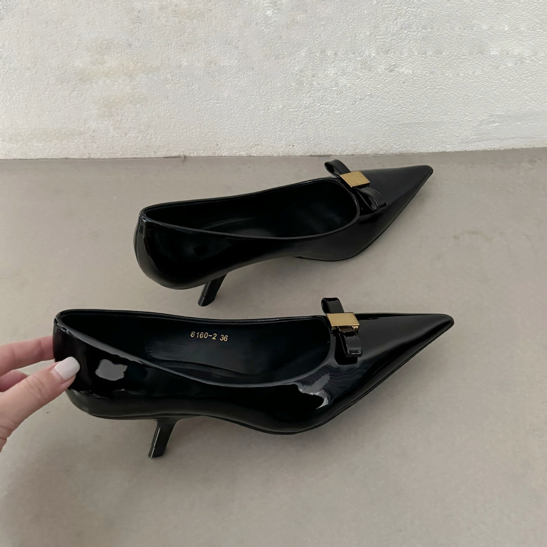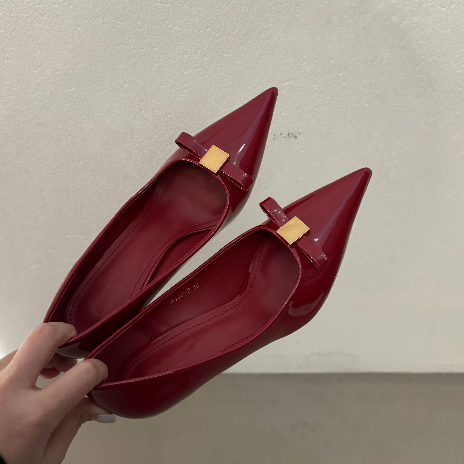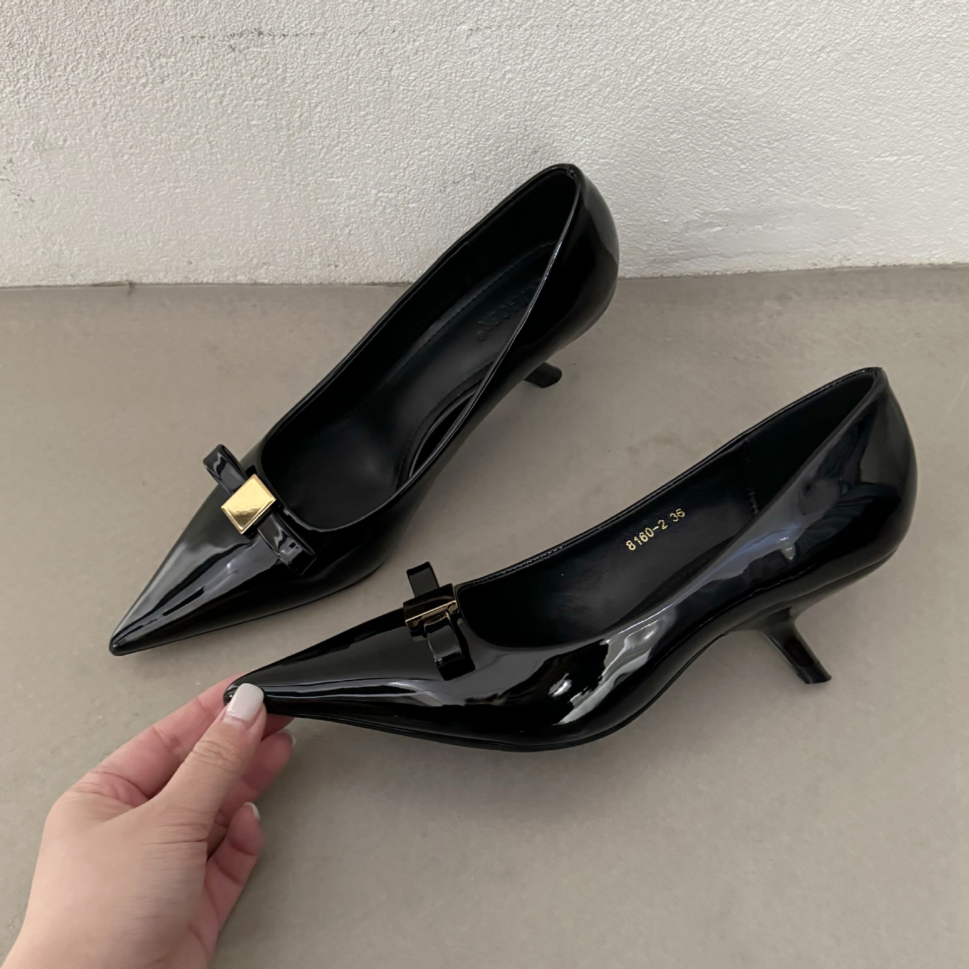 뾰족한 굽 신발 여성 2025 년 봄 새로운 도착 특허 가죽 유행 뾰족한 입 나비 다이아몬드 우아한 중간 굽 신발스토어 가기