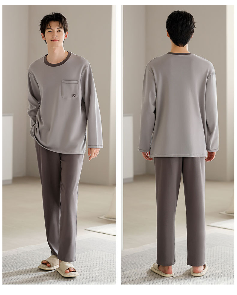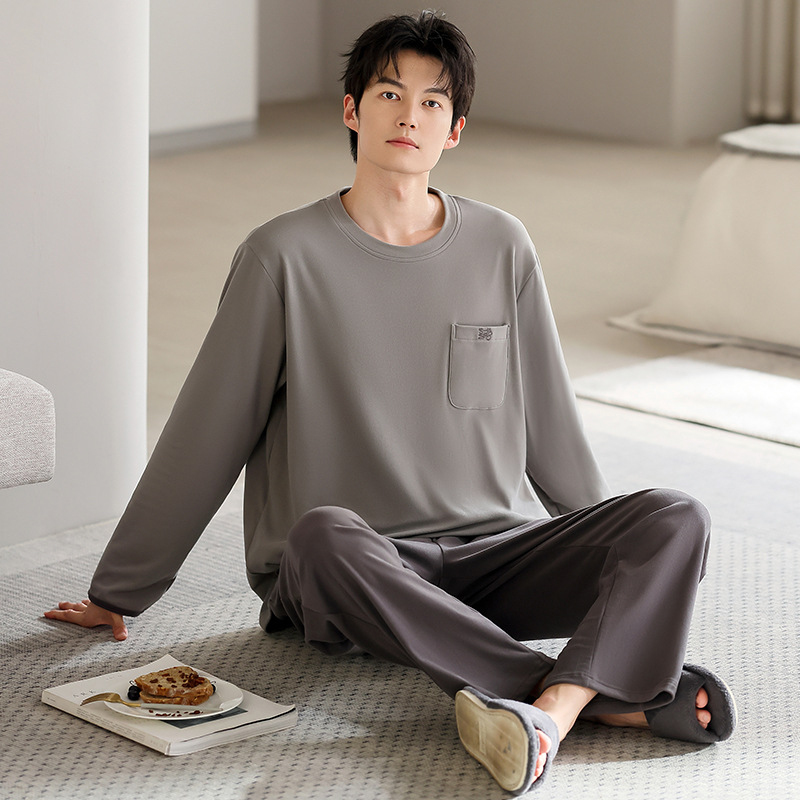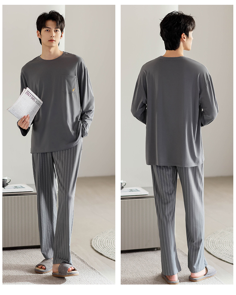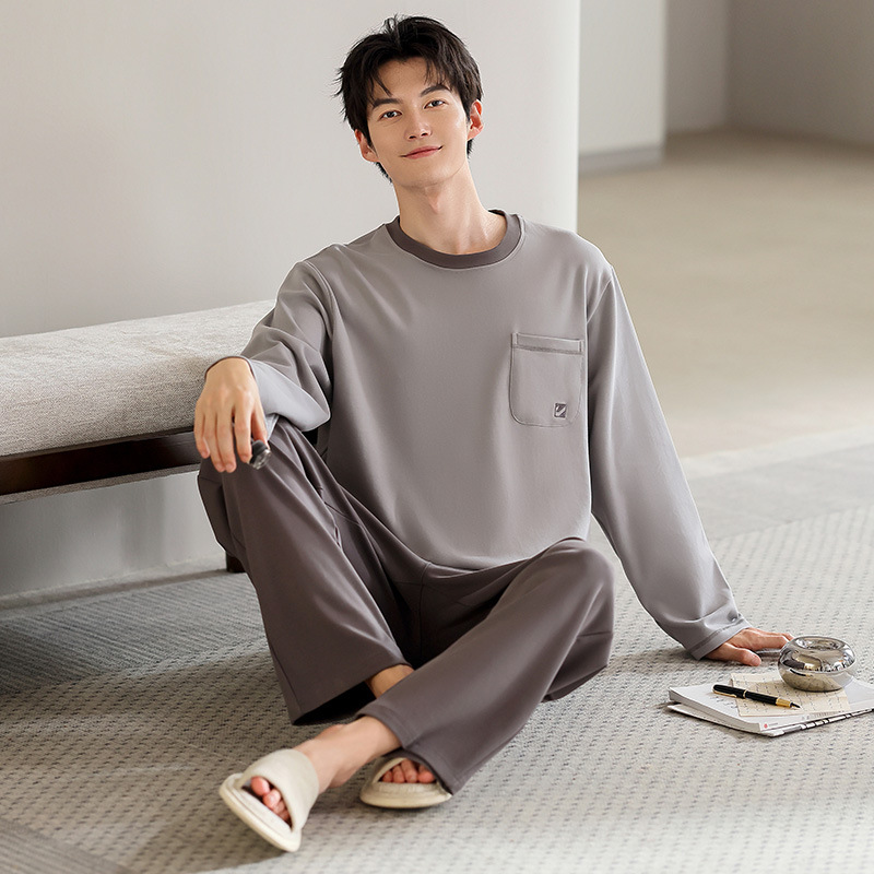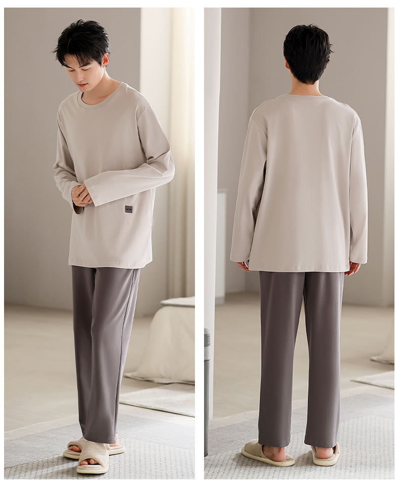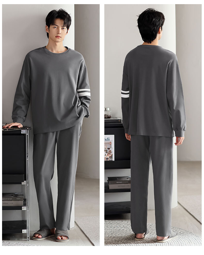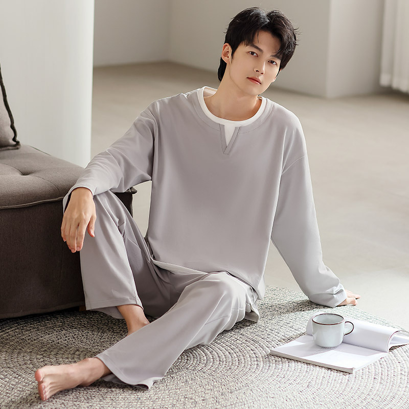 남성용 도매 잠옷, 여름용 긴팔 라운드넥 풀오버, 심플하고 캐주얼한 청소년용 얇은 홈웨어 세트, 외출복으로도 착용 가능스토어 가기