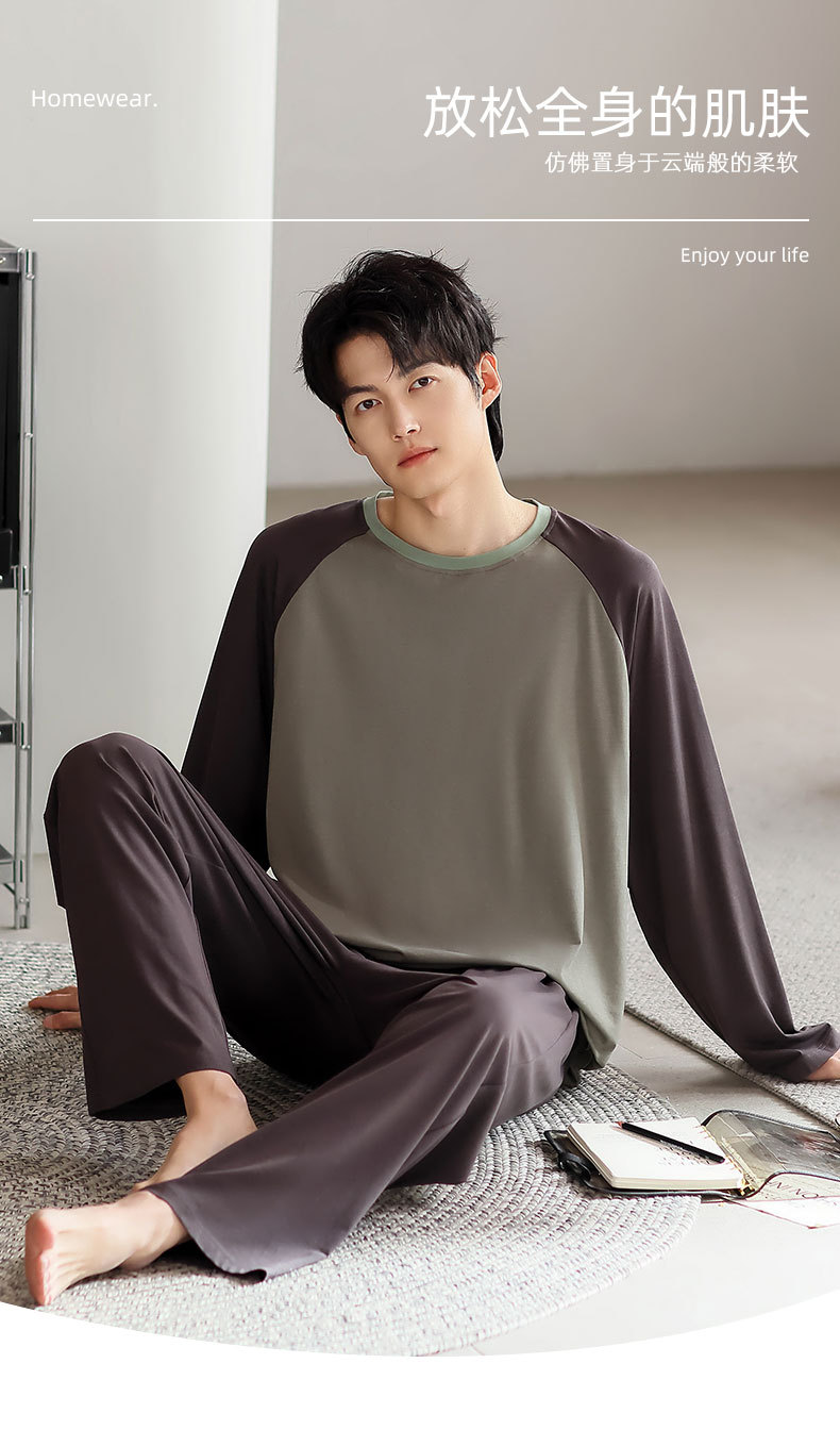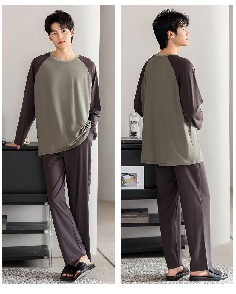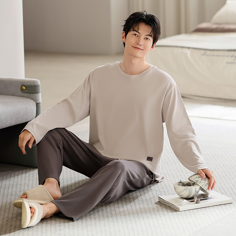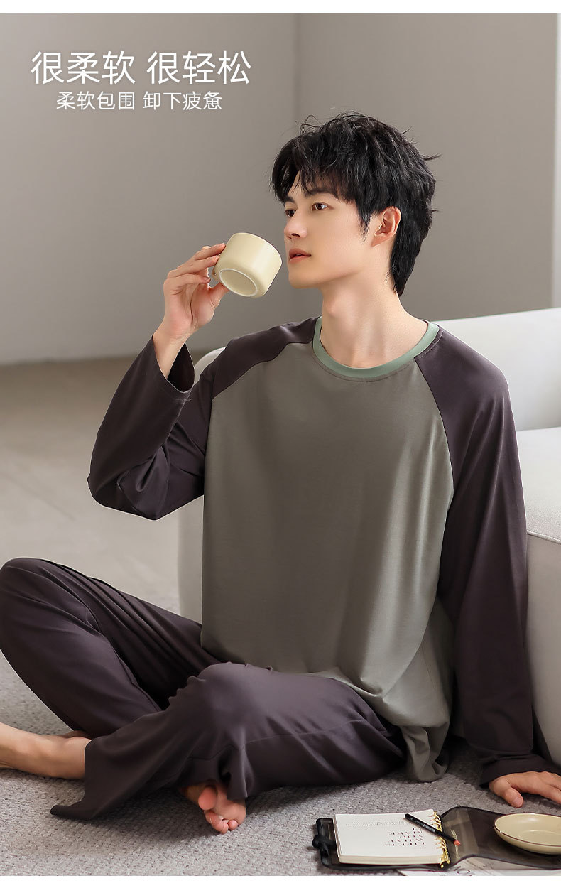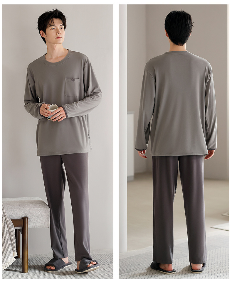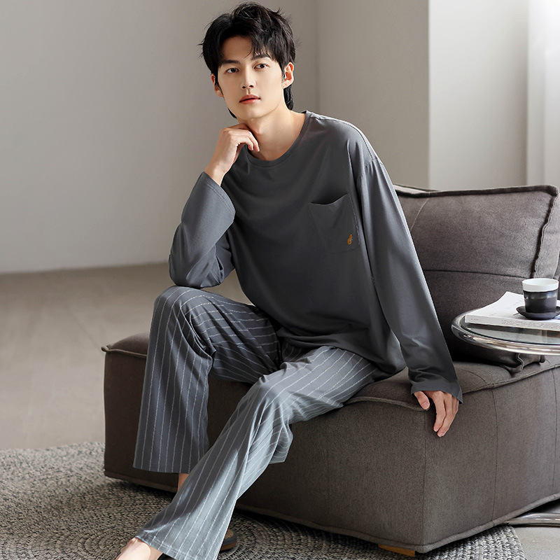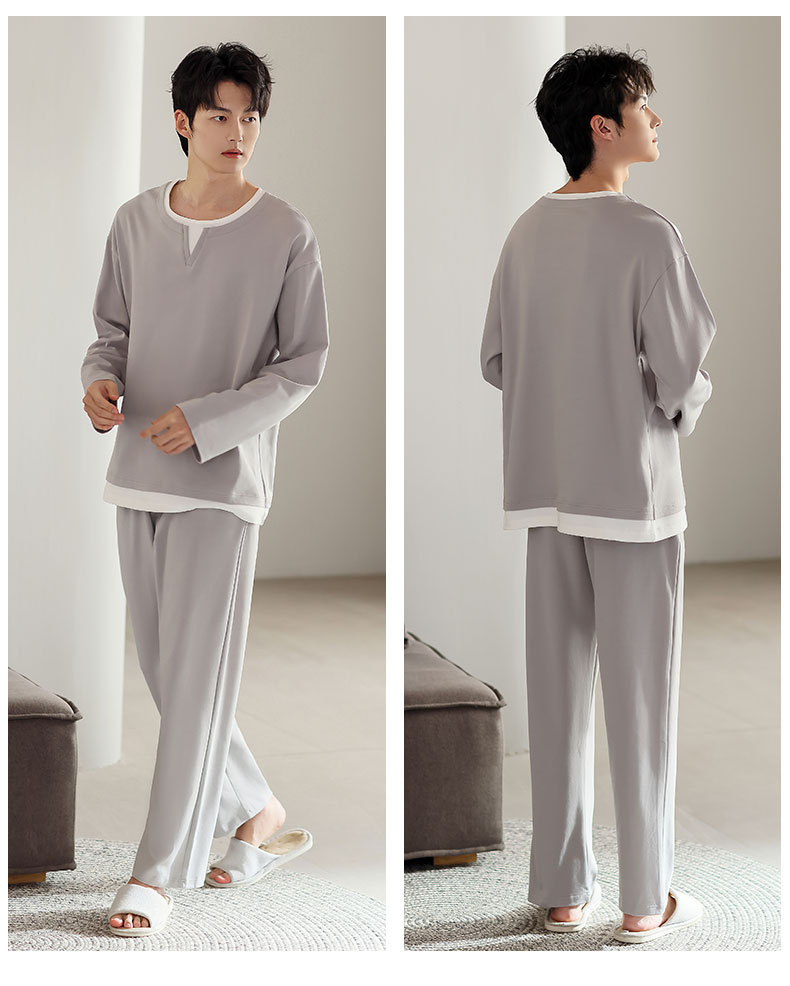 남성용 도매 잠옷, 여름용 긴팔 라운드넥 풀오버, 심플하고 캐주얼한 청소년용 얇은 홈웨어 세트, 외출복으로도 착용 가능스토어 가기