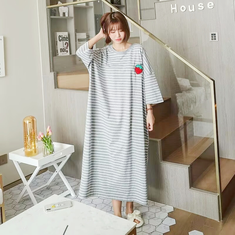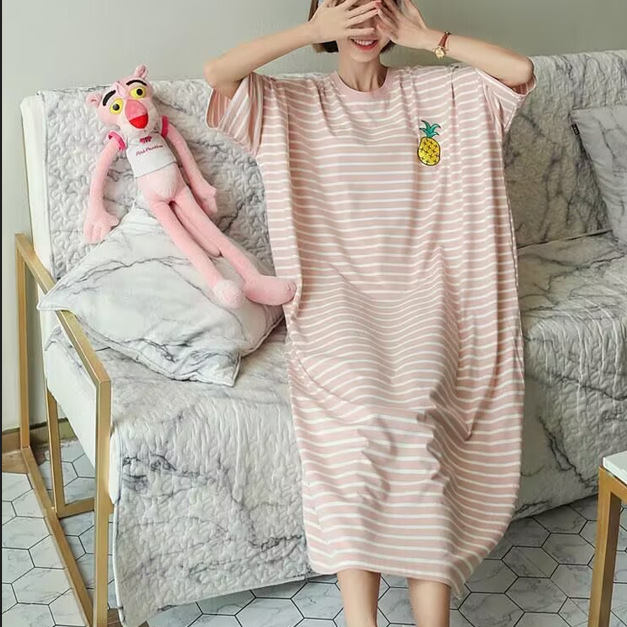 파자마 여성 여름 한국식 중견 학생 나이트드레스 반팔 느슨한 귀여운 줄무늬 의상 임산부 홈 옷스토어 가기