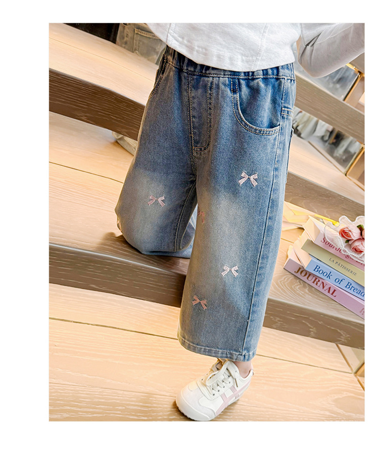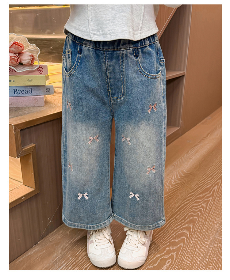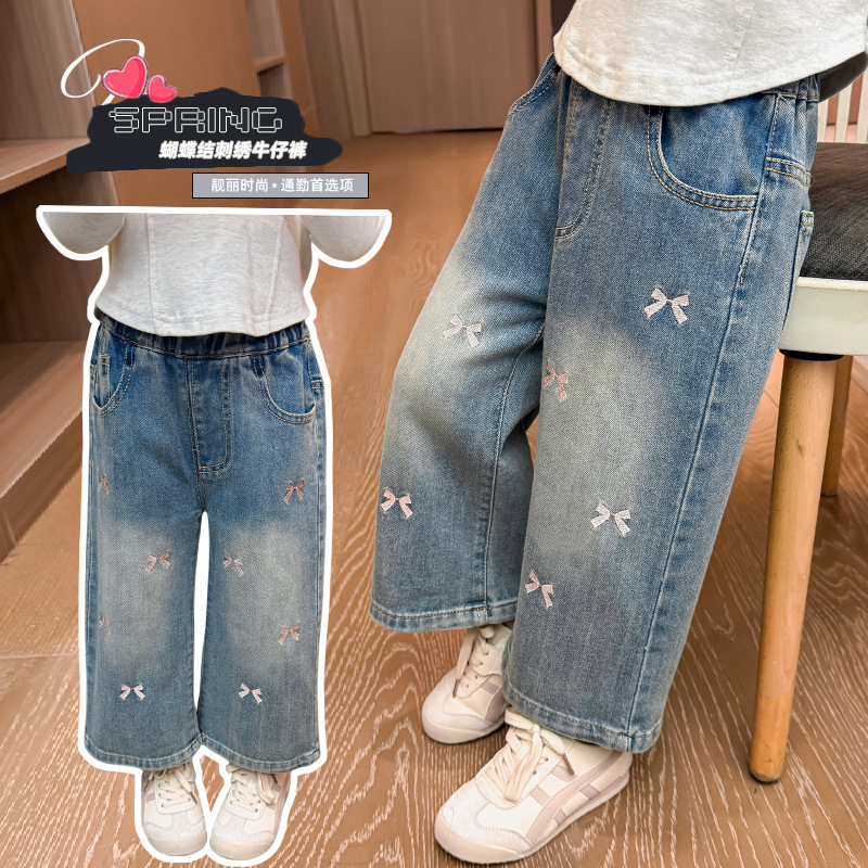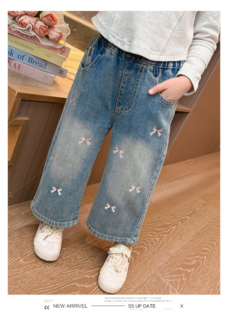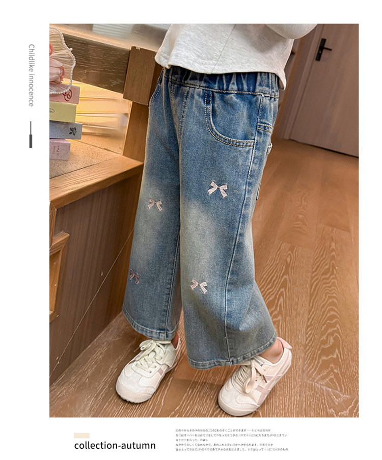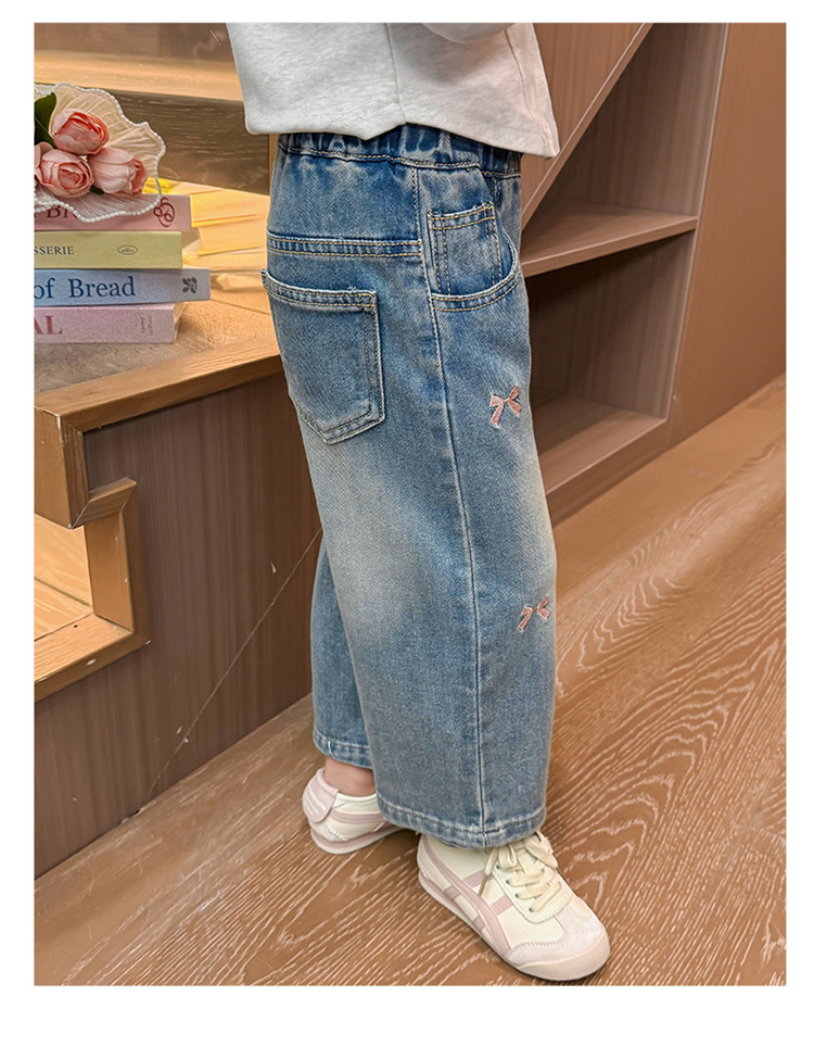 여아 자수 리본 데님 팬츠 봄 가을 아동 한국 스타일 여자아이 캐주얼 스트레이트 팬츠 유아동 긴바지스토어 가기