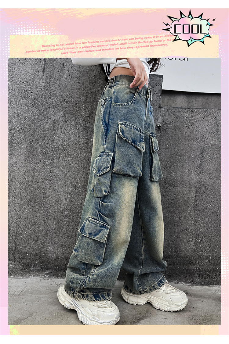 소녀 청바지 크레인 바지 2025 가을 새로운 패션 쿨 세련된 스트리트 댄스 바지 큰 어린이 유행 스트레이트 바지스토어 가기