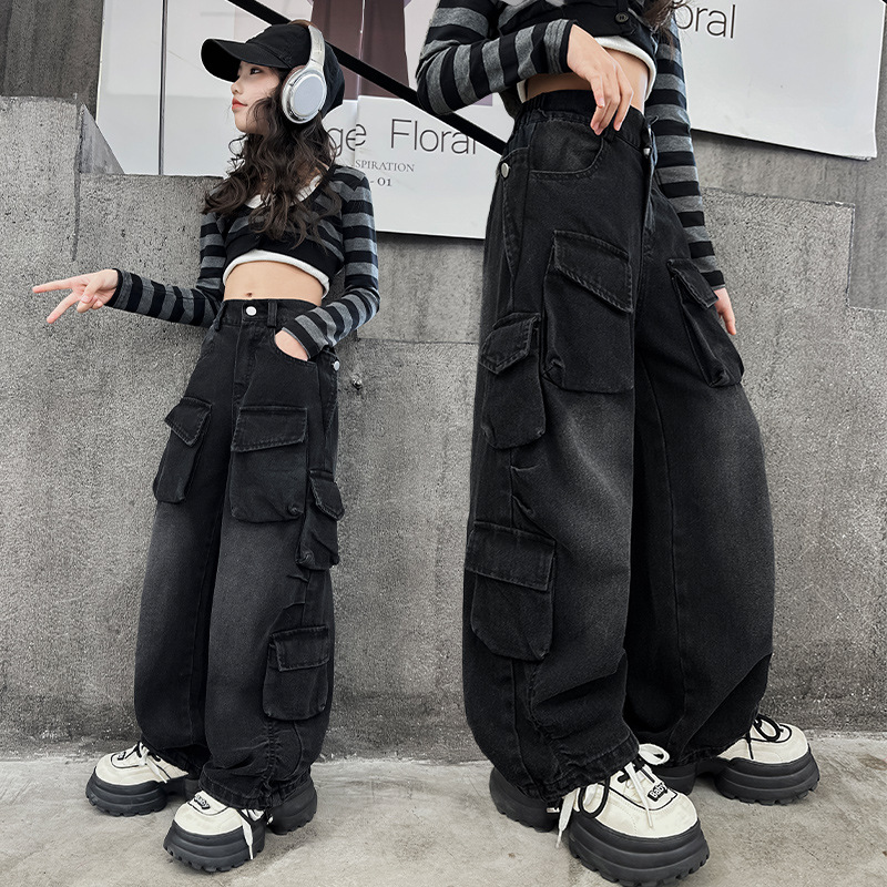 소녀 청바지 크레인 바지 2025 가을 새로운 패션 쿨 세련된 스트리트 댄스 바지 큰 어린이 유행 스트레이트 바지