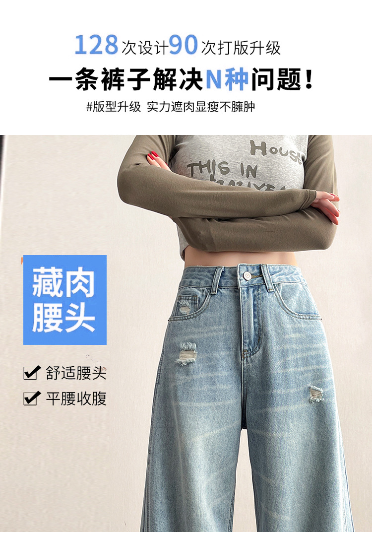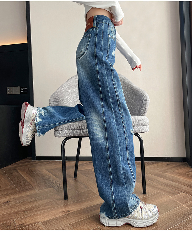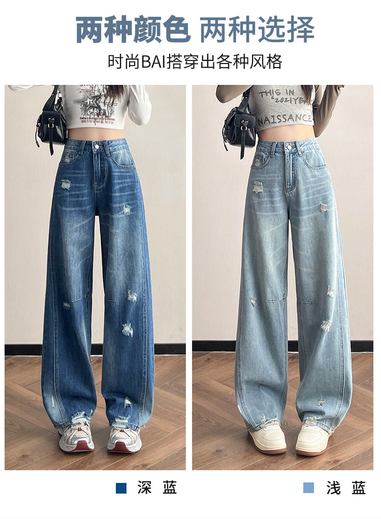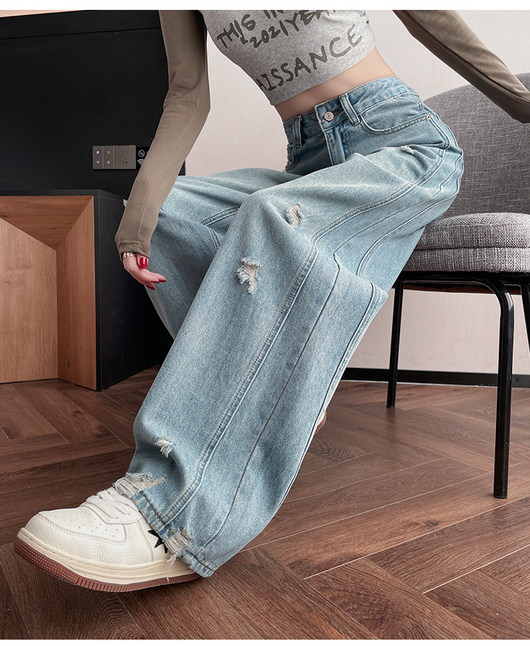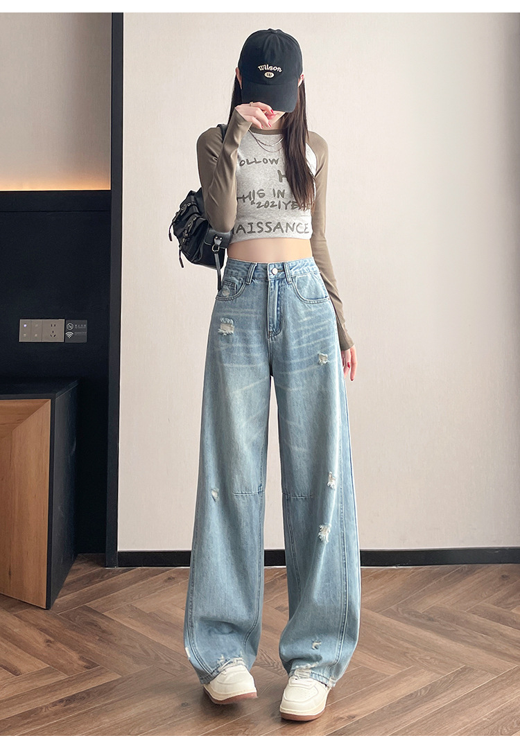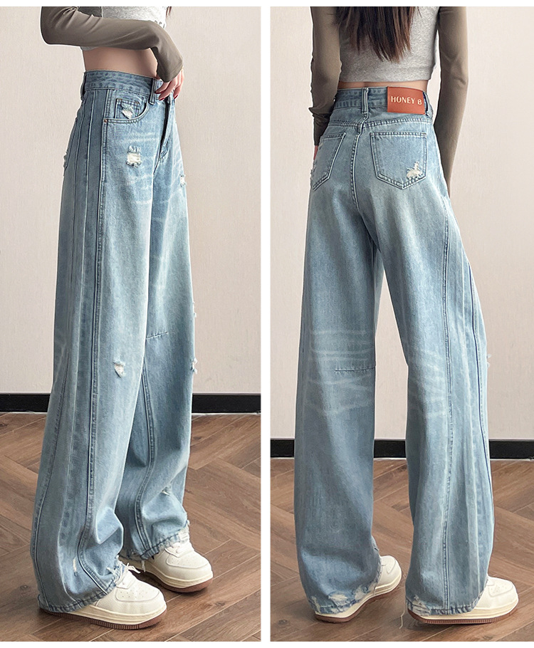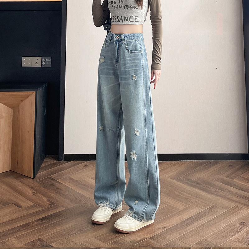 라이트 블루 찢어진 넓은 다리 청바지 여성의 봄 2025 새로운 높은 허리 슬리밍 느슨한 스트레이트 시미 터 바지스토어 가기