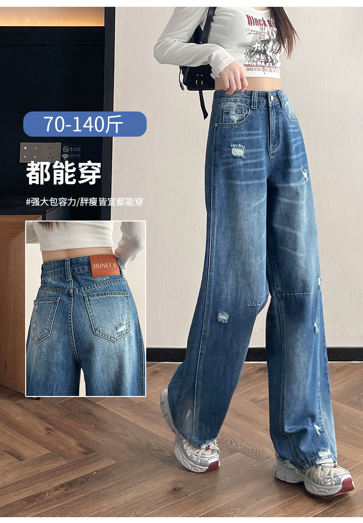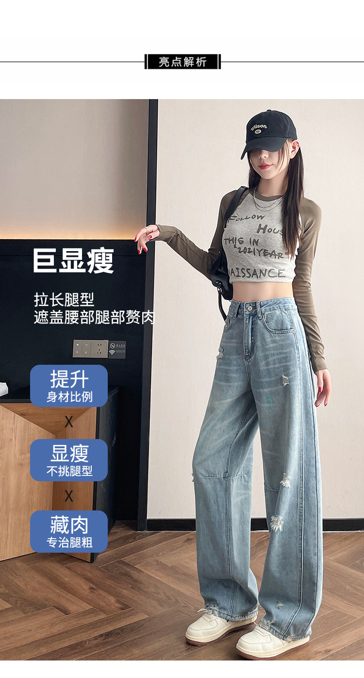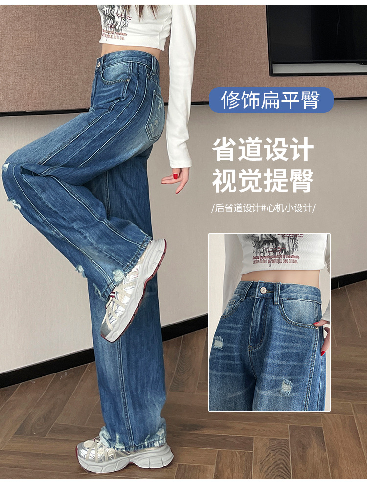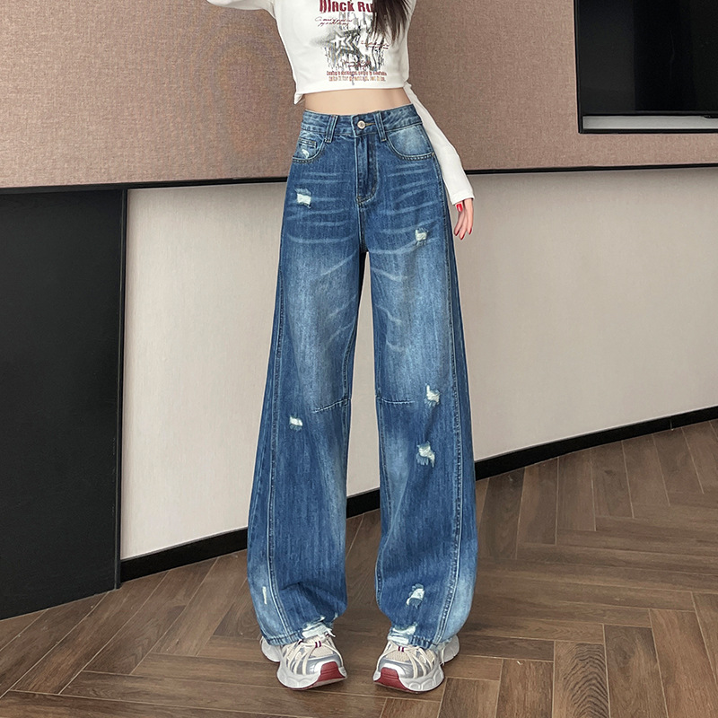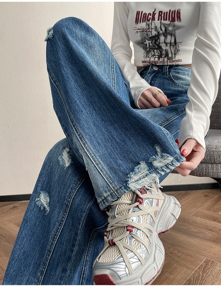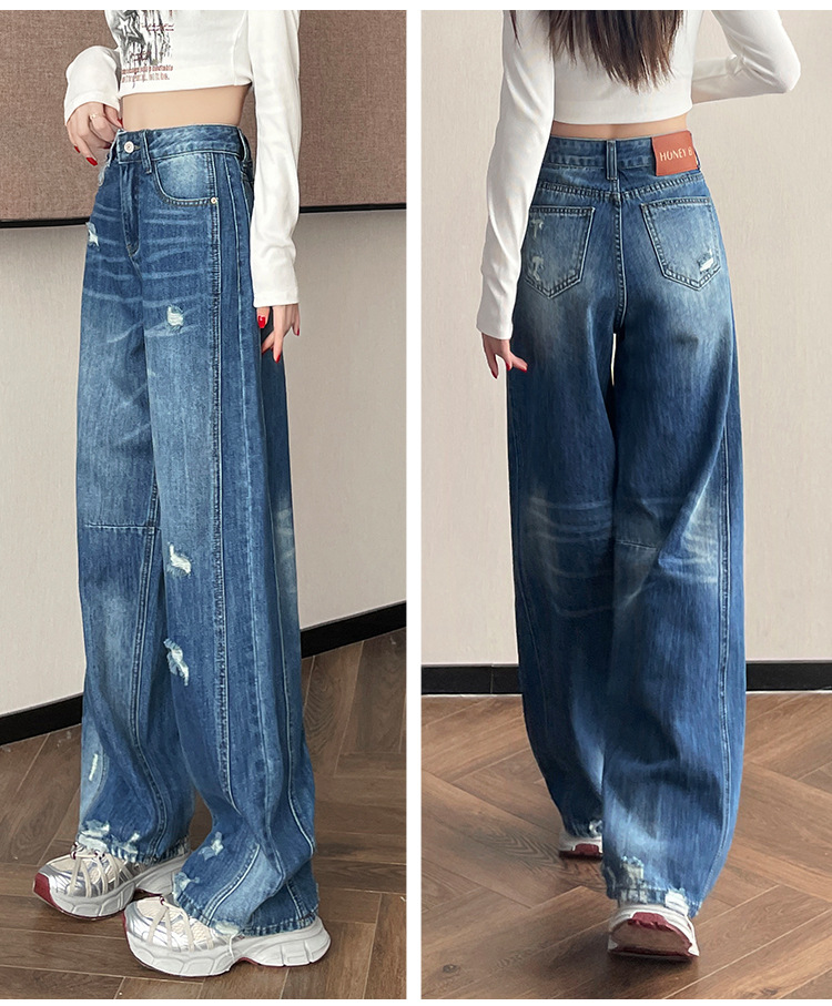 라이트 블루 찢어진 넓은 다리 청바지 여성의 봄 2025 새로운 높은 허리 슬리밍 느슨한 스트레이트 시미 터 바지스토어 가기