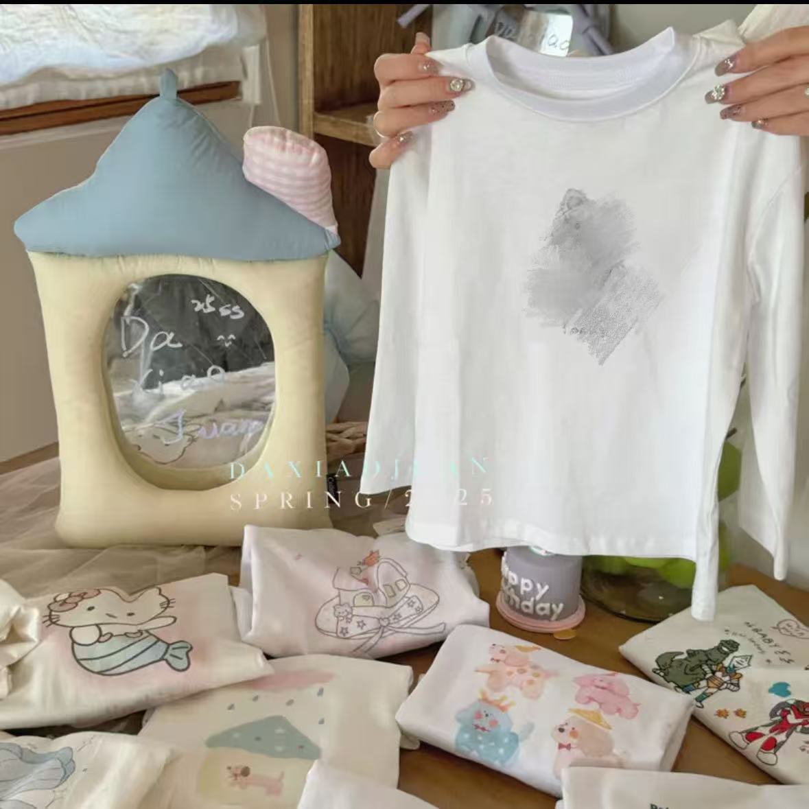 스팟 사이즈 롤 25 봄, 가을 어린이 한국어 만화 탑 아동복 남성과 여성을위한 긴팔 바닥 티셔츠스토어 가기