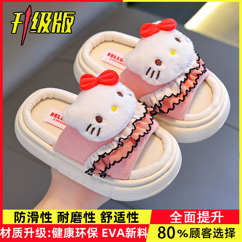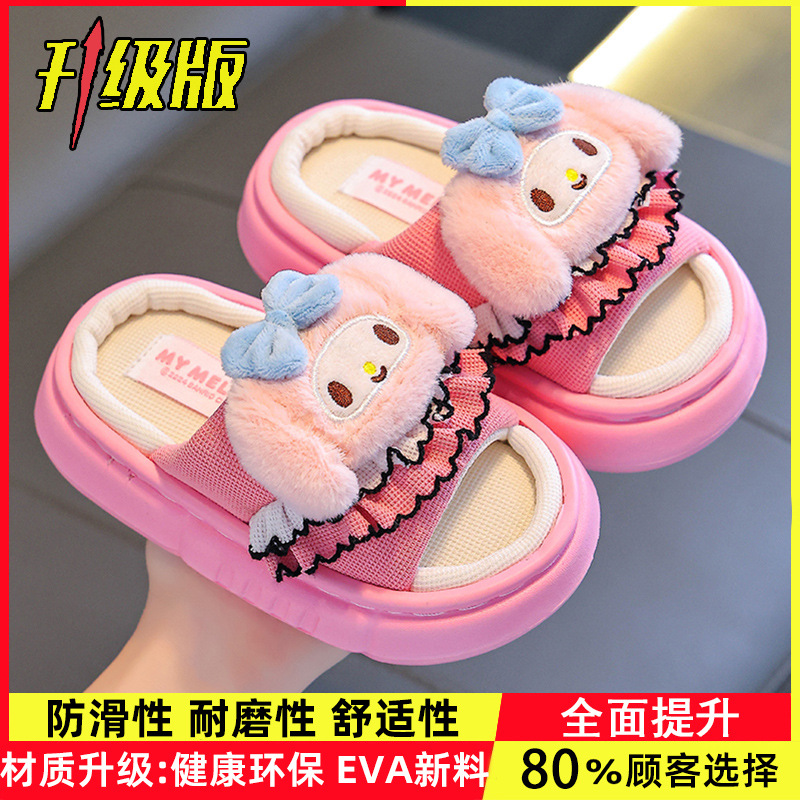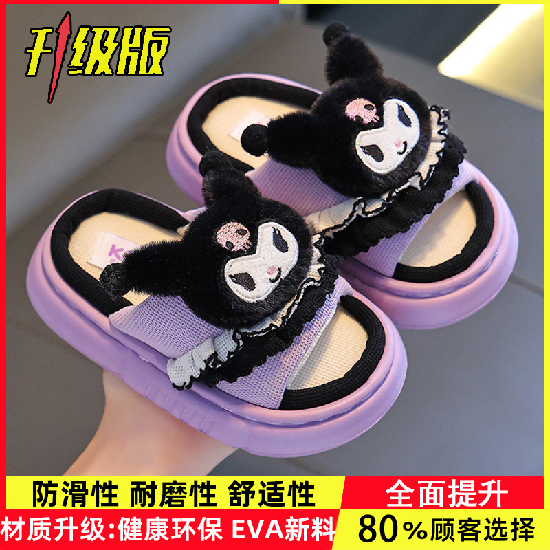 산리오 봄 가을 어린이 린넨 슬리퍼 남녀 아동 쿠로미 부모 자식 통기성 면 린넨 실내 어린이 바닥 슬리퍼