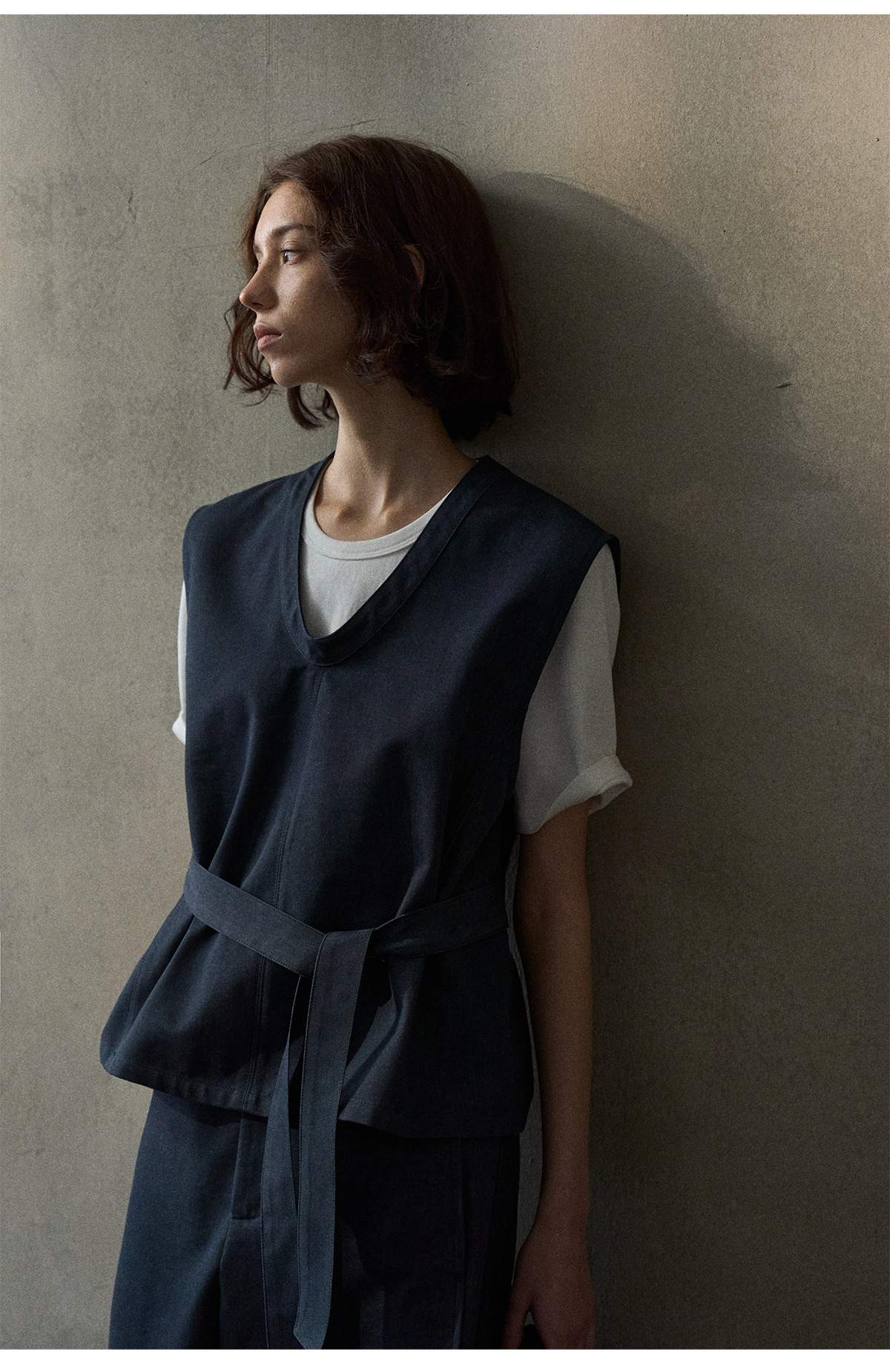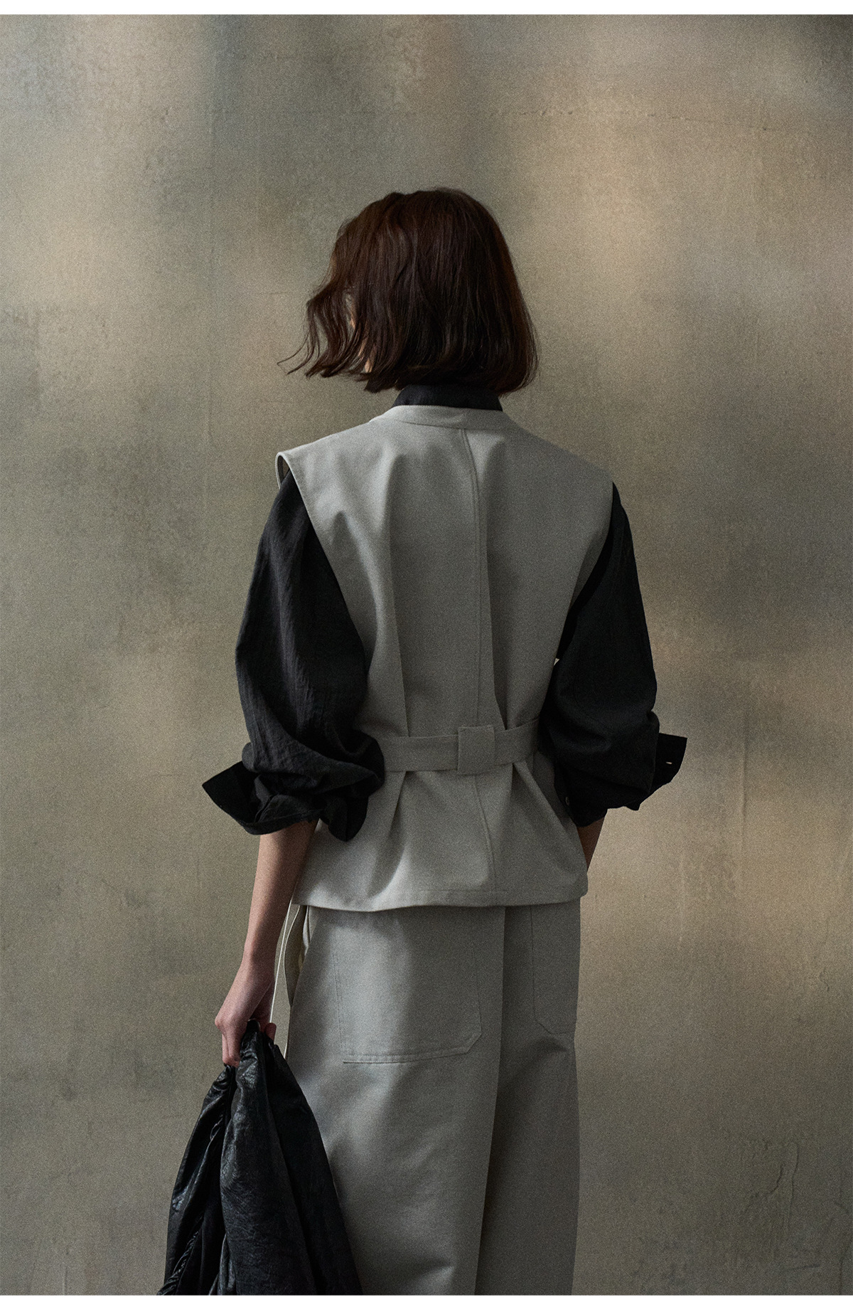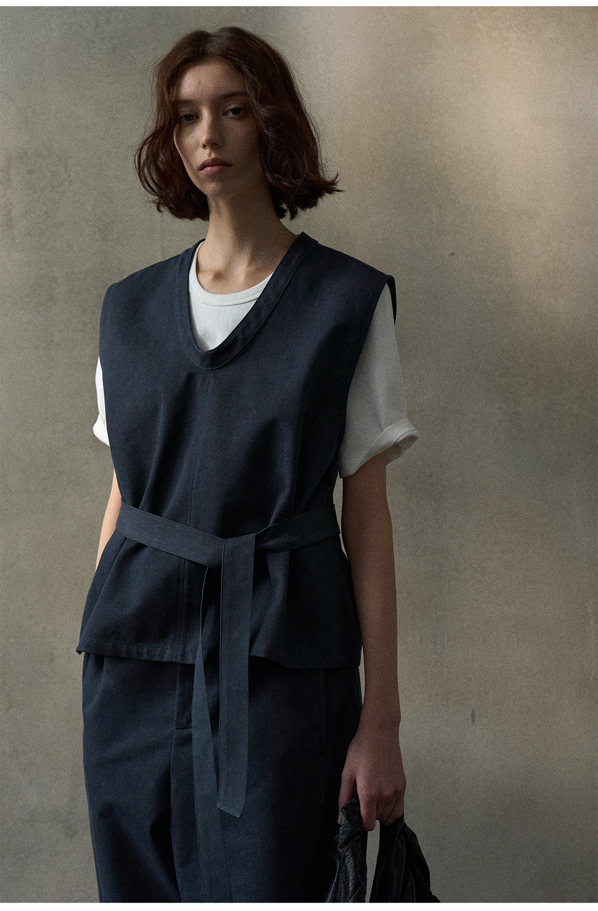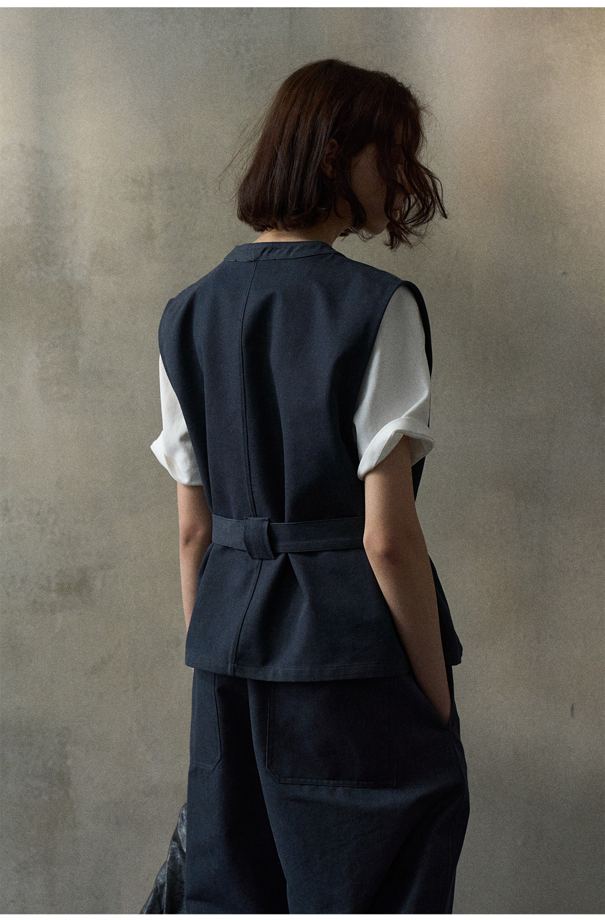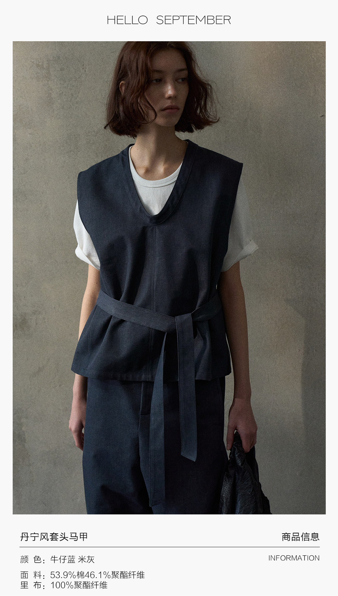 【識幾】데님 스타일 풀오버 조끼 봄 신상 심플 출퇴근용 끈 V넥 탑 여성용 M8374