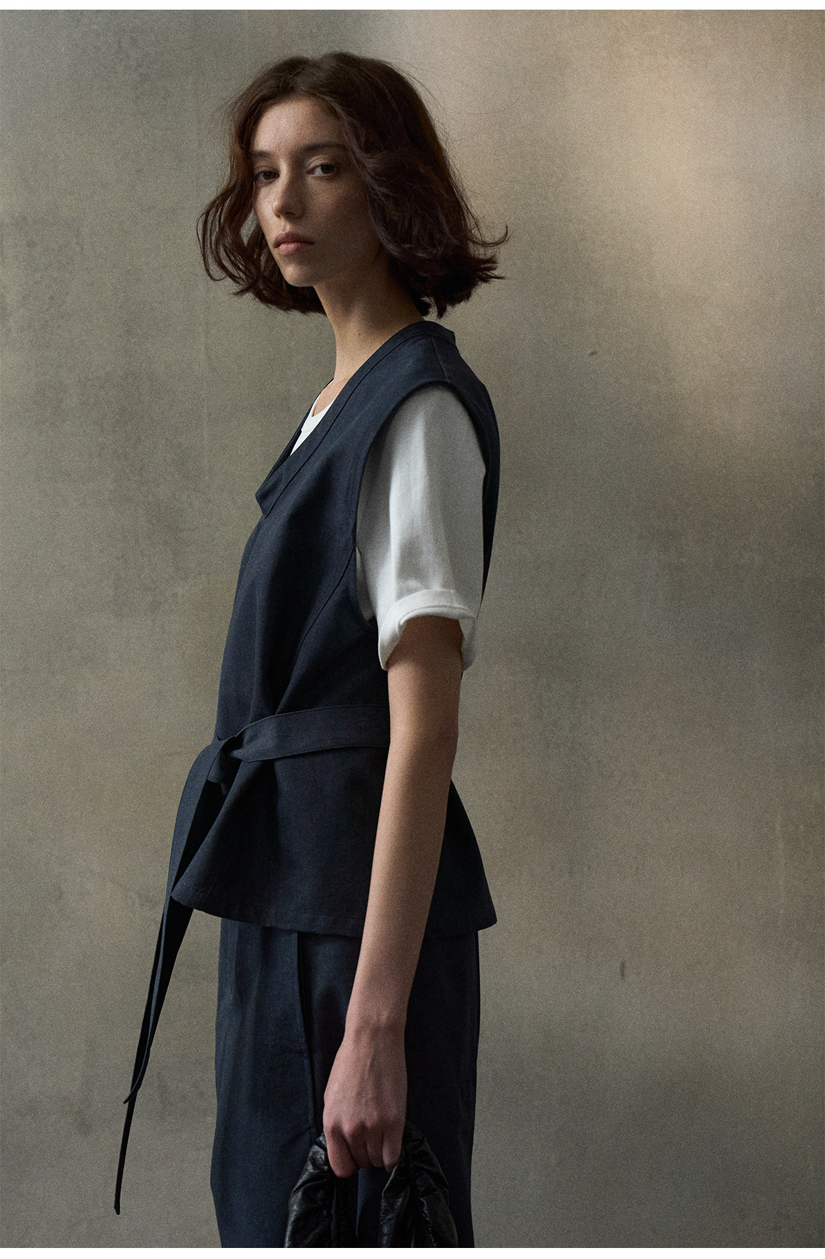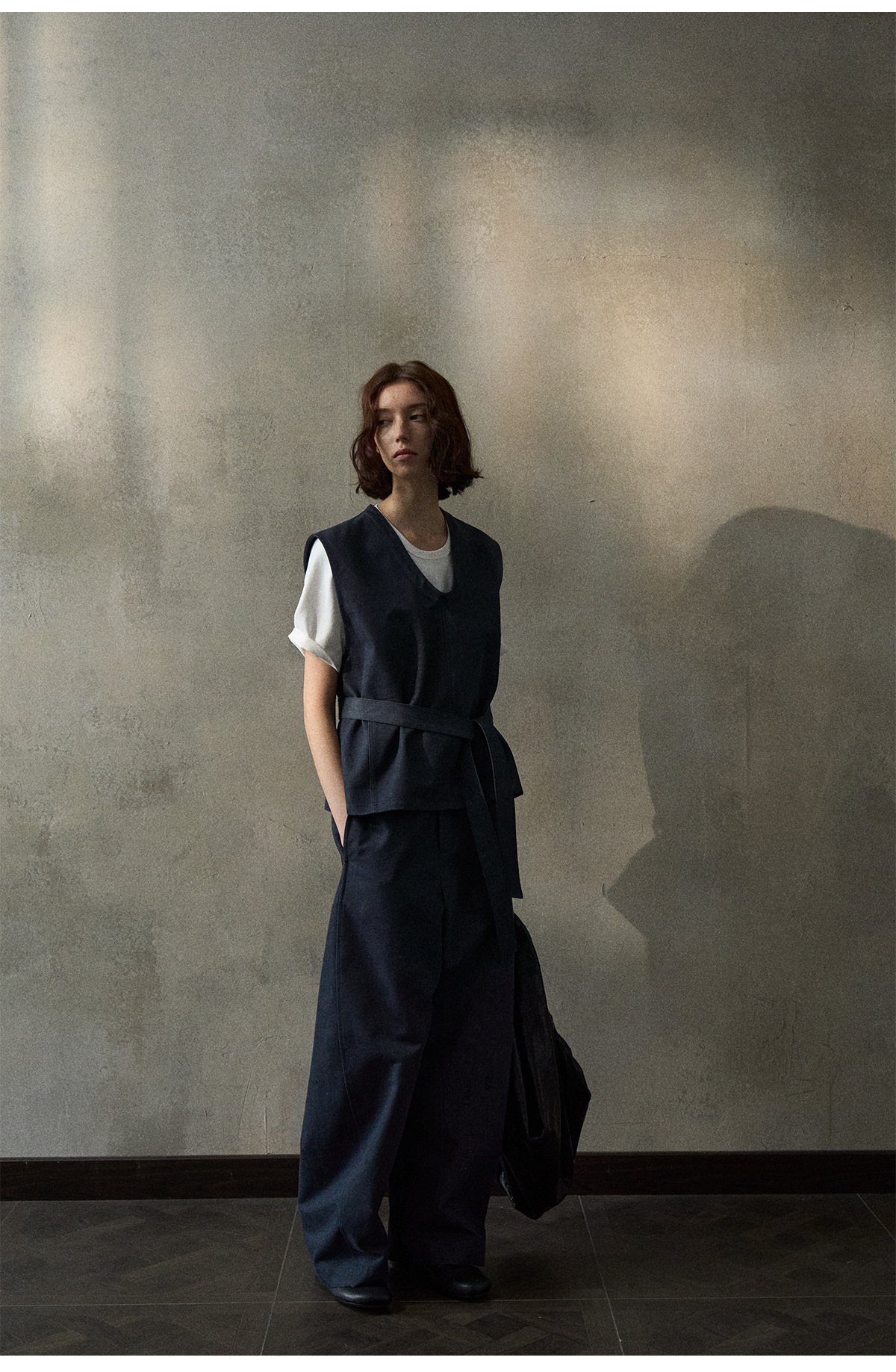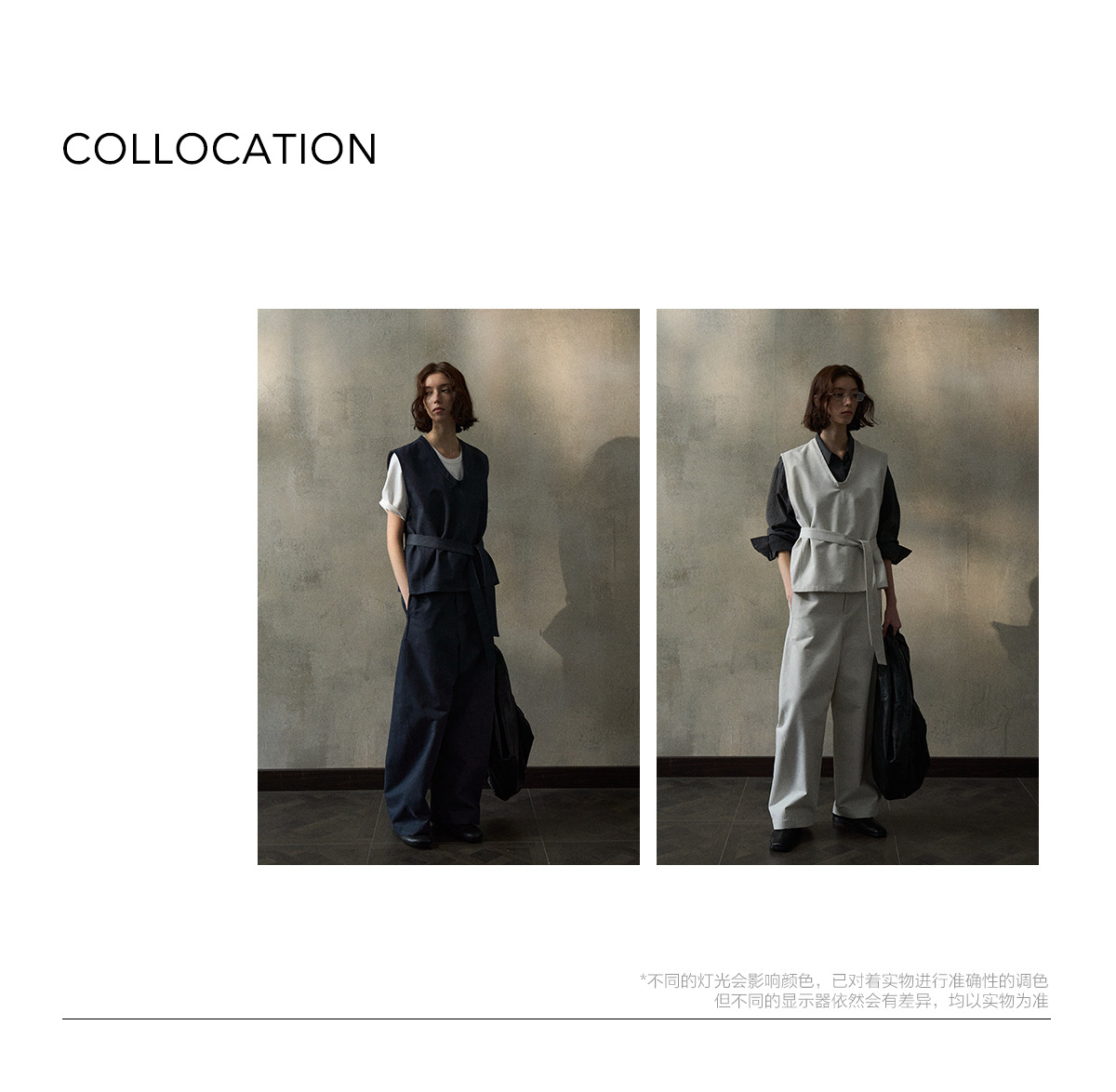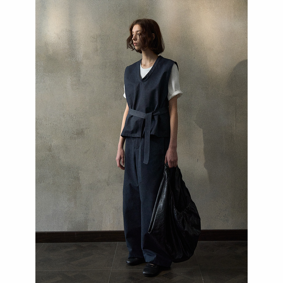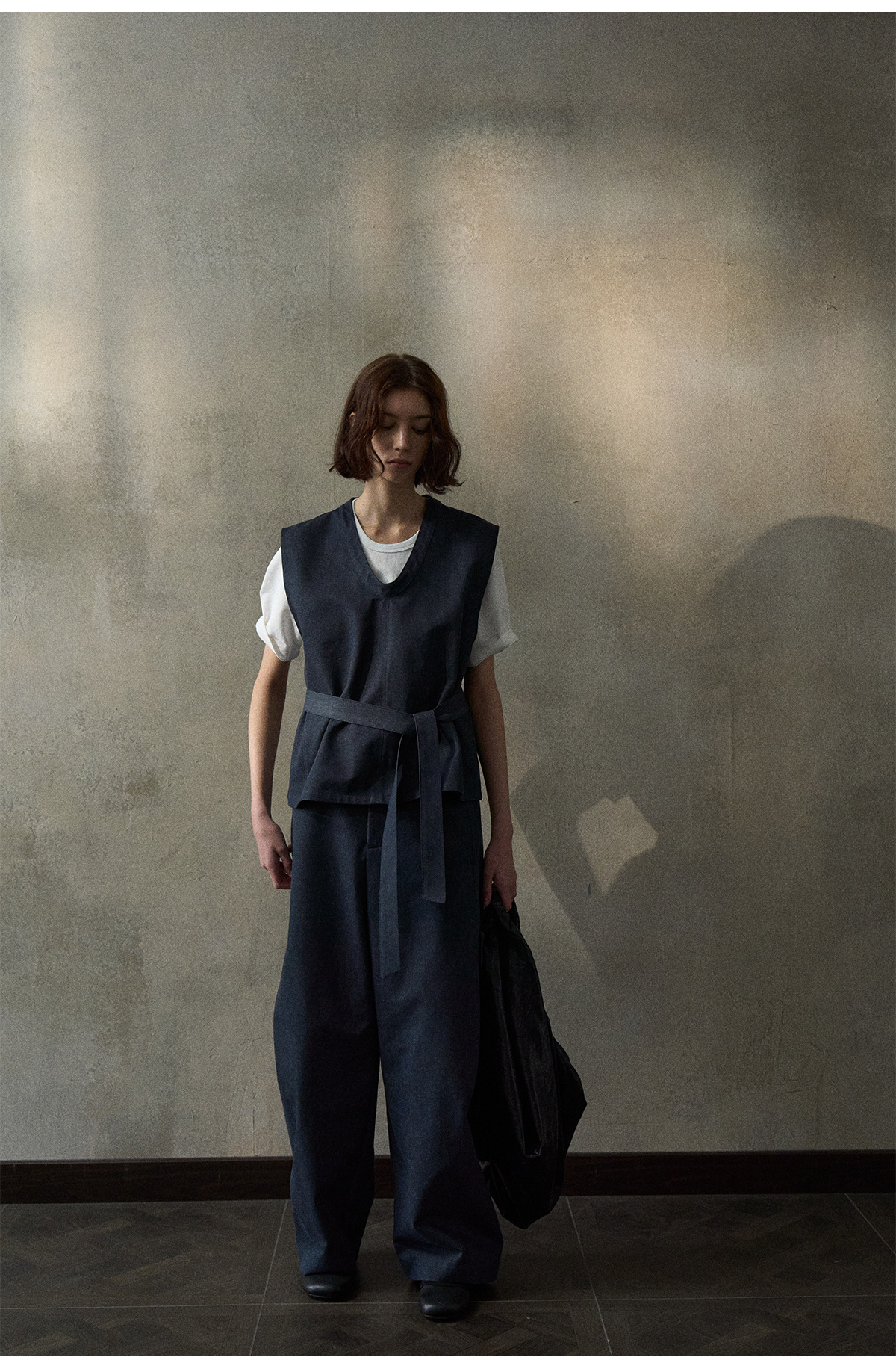 【識幾】데님 스타일 풀오버 조끼 봄 신상 심플 출퇴근용 끈 V넥 탑 여성용 M8374