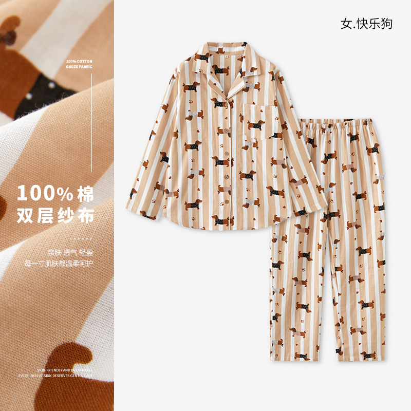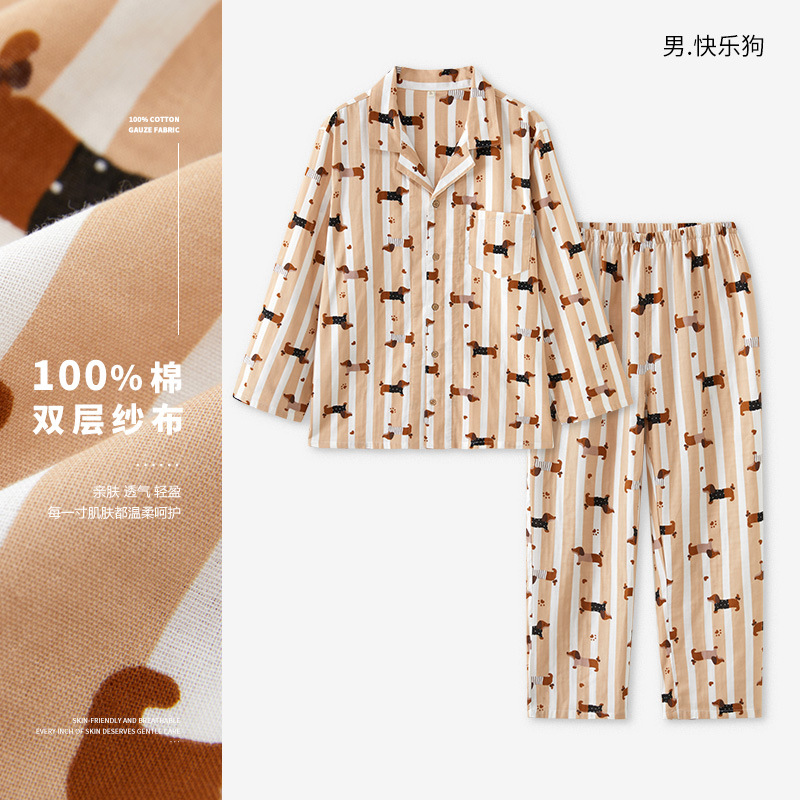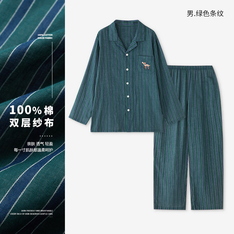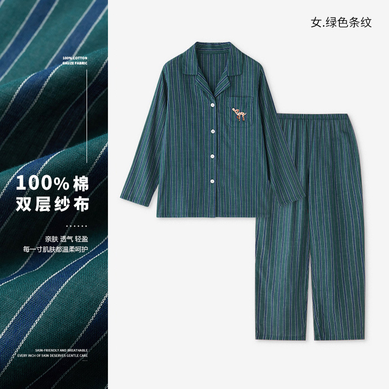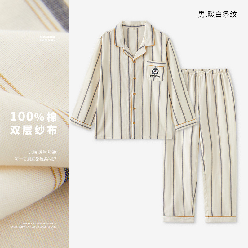 72/77-비스트 파자마 여성용 봄/가을 긴팔 커플 세트 순면 거즈 스트라이프 홈웨어 남성용스토어 가기