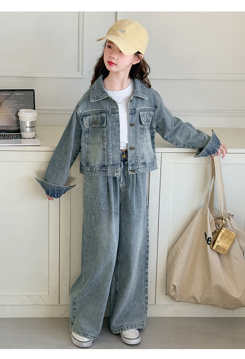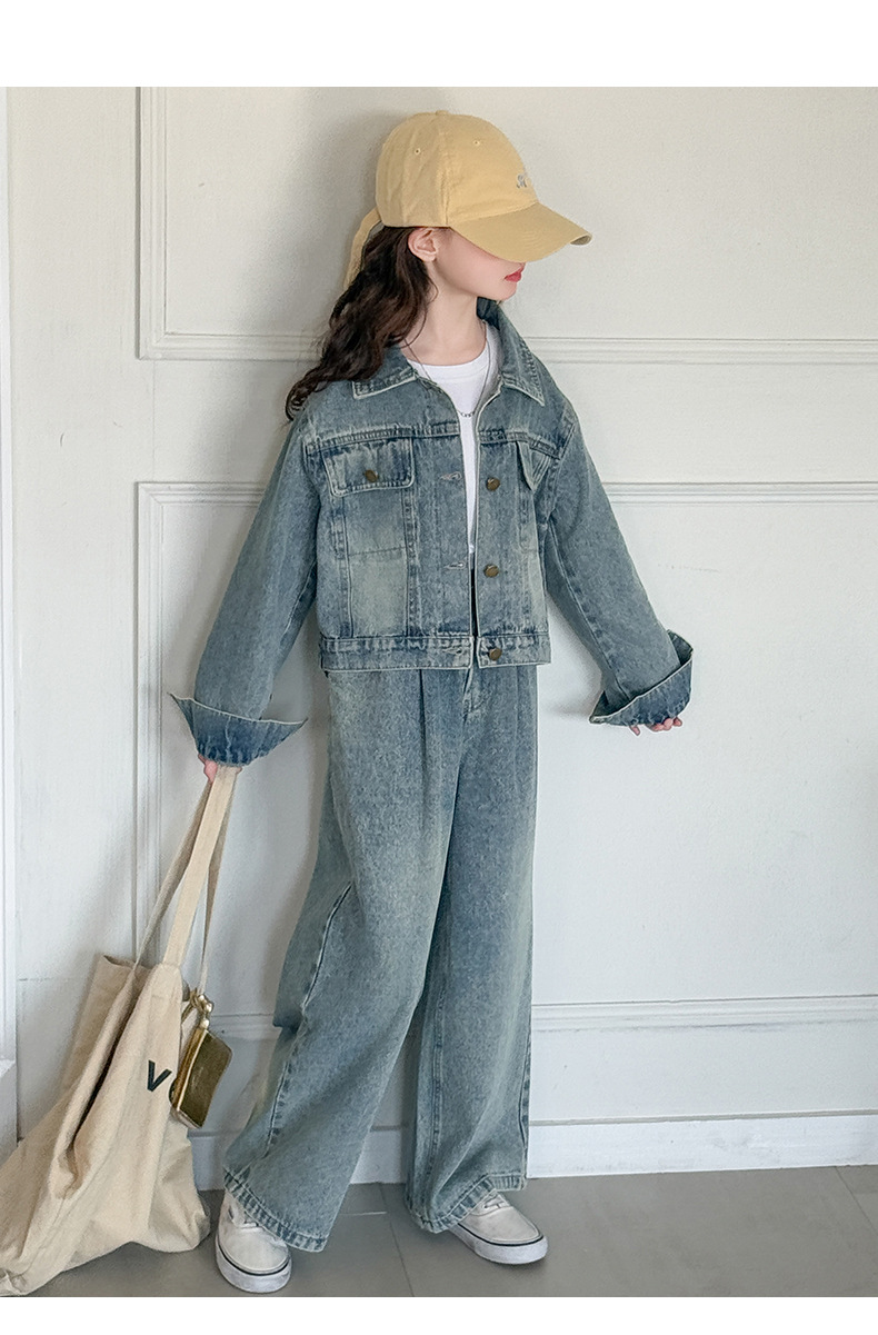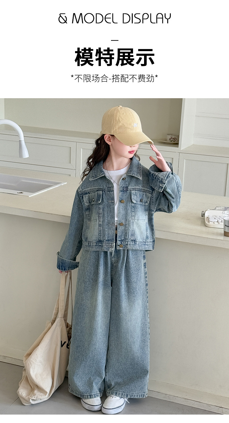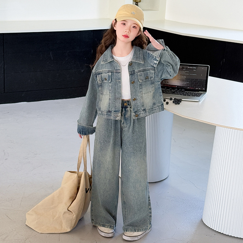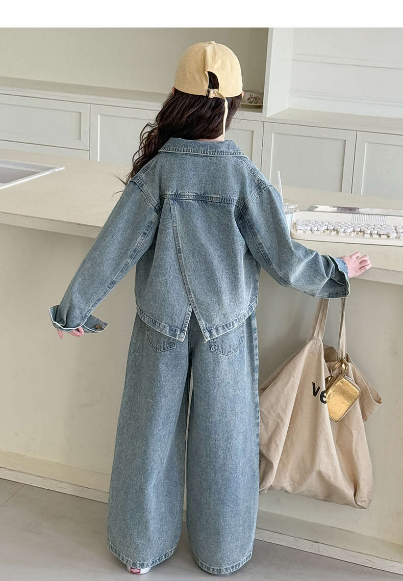 소녀 데님 세트 봄과 가을 2025 새로운 여자 한국 코트 어린이 봄 넓은 다리 바지 두 조각 세트
