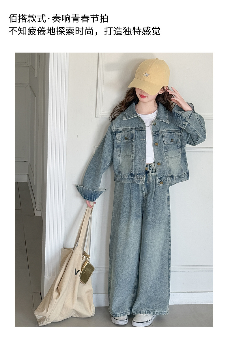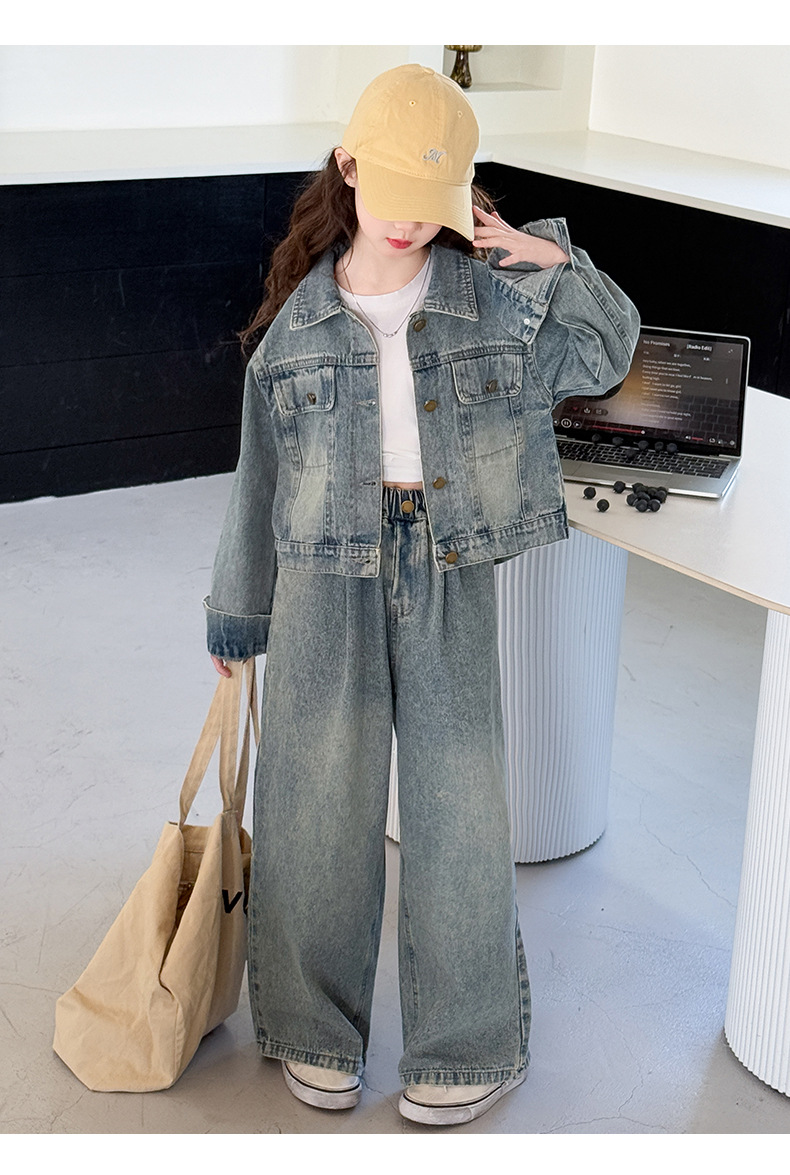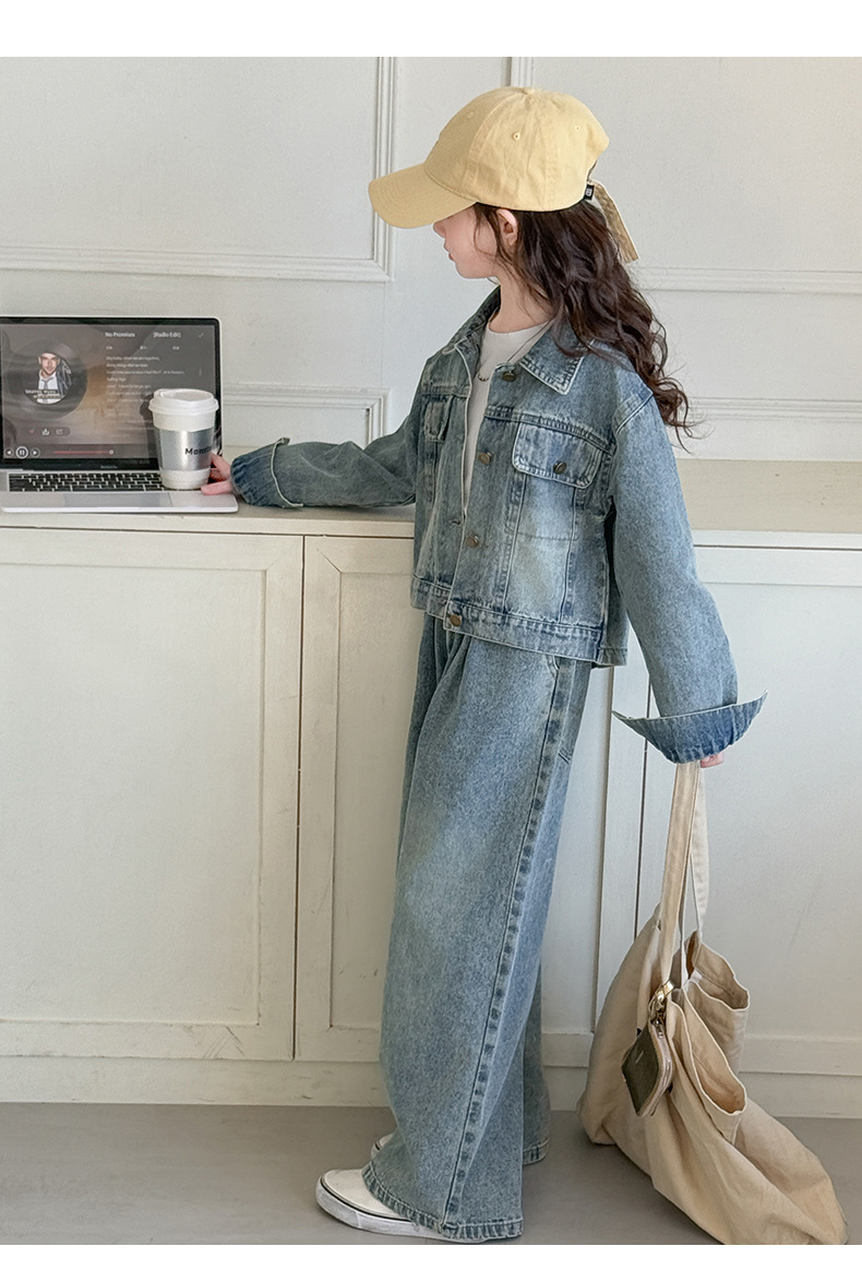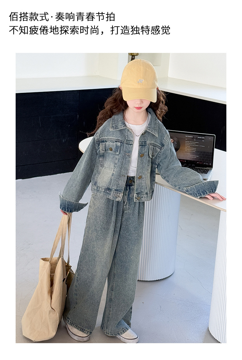소녀 데님 세트 봄과 가을 2025 새로운 여자 한국 코트 어린이 봄 넓은 다리 바지 두 조각 세트