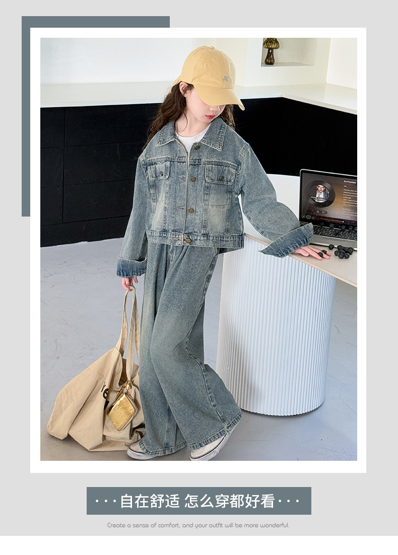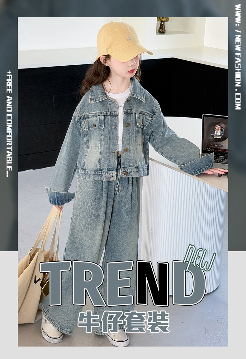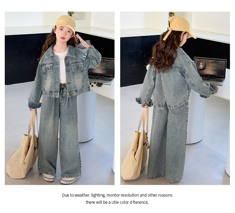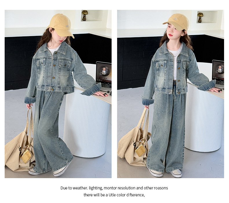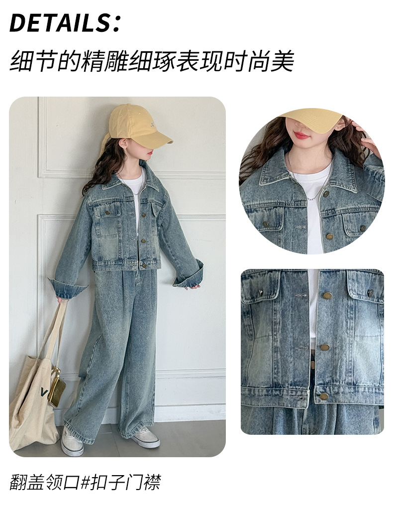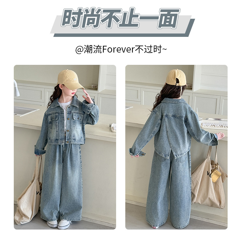 소녀 데님 세트 봄과 가을 2025 새로운 여자 한국 코트 어린이 봄 넓은 다리 바지 두 조각 세트