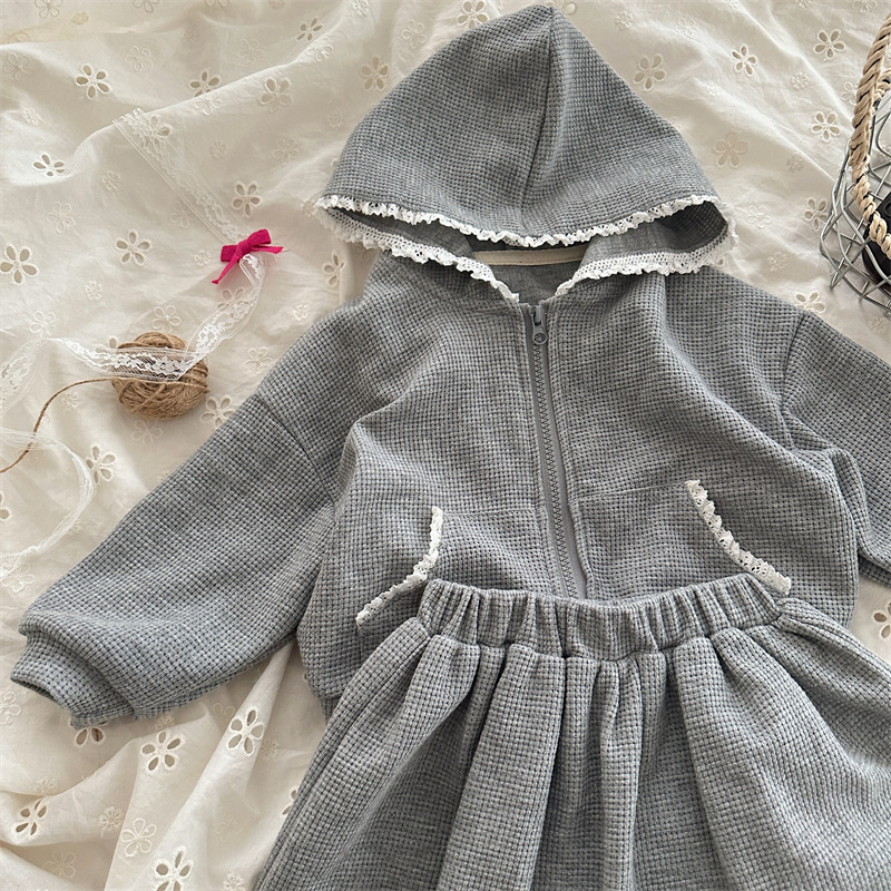 Xi Fan Chunqiu 새로운 어린이 모자 운동복 레이스 세트 소녀의 서양식 와플 재킷 스커트 2 조각