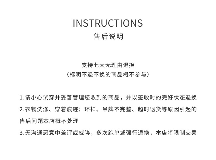 4.所有质量、调换尺码等问题产生的退、换货,请按退货流程申请退款,重拍即可。