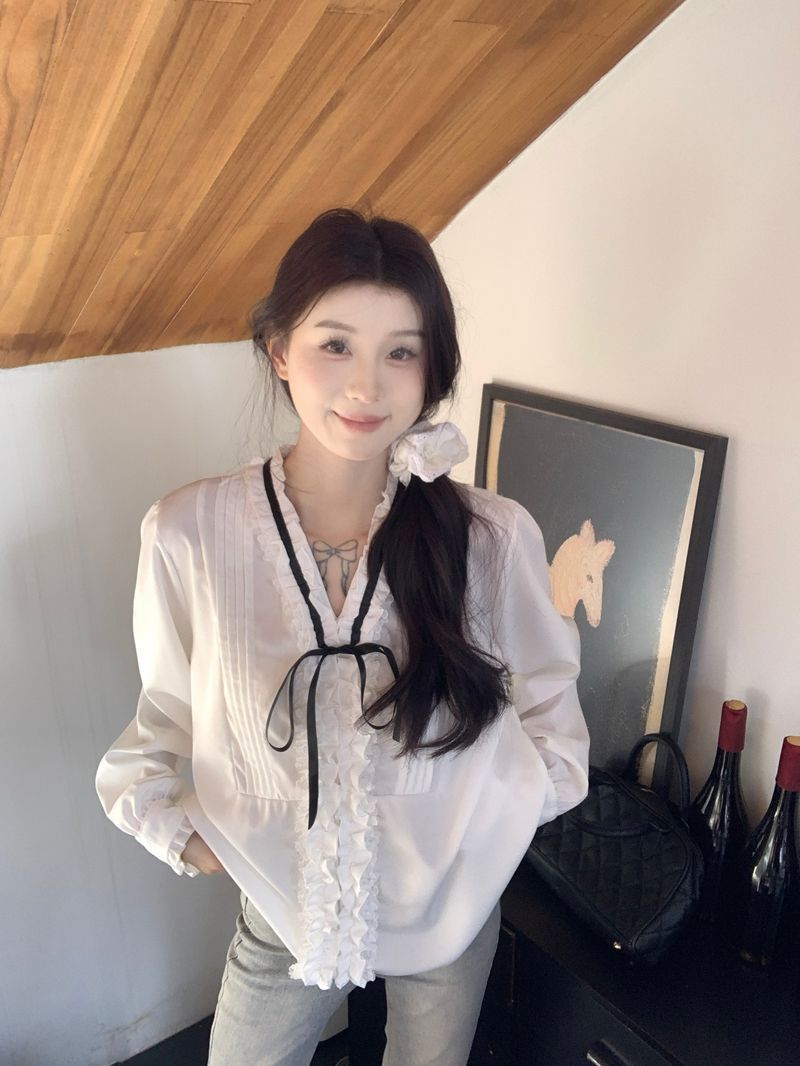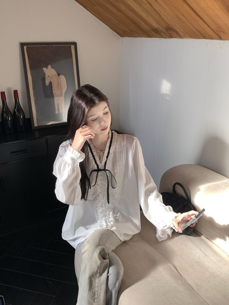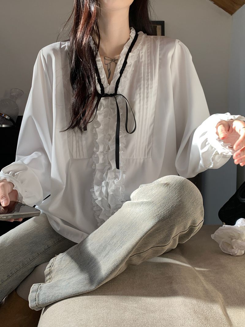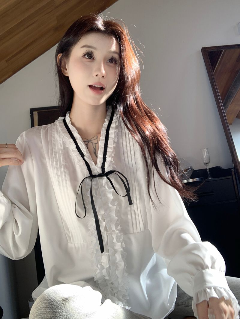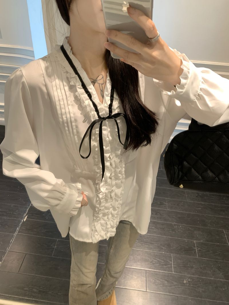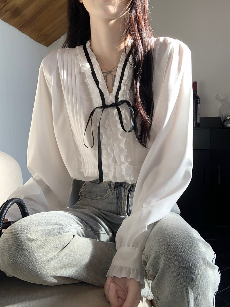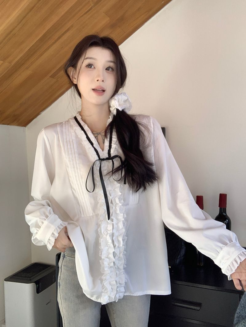 프랑스 레트로 V 넥 레이스 업 보우 셔츠 여성의 봄과 여름 긴 소매 화이트 디자인 플리츠 레이스 탑