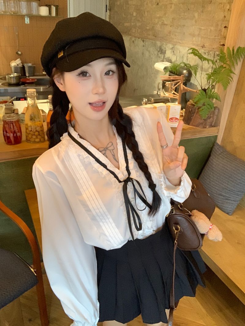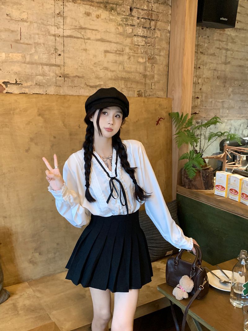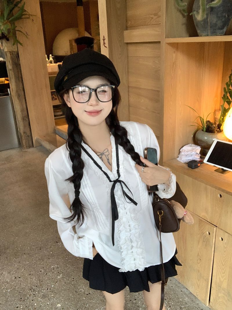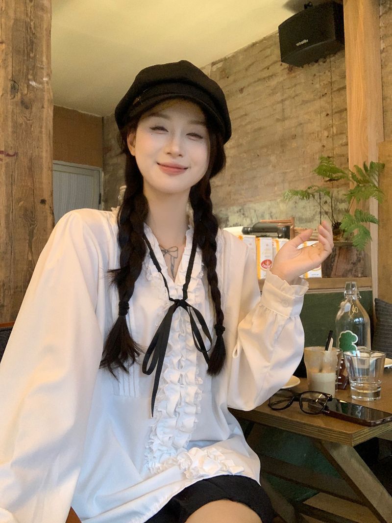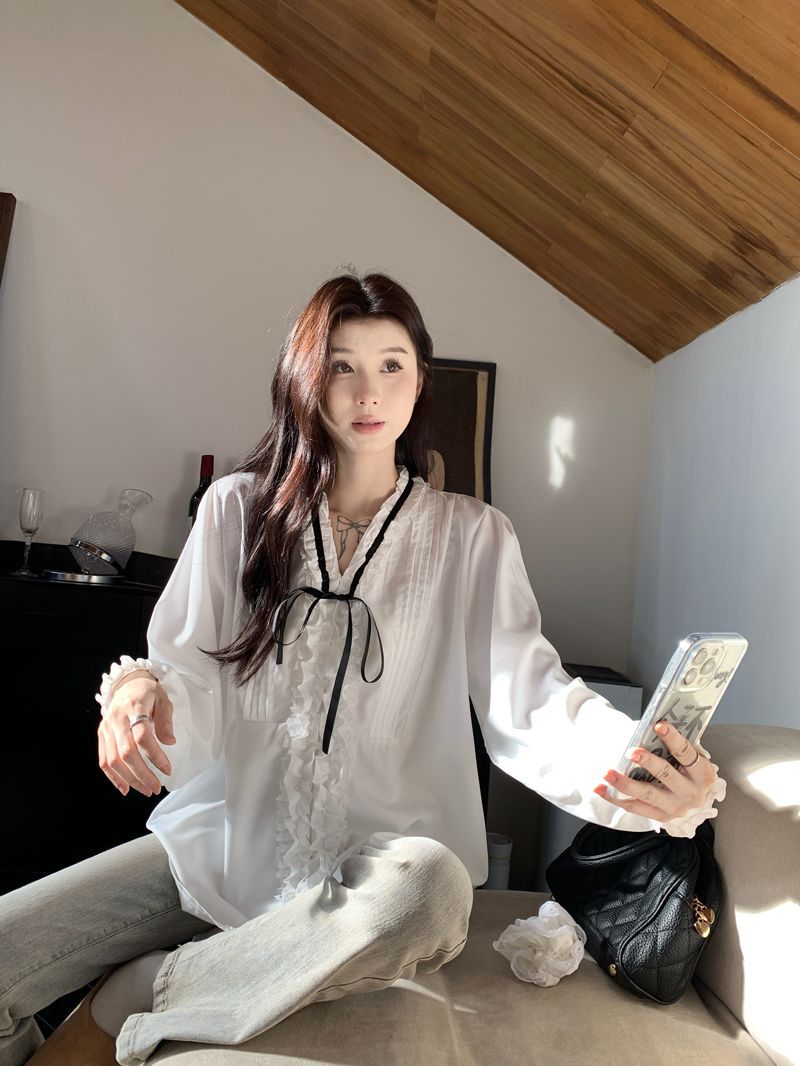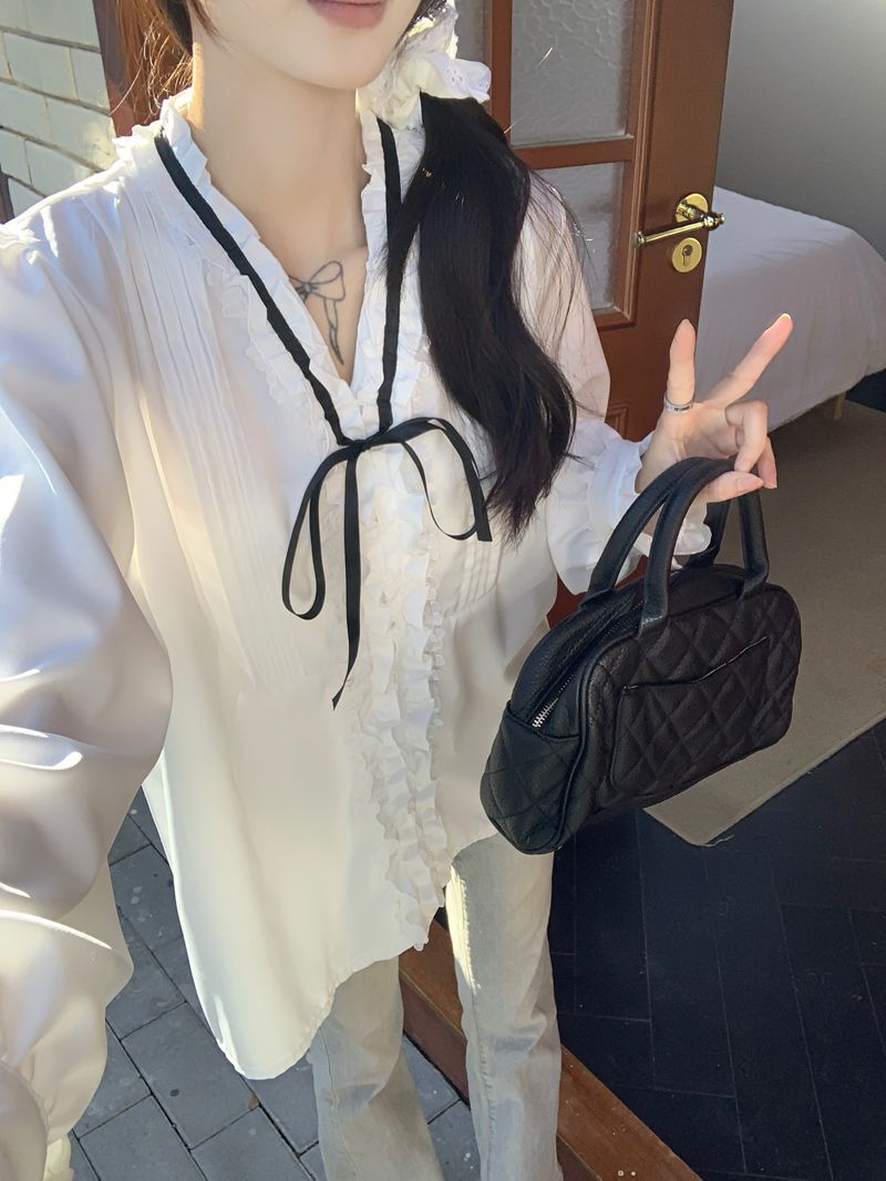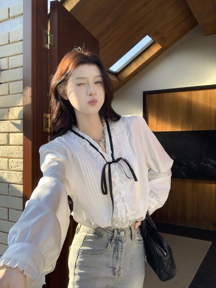 프랑스 레트로 V 넥 레이스 업 보우 셔츠 여성의 봄과 여름 긴 소매 화이트 디자인 플리츠 레이스 탑