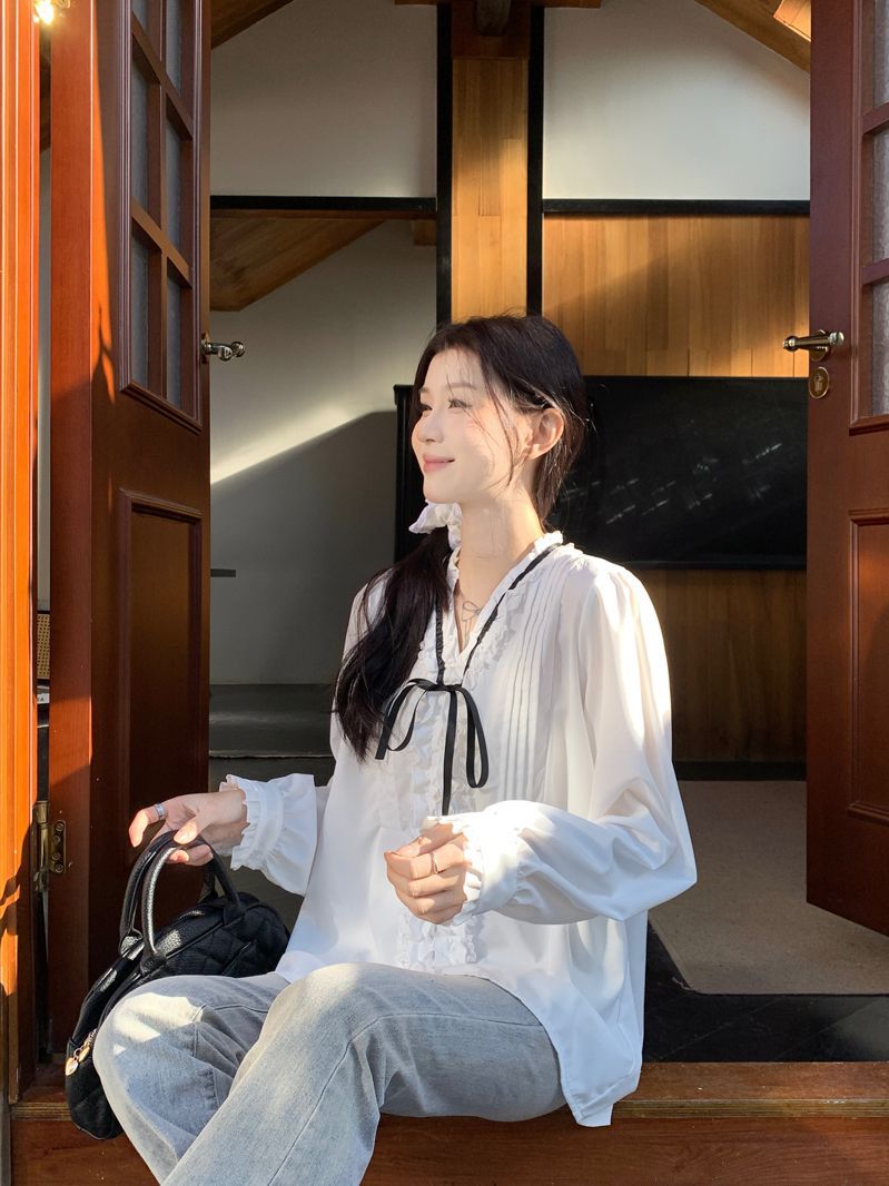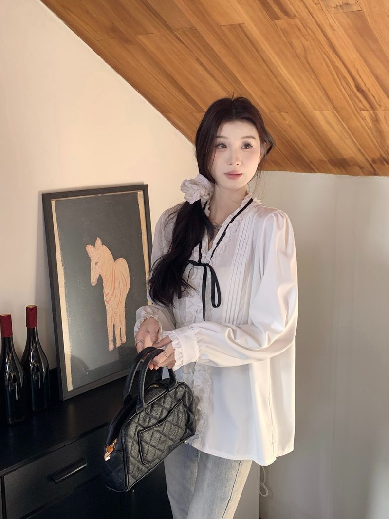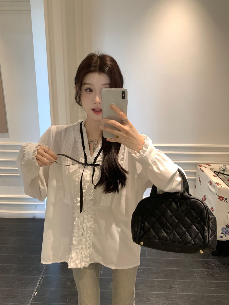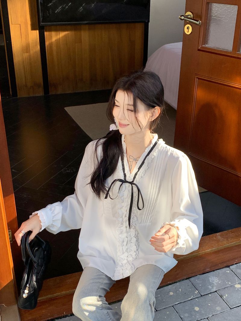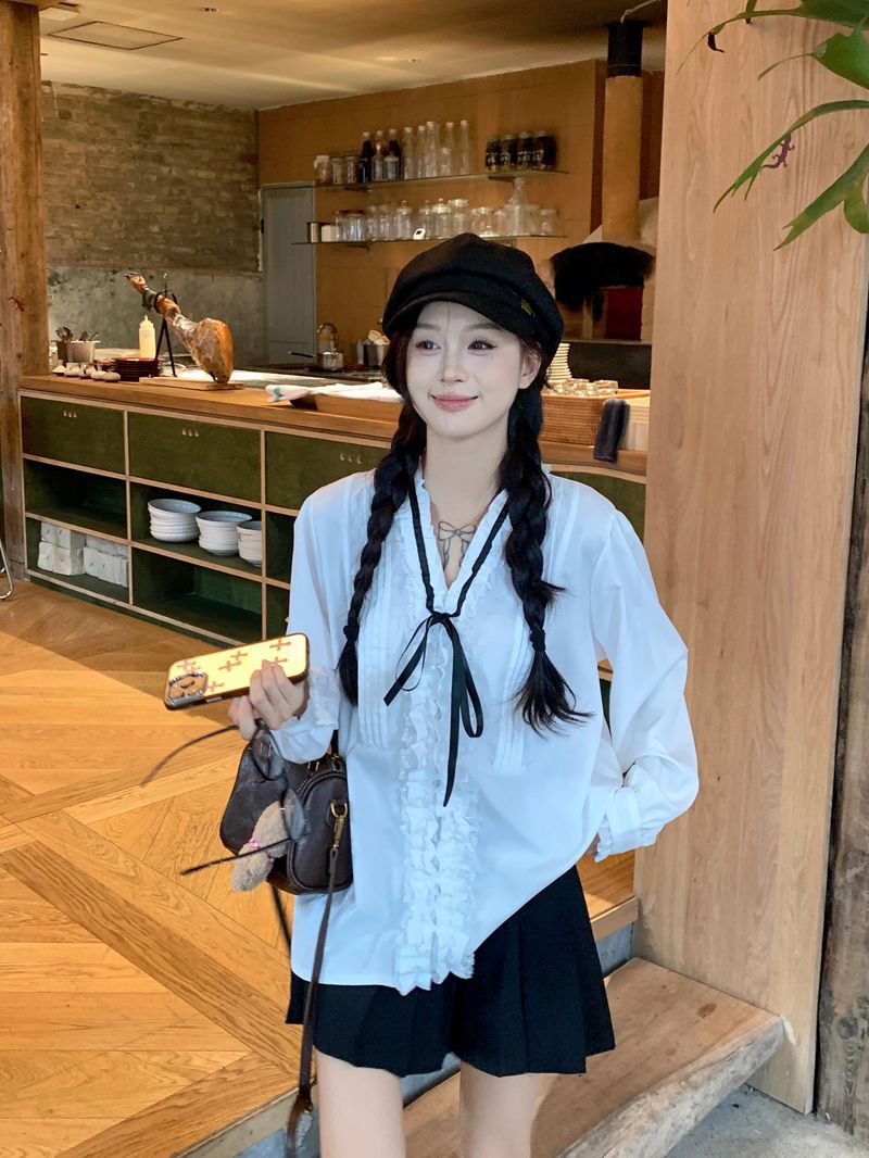 프랑스 레트로 V 넥 레이스 업 보우 셔츠 여성의 봄과 여름 긴 소매 화이트 디자인 플리츠 레이스 탑스토어 가기