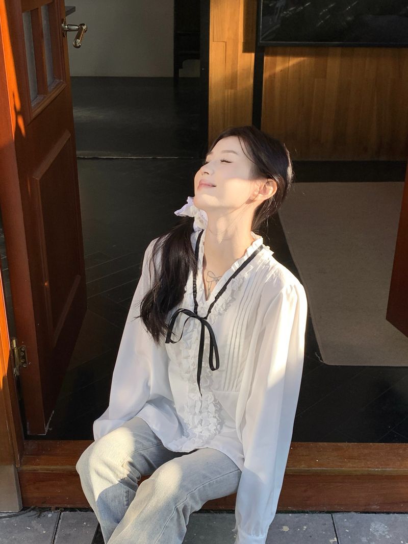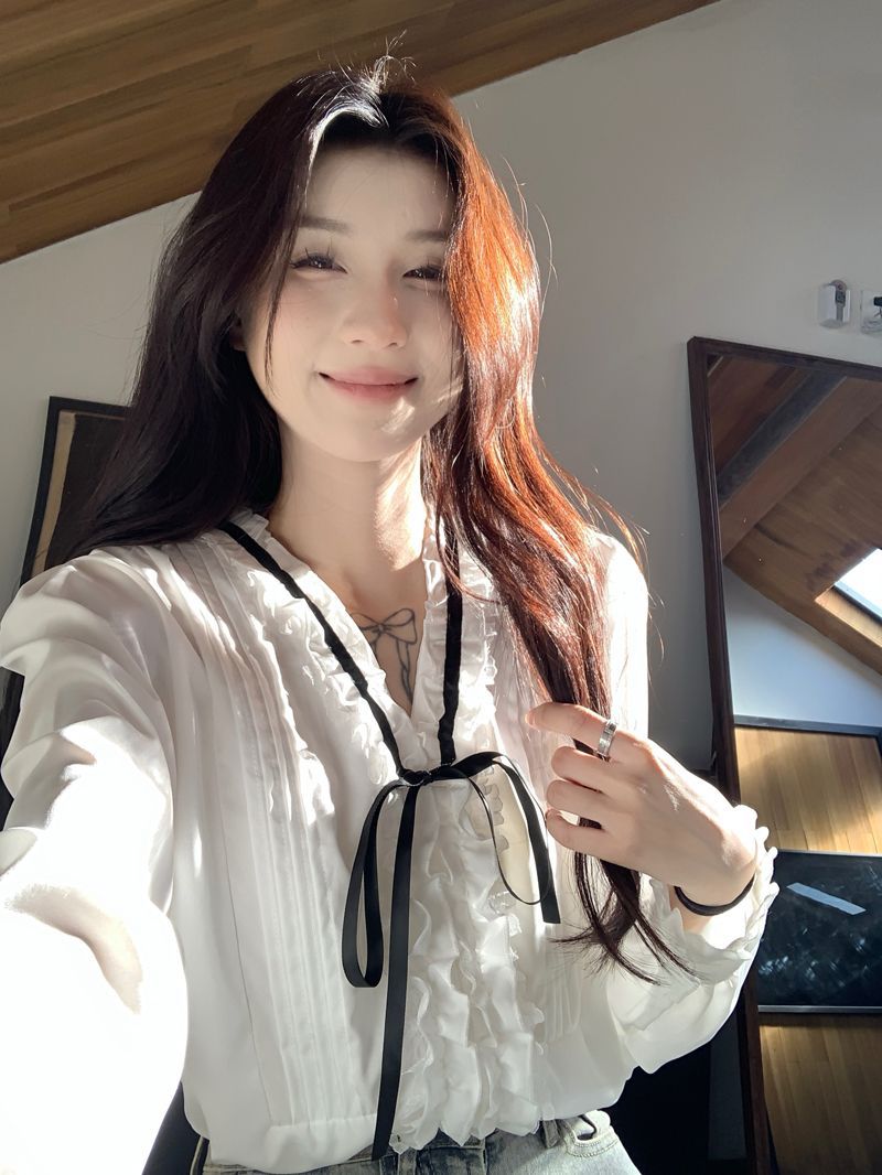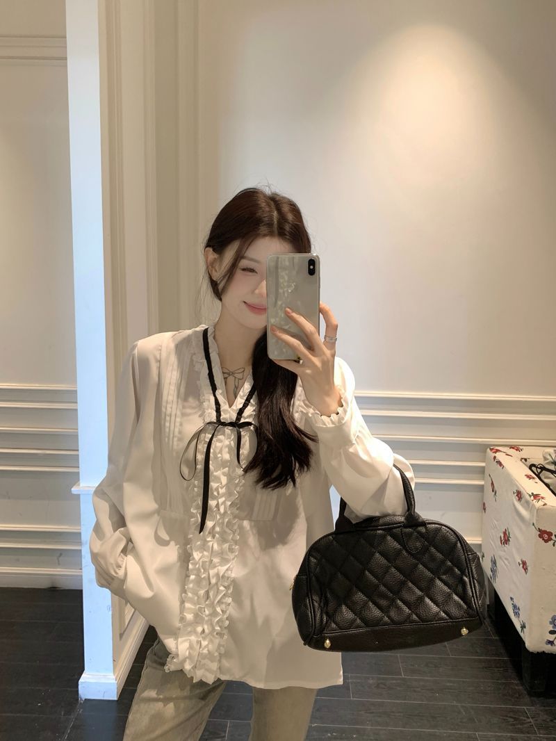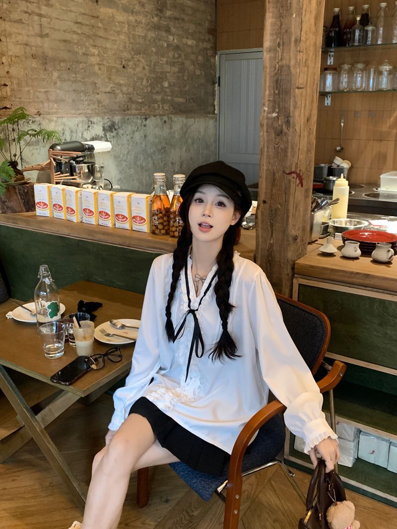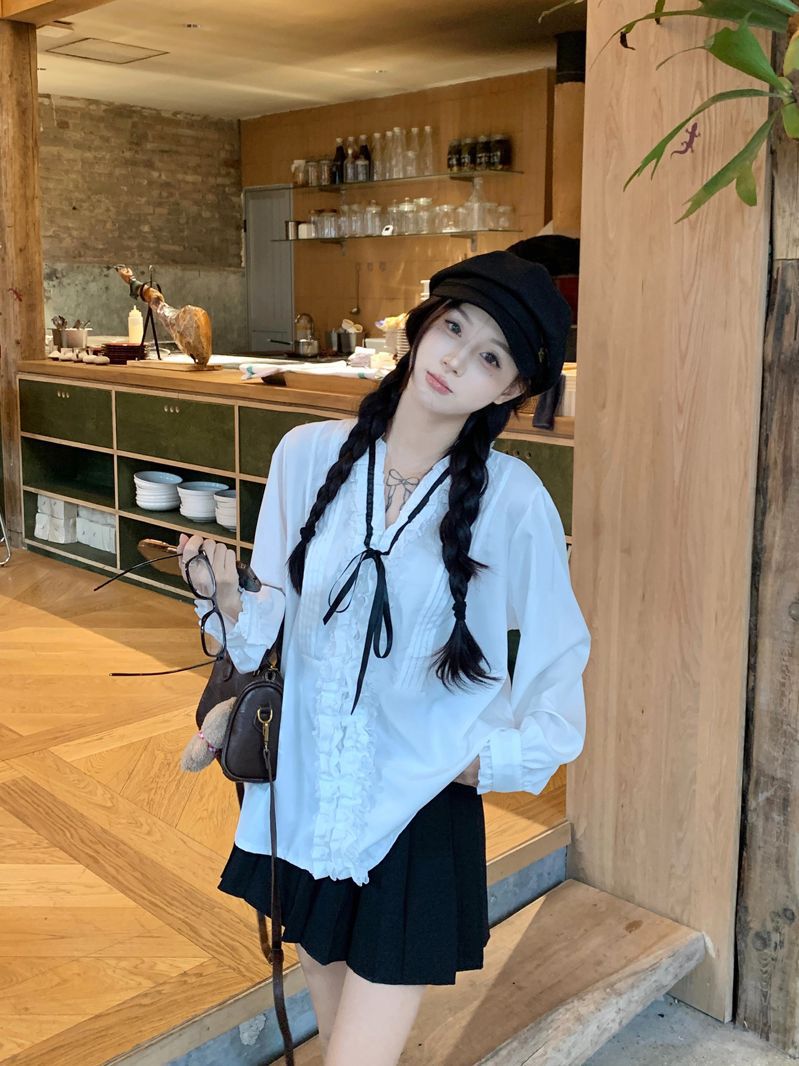 프랑스 레트로 V 넥 레이스 업 보우 셔츠 여성의 봄과 여름 긴 소매 화이트 디자인 플리츠 레이스 탑스토어 가기