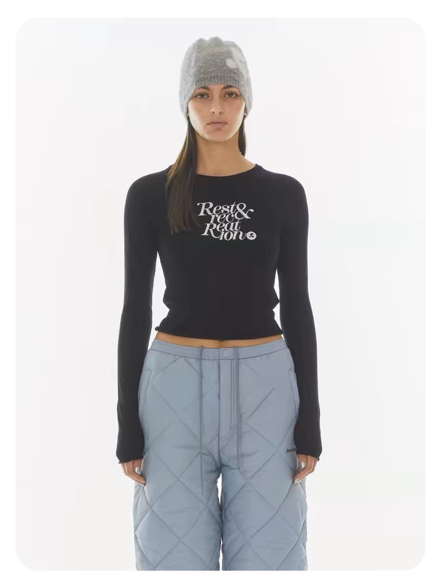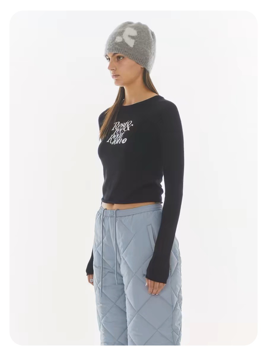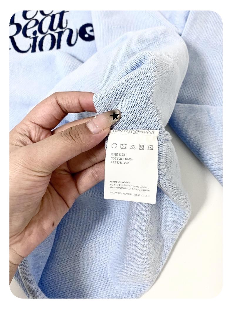 한국 여성복 도매, 한국 니치 브랜드 RR 자수 숏 스타일 허리라인 라운드넥 니트 스웨터 슬림핏 상의