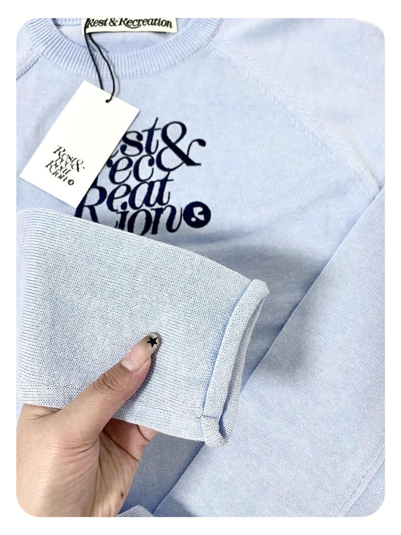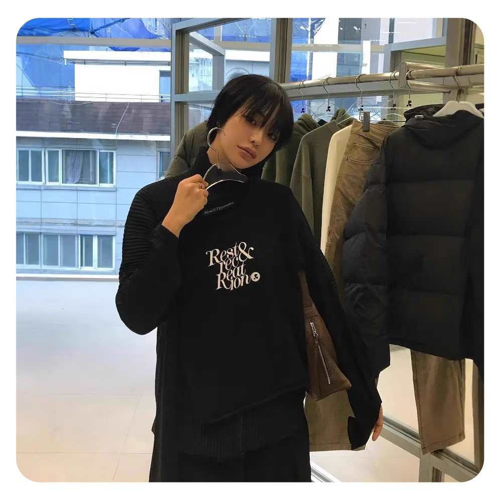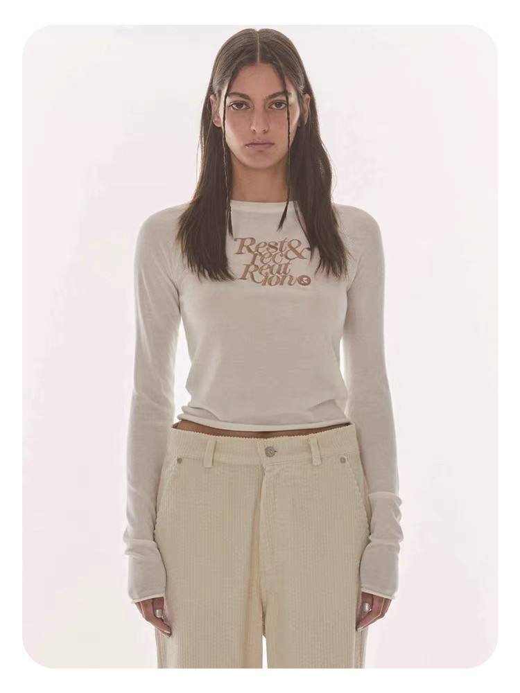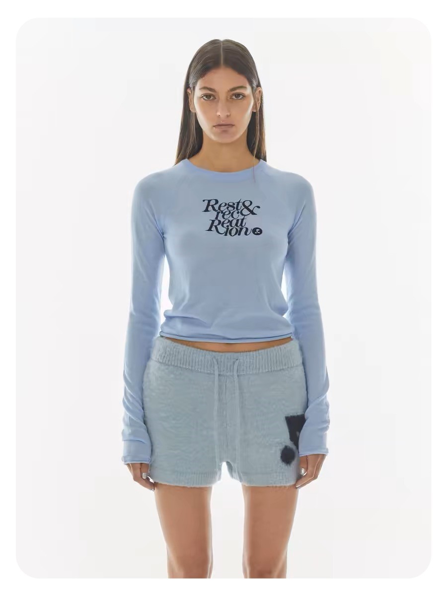한국 여성복 도매, 한국 니치 브랜드 RR 자수 숏 스타일 허리라인 라운드넥 니트 스웨터 슬림핏 상의