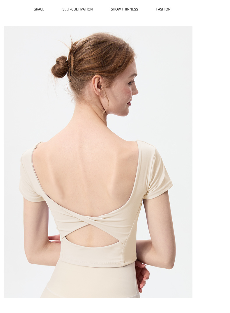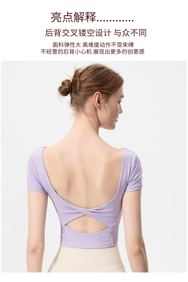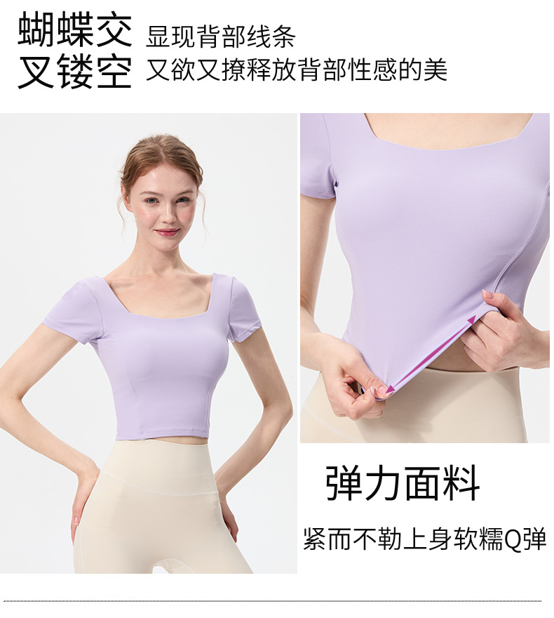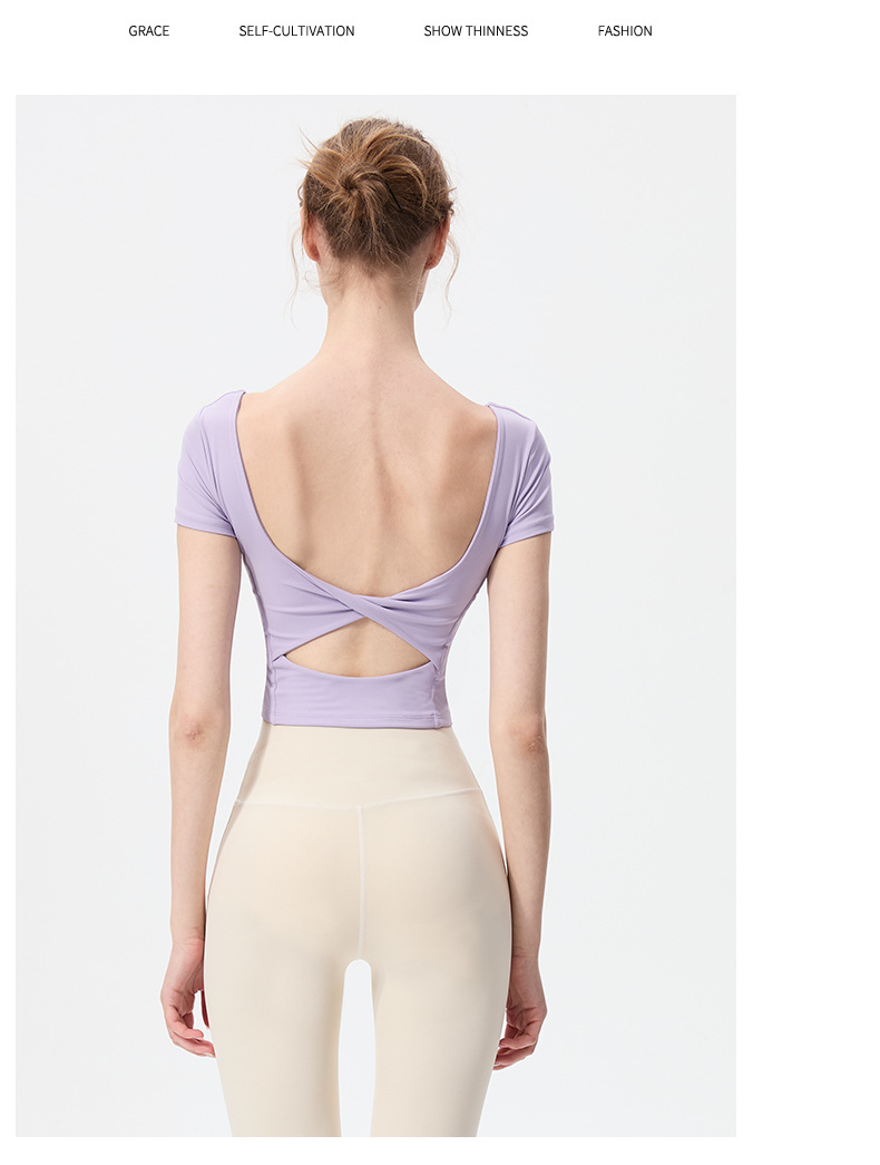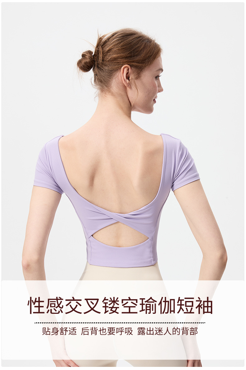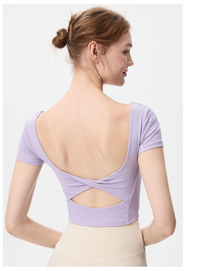 스포츠 반팔 여성 원피스 컵 탄성 충격 방지 피트니스 러닝 티셔츠 섹시한 대형 백리스 요가 옷 반팔 슬림