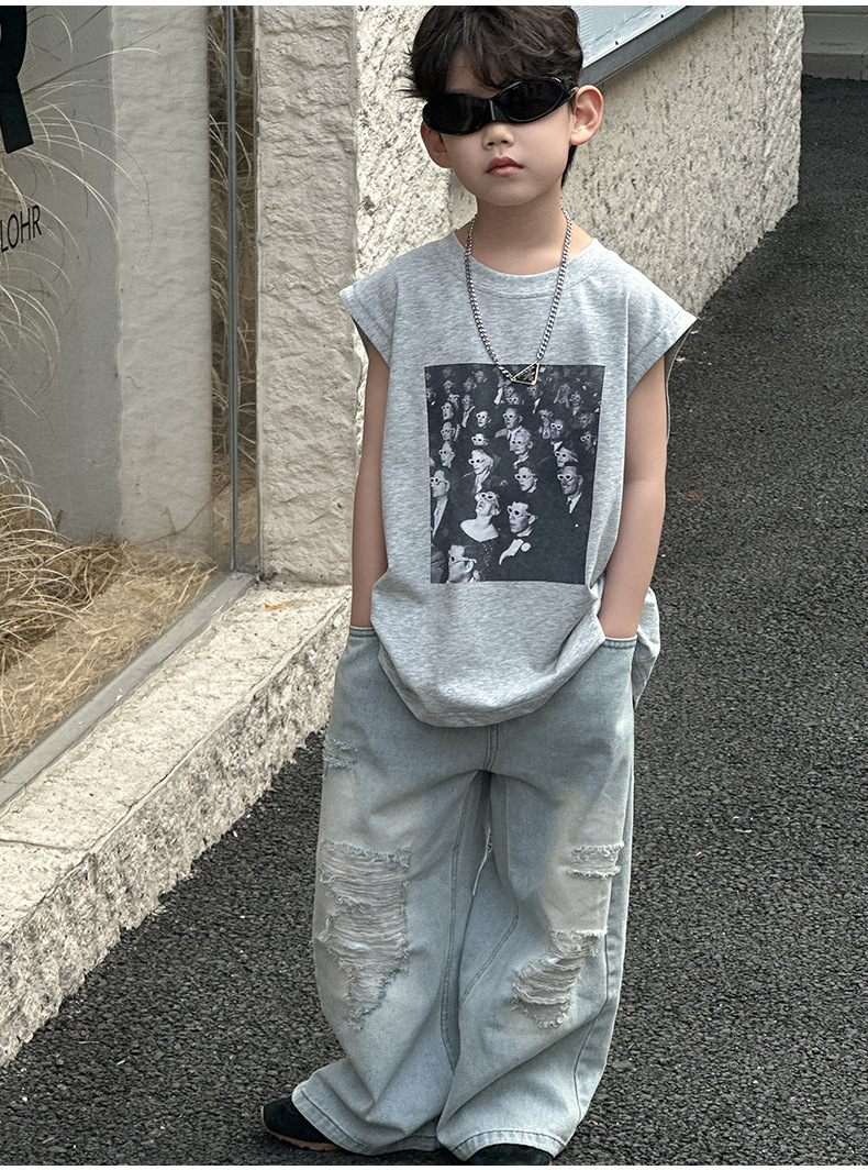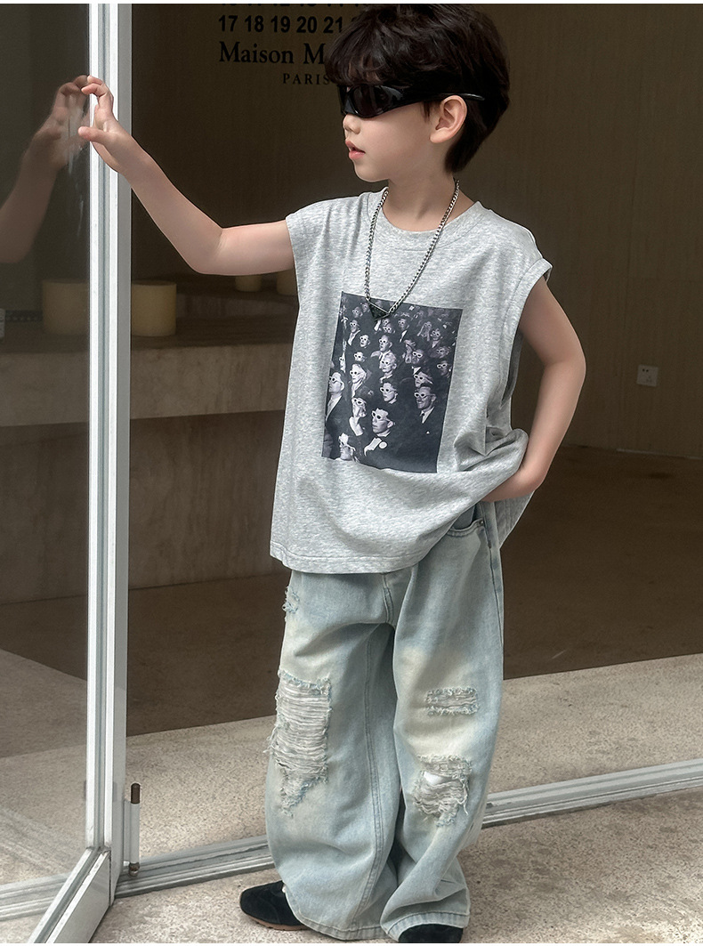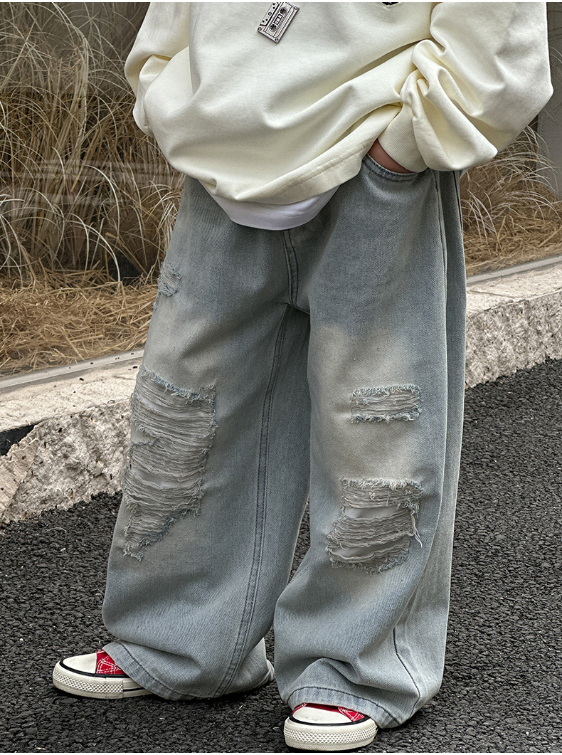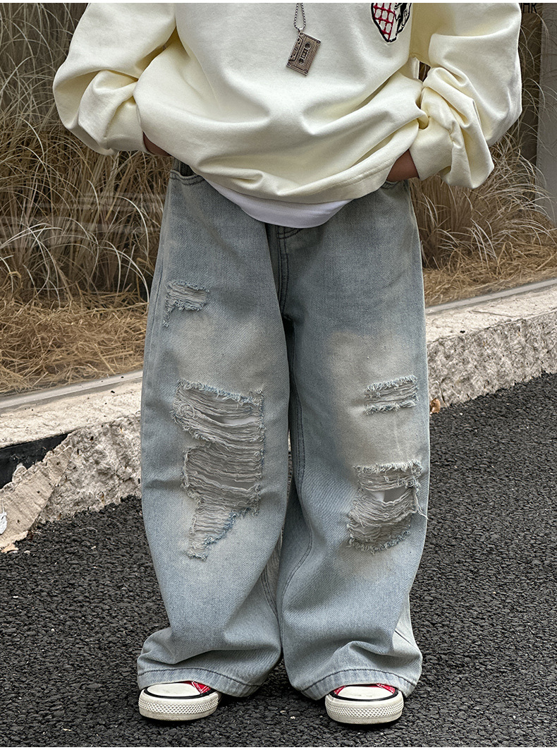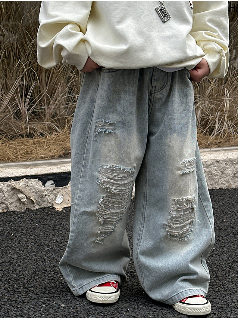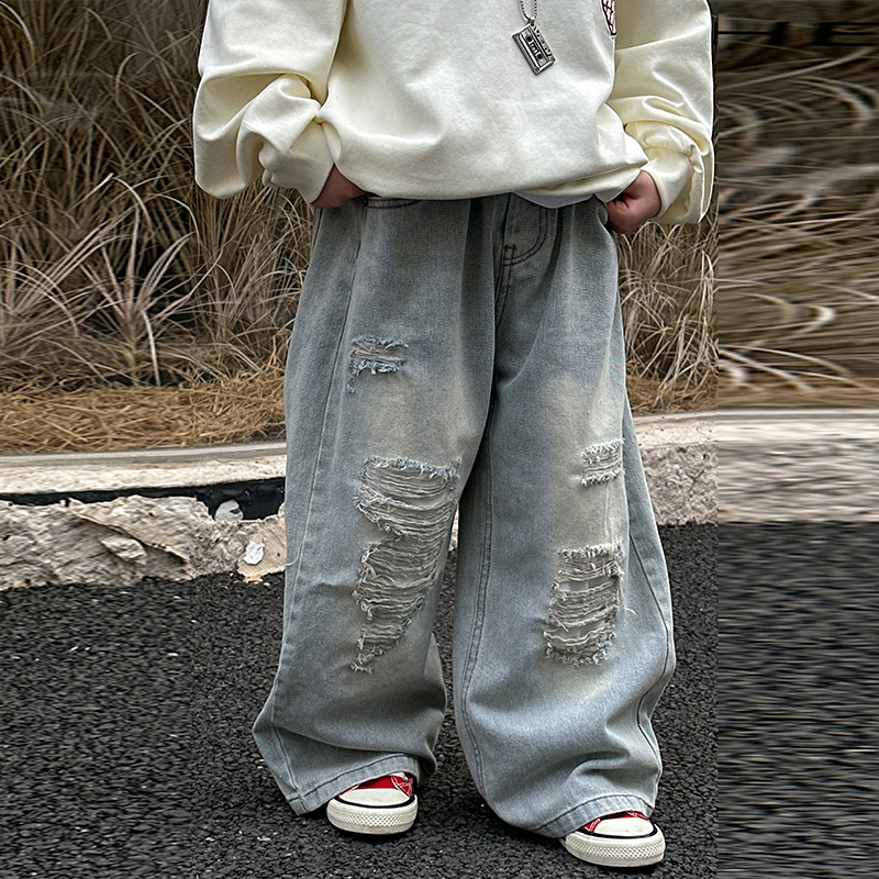 소년 찢어진 청바지 2025 봄 신작 어린이 한국 바지 중소형 어린이 봄 캐주얼 아동 바지