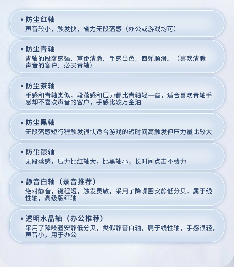 • 투명 크리스탈 샤프트(사무실 권장) - 검정색(빈 키캡) 기능을 직접 설정하거나 영어 키 값을 기록할 수 있음 - 공식 표준 구성