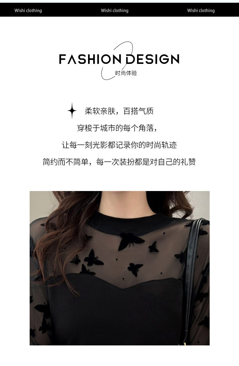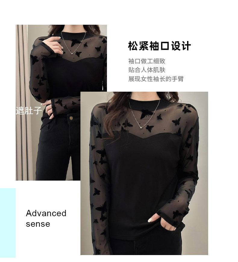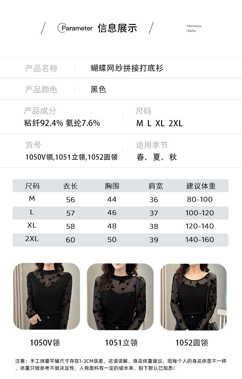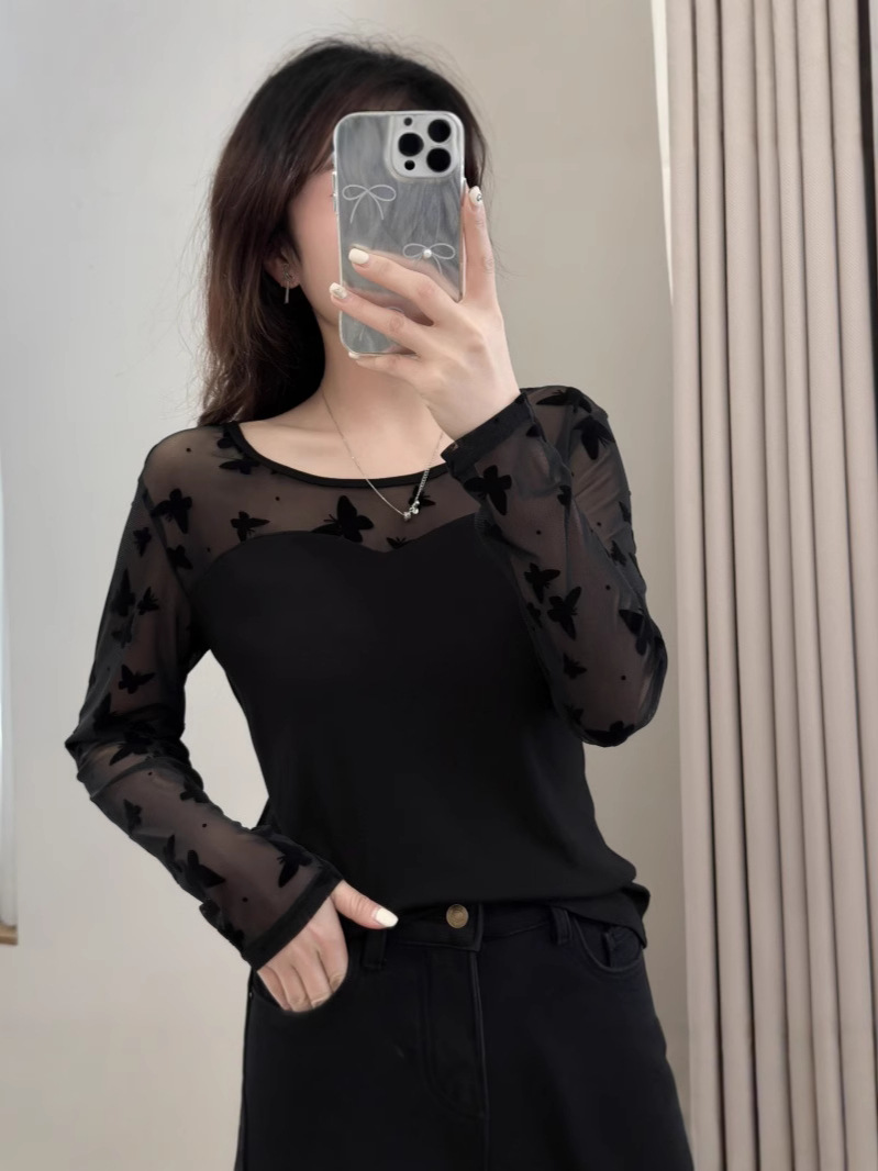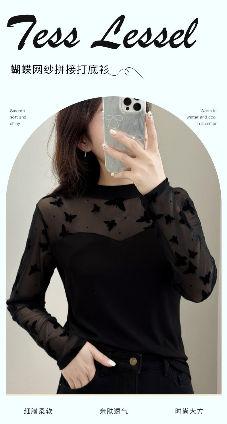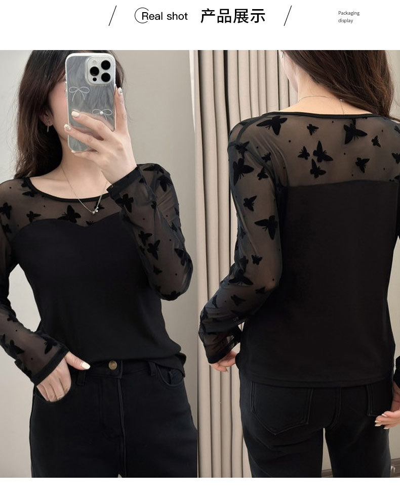 2026년 신상 봄 나비망사 스플라이스 긴팔 티셔츠 여성용 큰 사이즈 슬림핏 슬리밍 탑스토어 가기