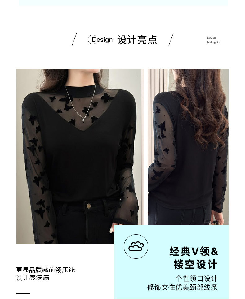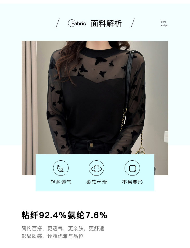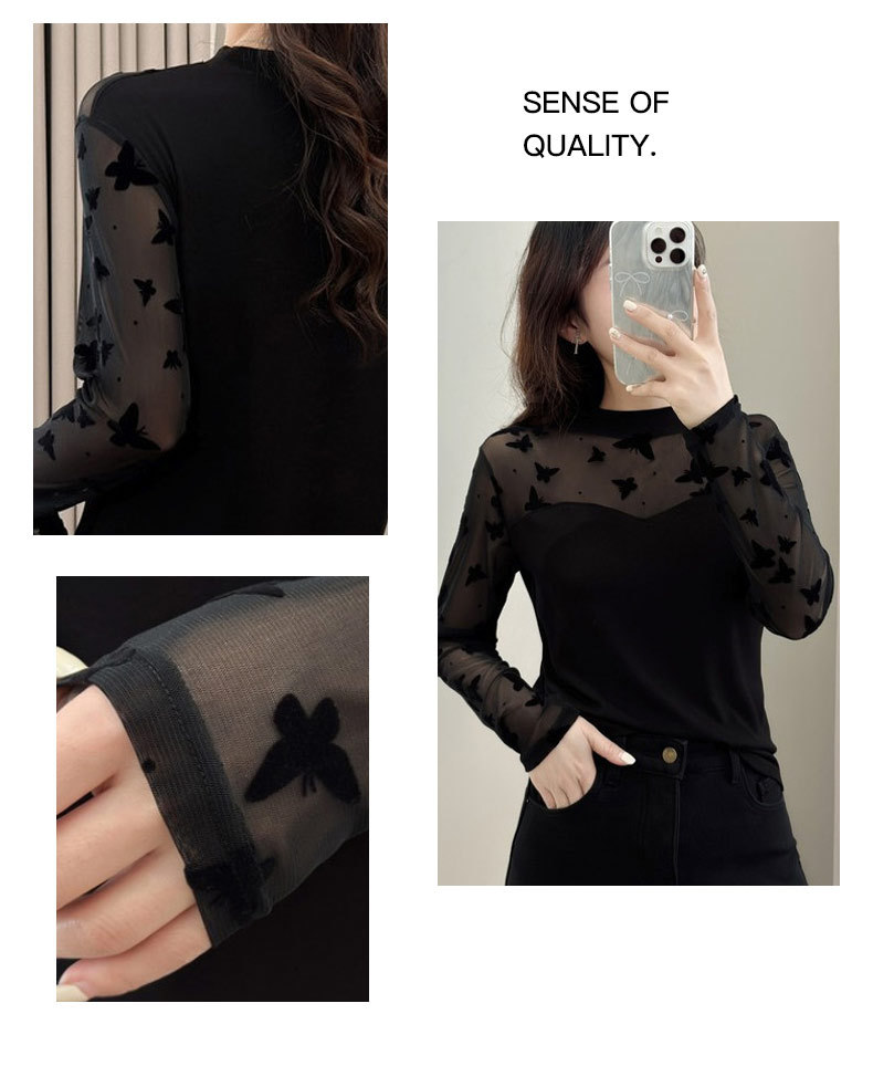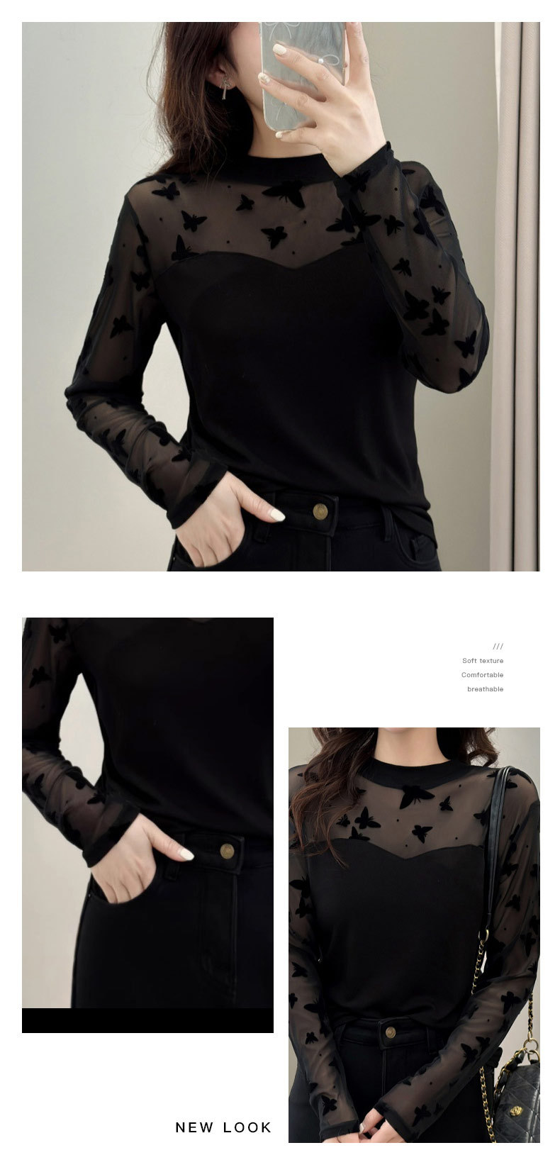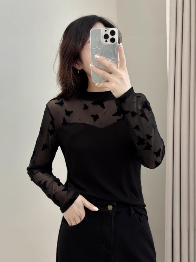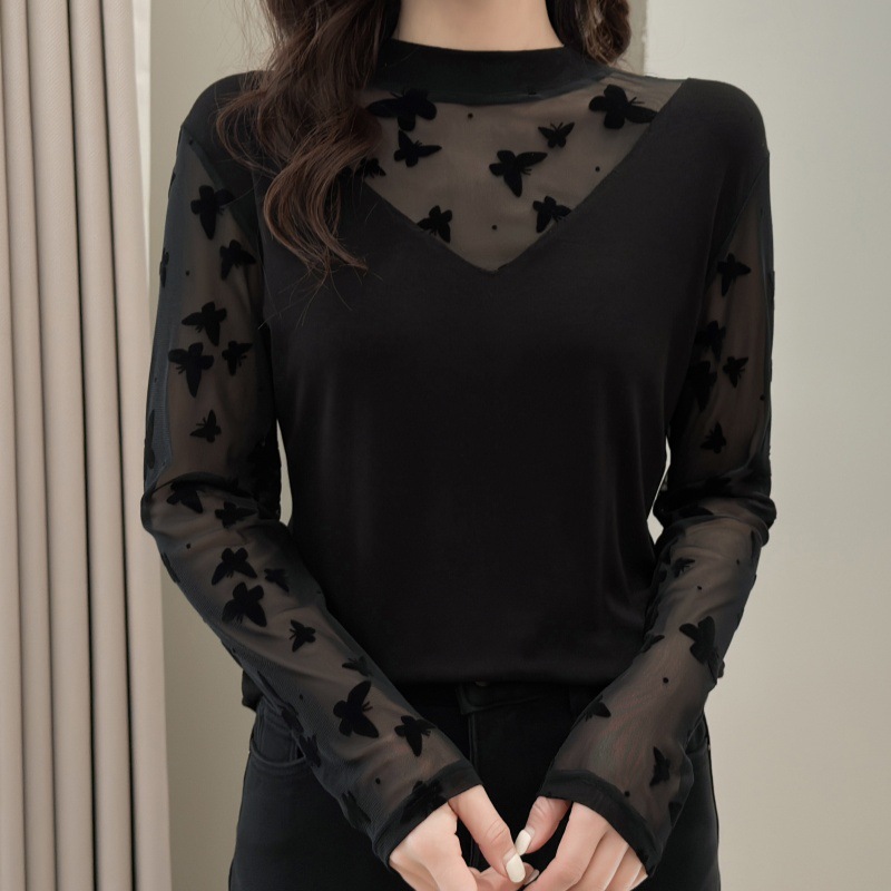 2026년 신상 봄 나비망사 스플라이스 긴팔 티셔츠 여성용 큰 사이즈 슬림핏 슬리밍 탑스토어 가기