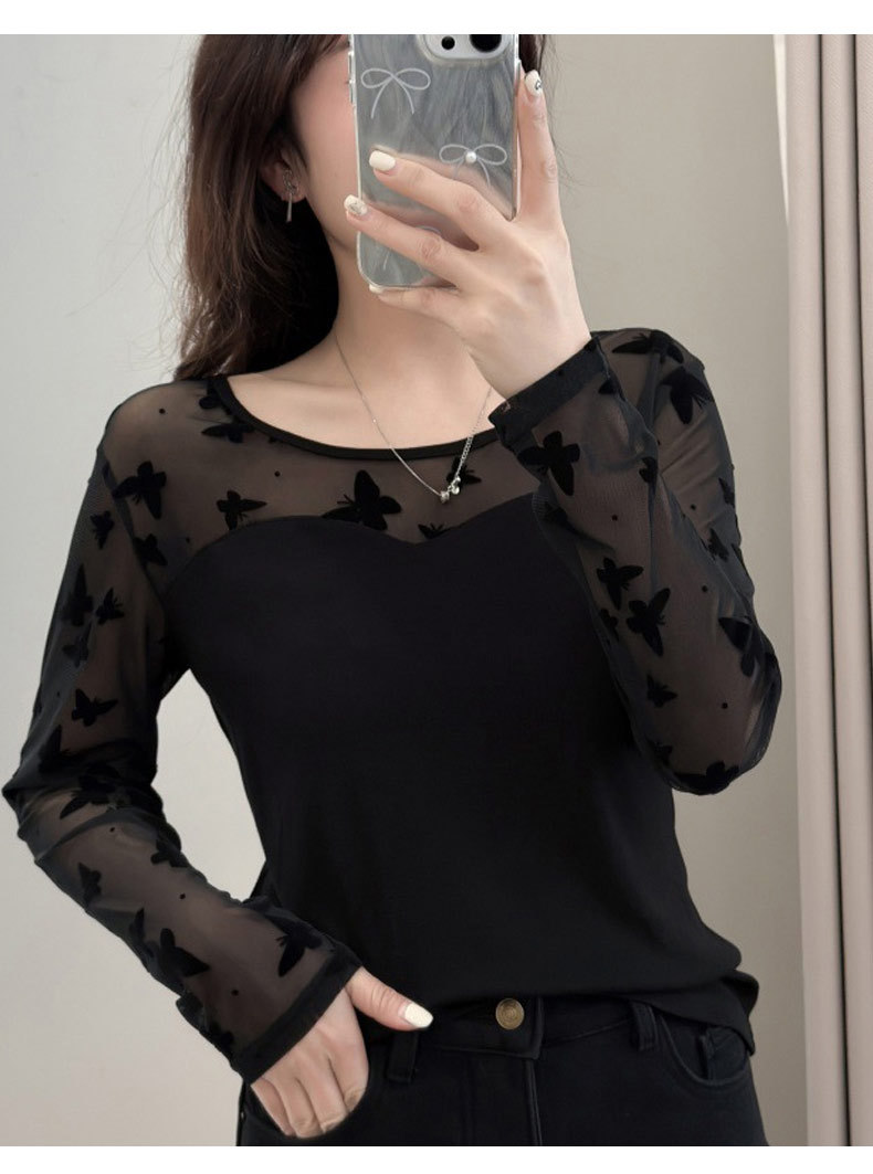 2026년 신상 봄 나비망사 스플라이스 긴팔 티셔츠 여성용 큰 사이즈 슬림핏 슬리밍 탑