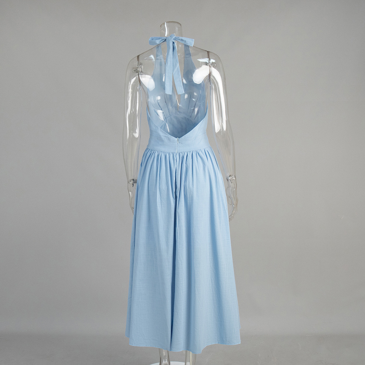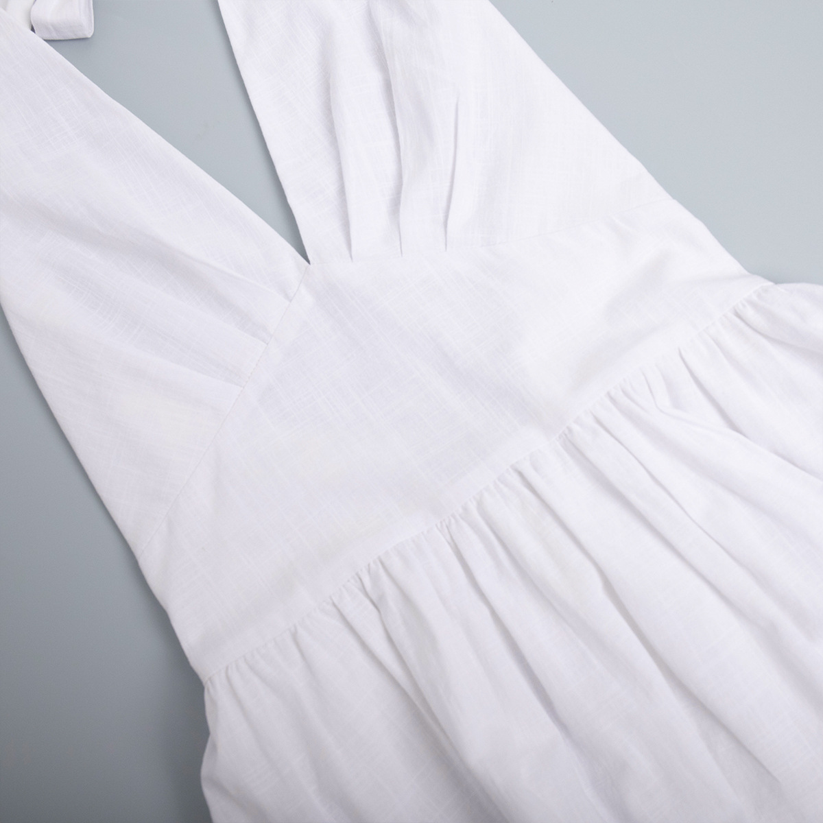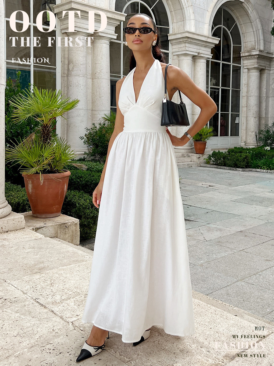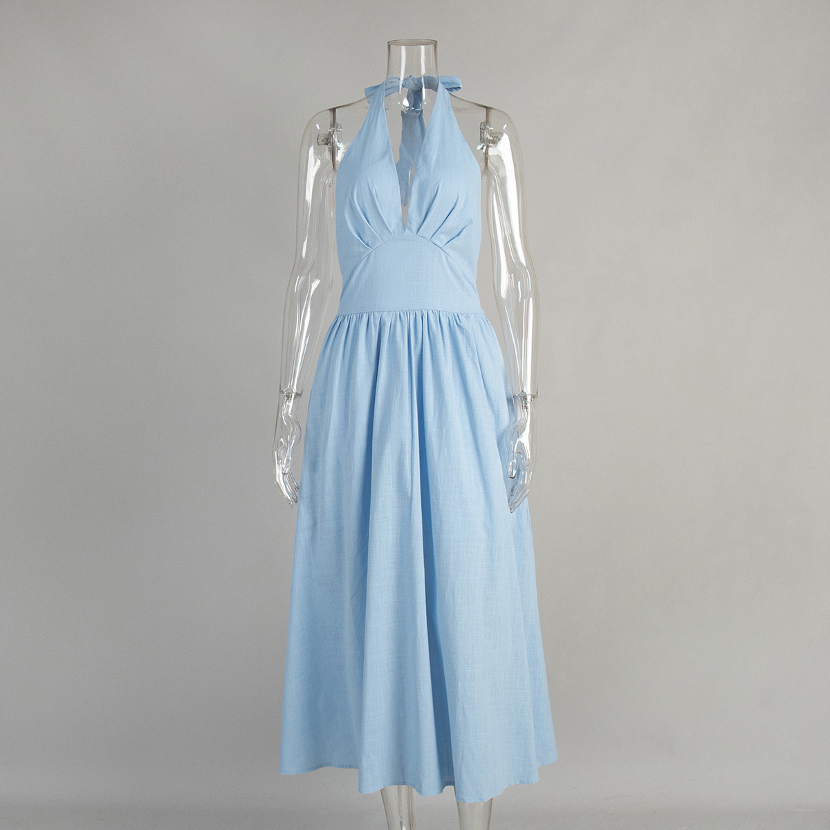 국경 간 순수 코튼 긴 원피스 유럽과 미국 2025 년 봄 및 여름 웨이스트 V 넥 스트랩 대형 스윙 원피스 여성과 긴 원피스스토어 가기