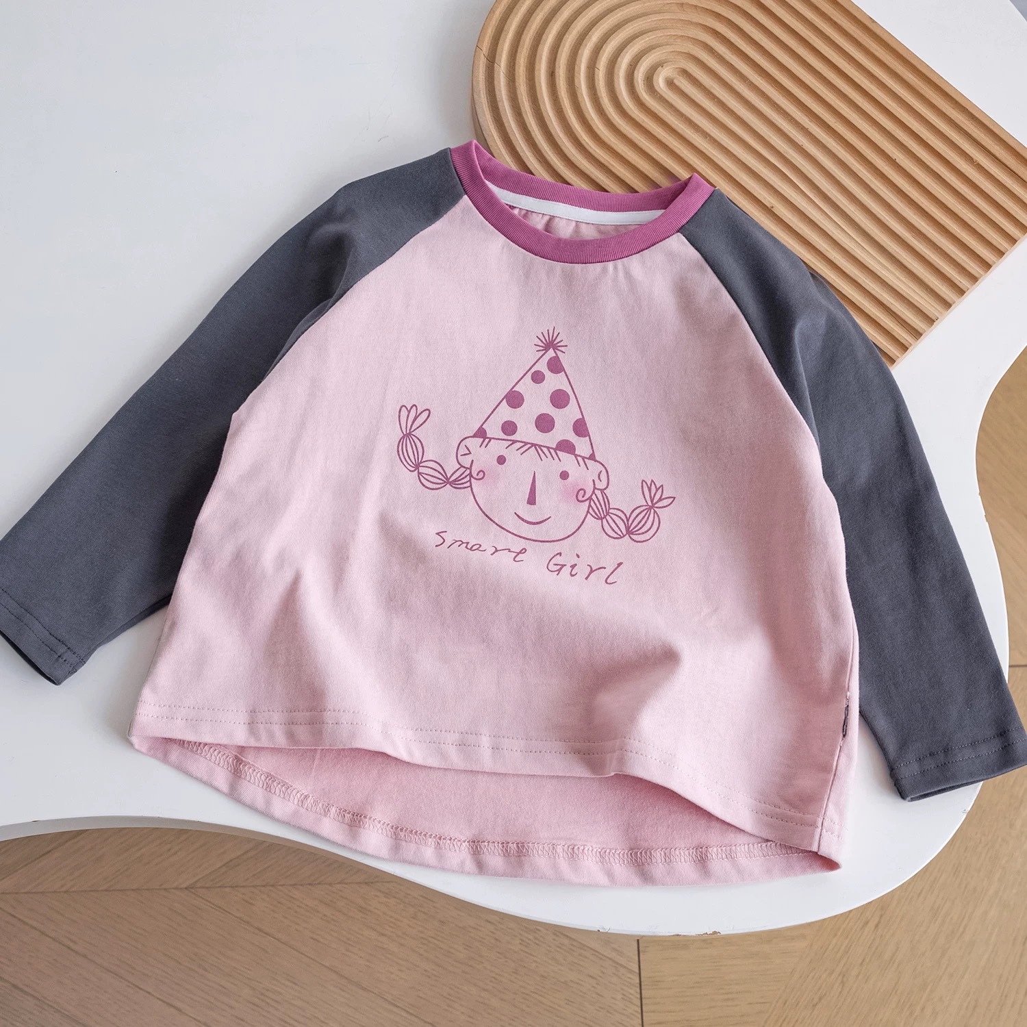 [순수한 면] 새로운 25 여아 라글란 소매 긴 소매 티셔츠 여성의 인쇄 서양식 봄과 가을 새 아기 탑