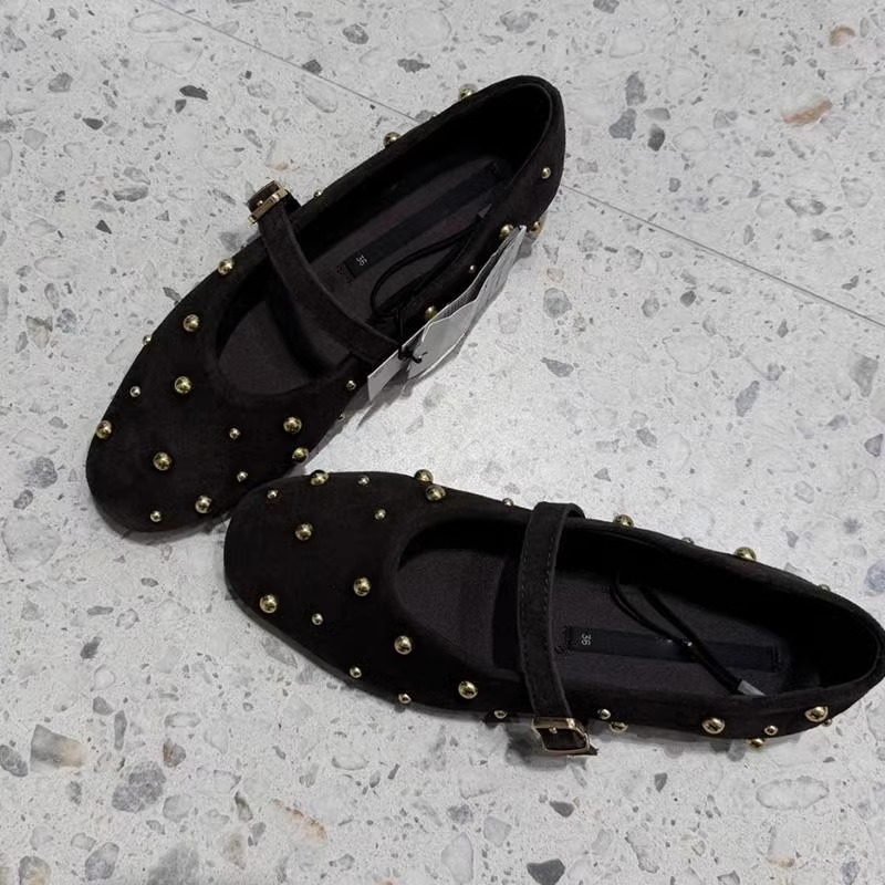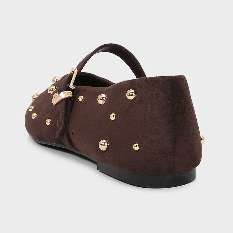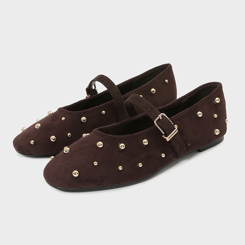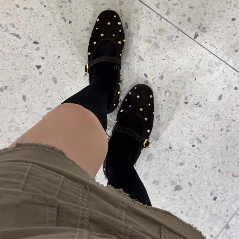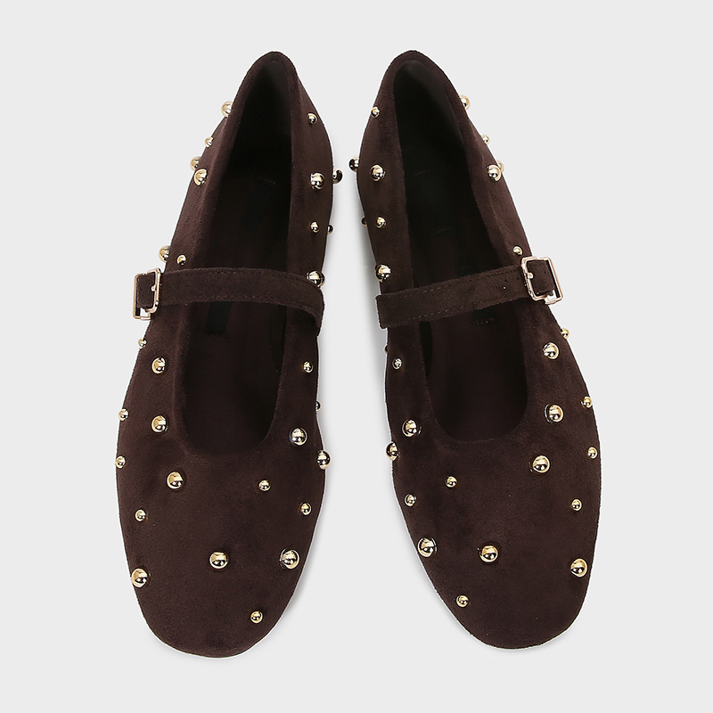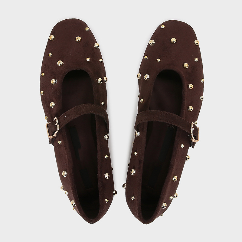 ZA2024 가을 새로운 여성 신발 다크 브라운 리벳 가죽 발레 스타일 플랫 휴 신발 플랫 힐 메리 제인 신발스토어 가기