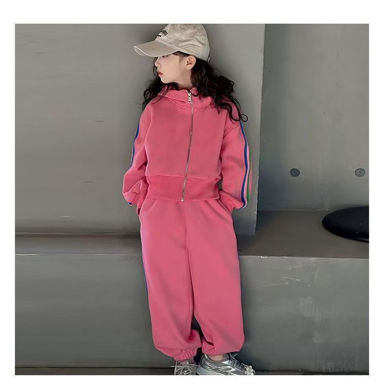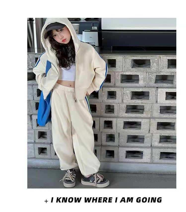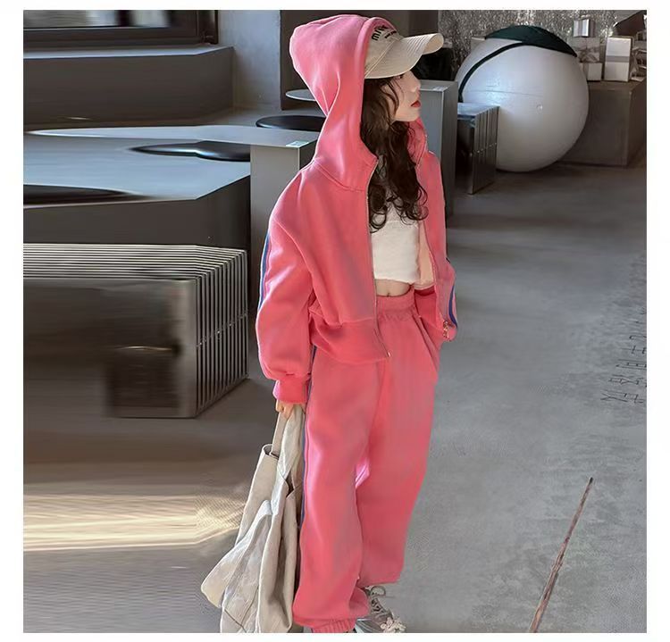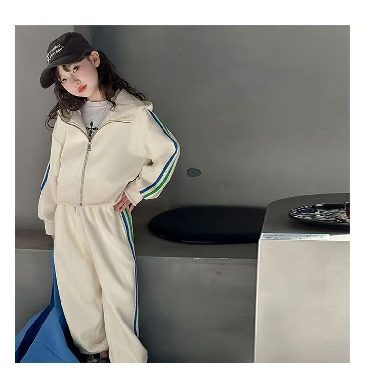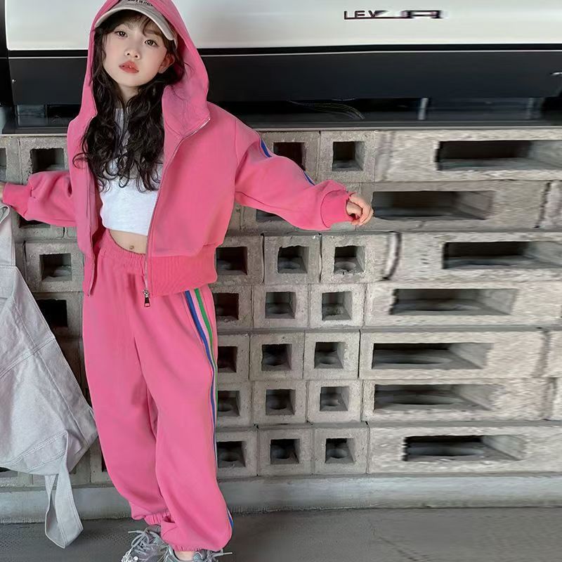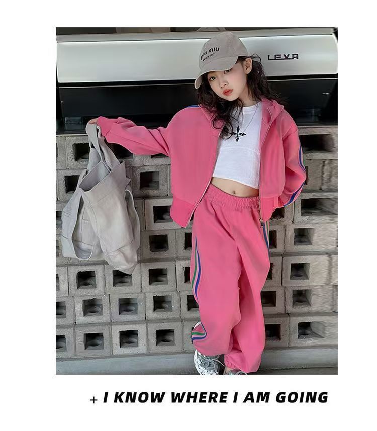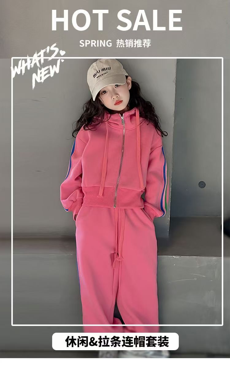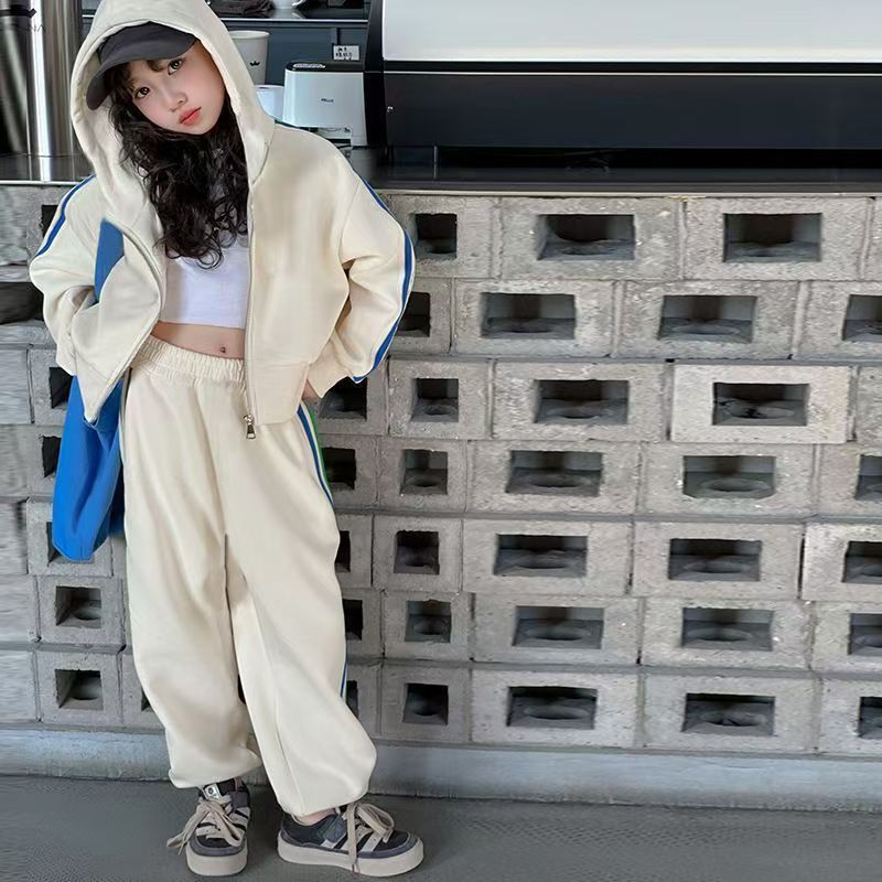 여자 세트 봄 2025 새로운 한국 어린이 외국 스타일 후드 코트 어린 소녀 스포츠 바지 투피스 패션스토어 가기