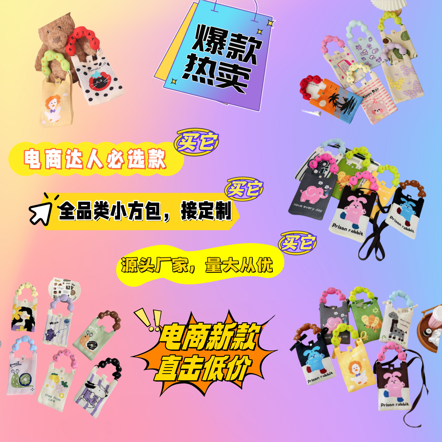 새로운 귀여운 만화 틈새 디자인 미니 모든 경기 작은 휴대용 니트 휴대 전화 가방 통근 크로스 바디 작은 광장 가방스토어 가기