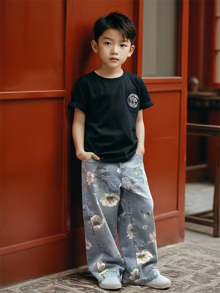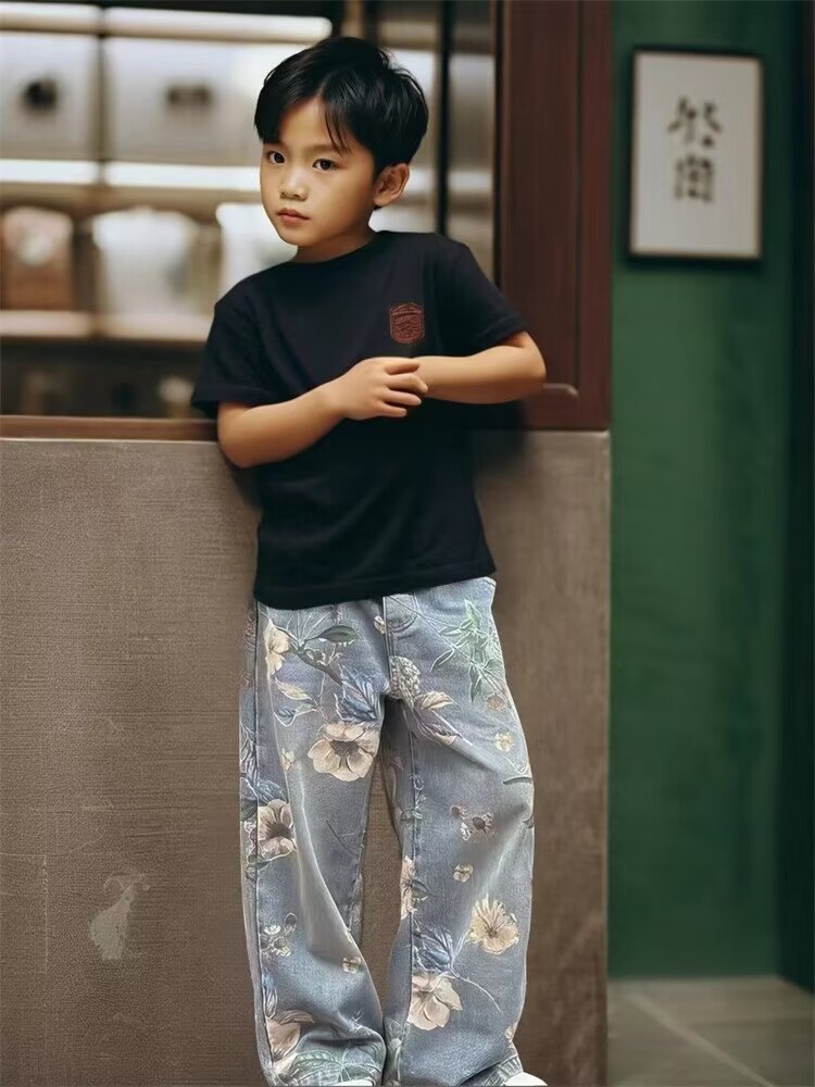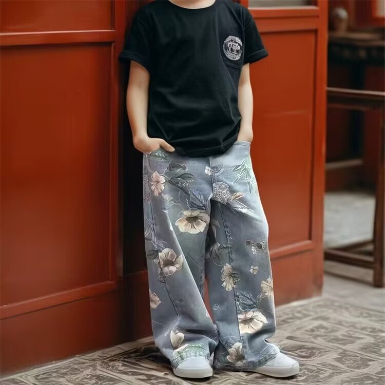 소년의 봄과 여름 바지 2025 새로운 스타일 큰 소년 미국 인쇄 거리 청바지 아기 한국 스타일 스트레이트 다리 바지