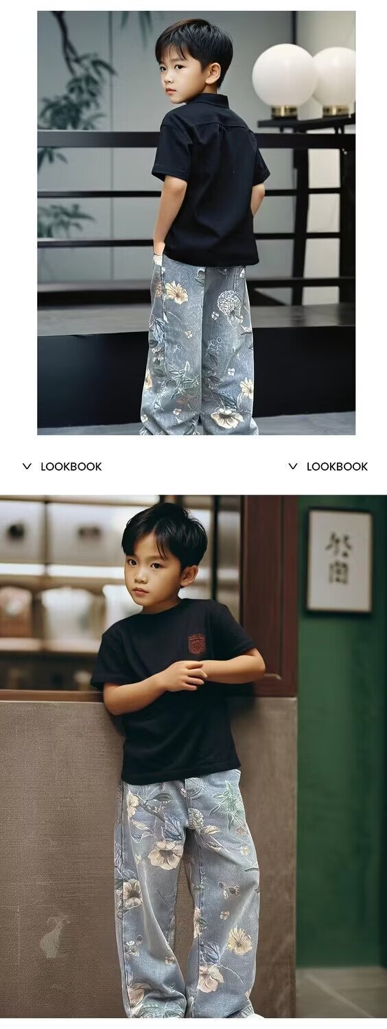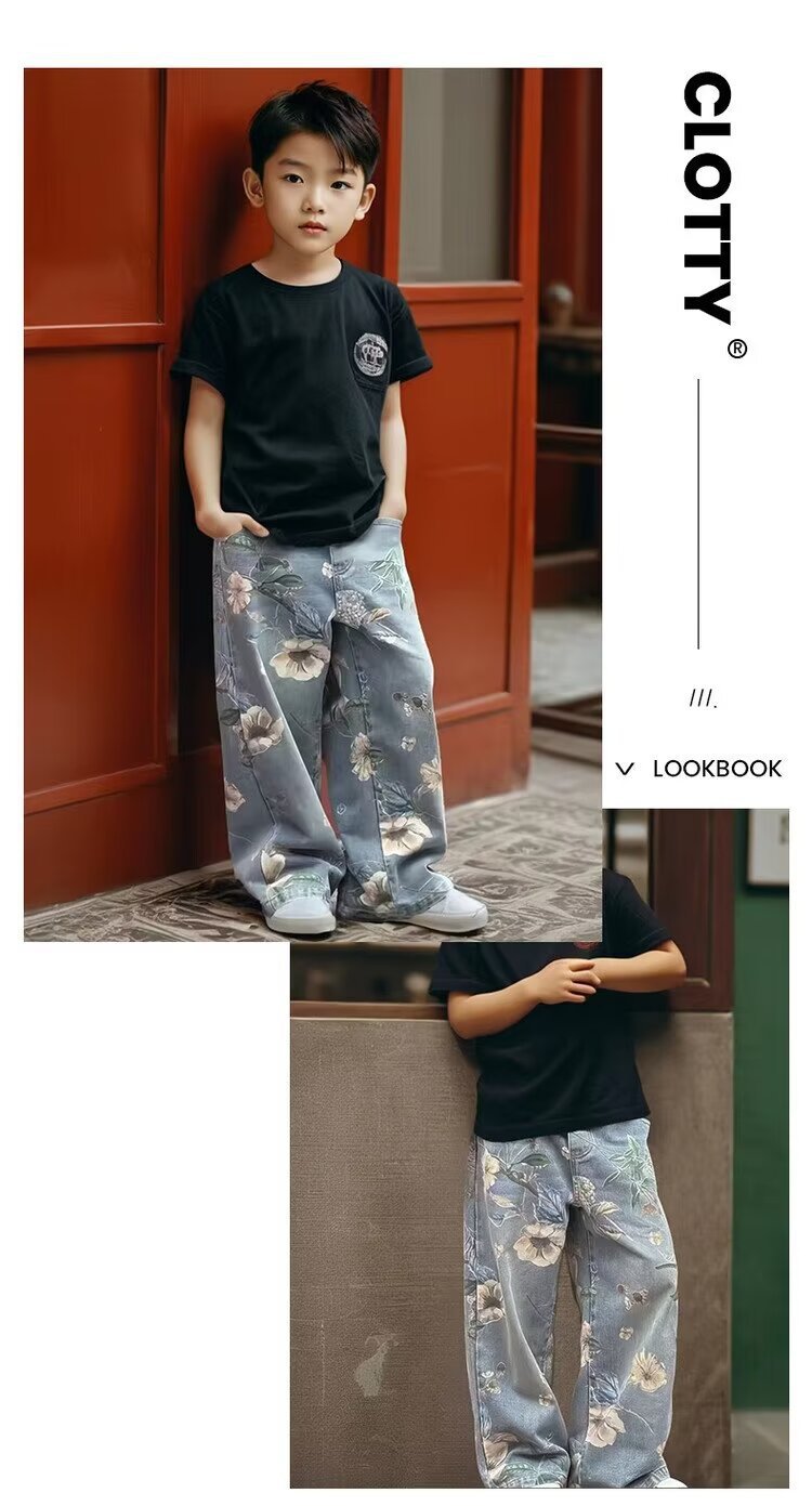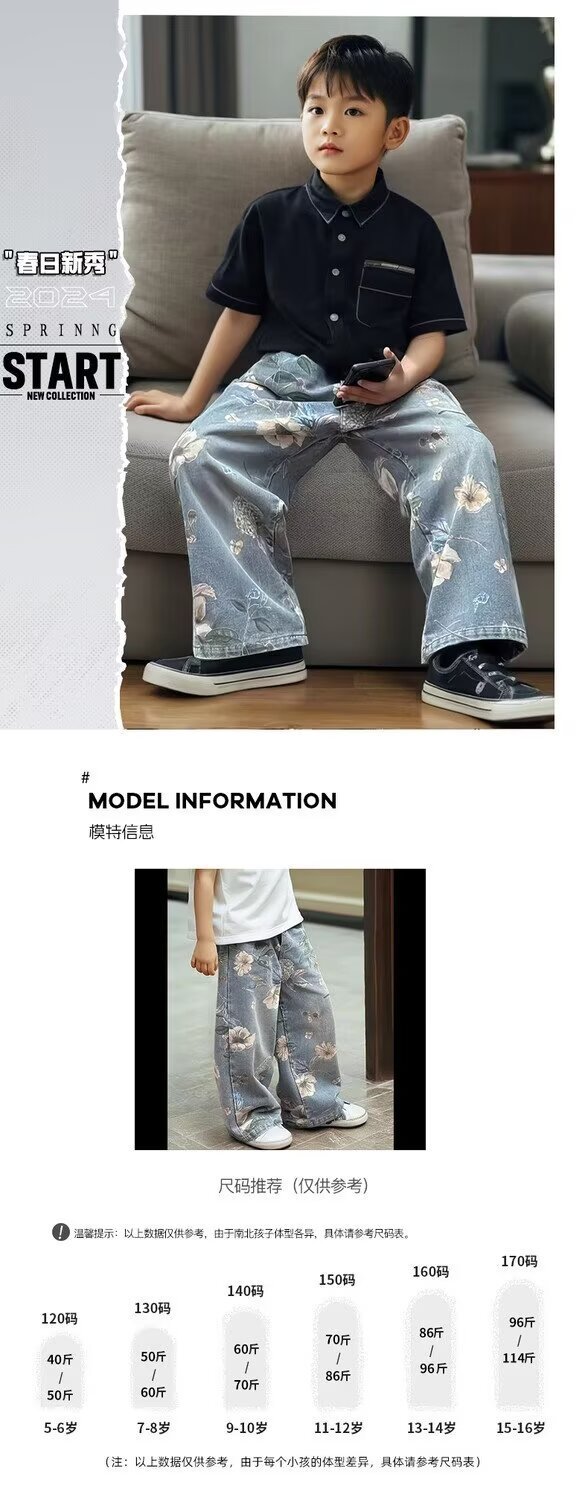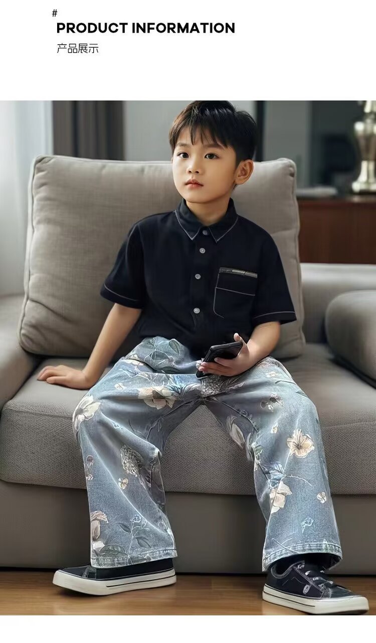 소년의 봄과 여름 바지 2025 새로운 스타일 큰 소년 미국 인쇄 거리 청바지 아기 한국 스타일 스트레이트 다리 바지스토어 가기