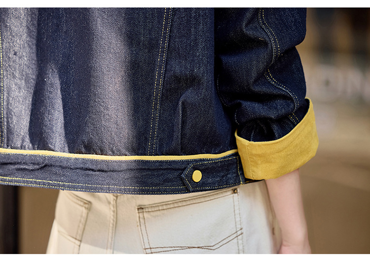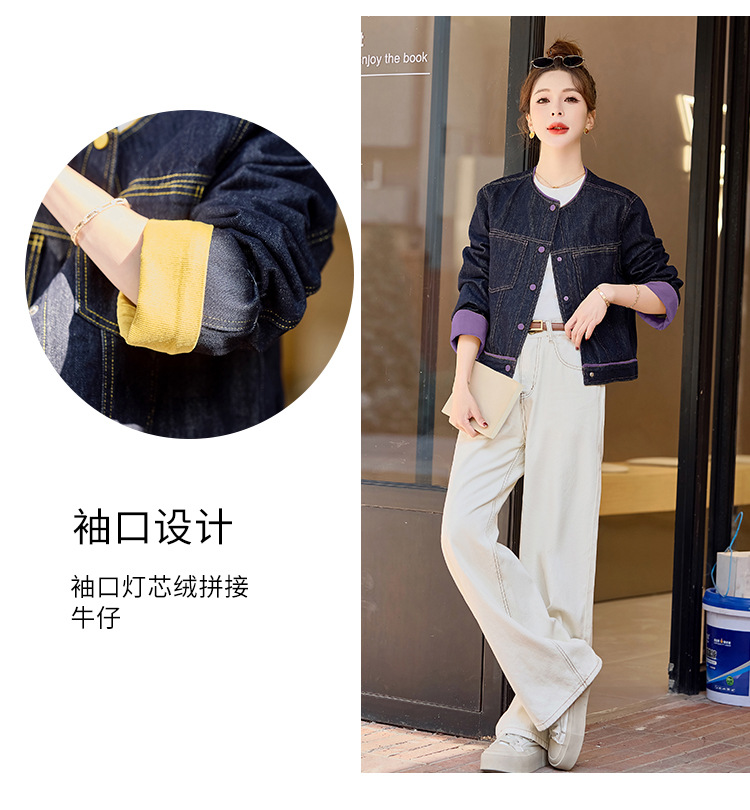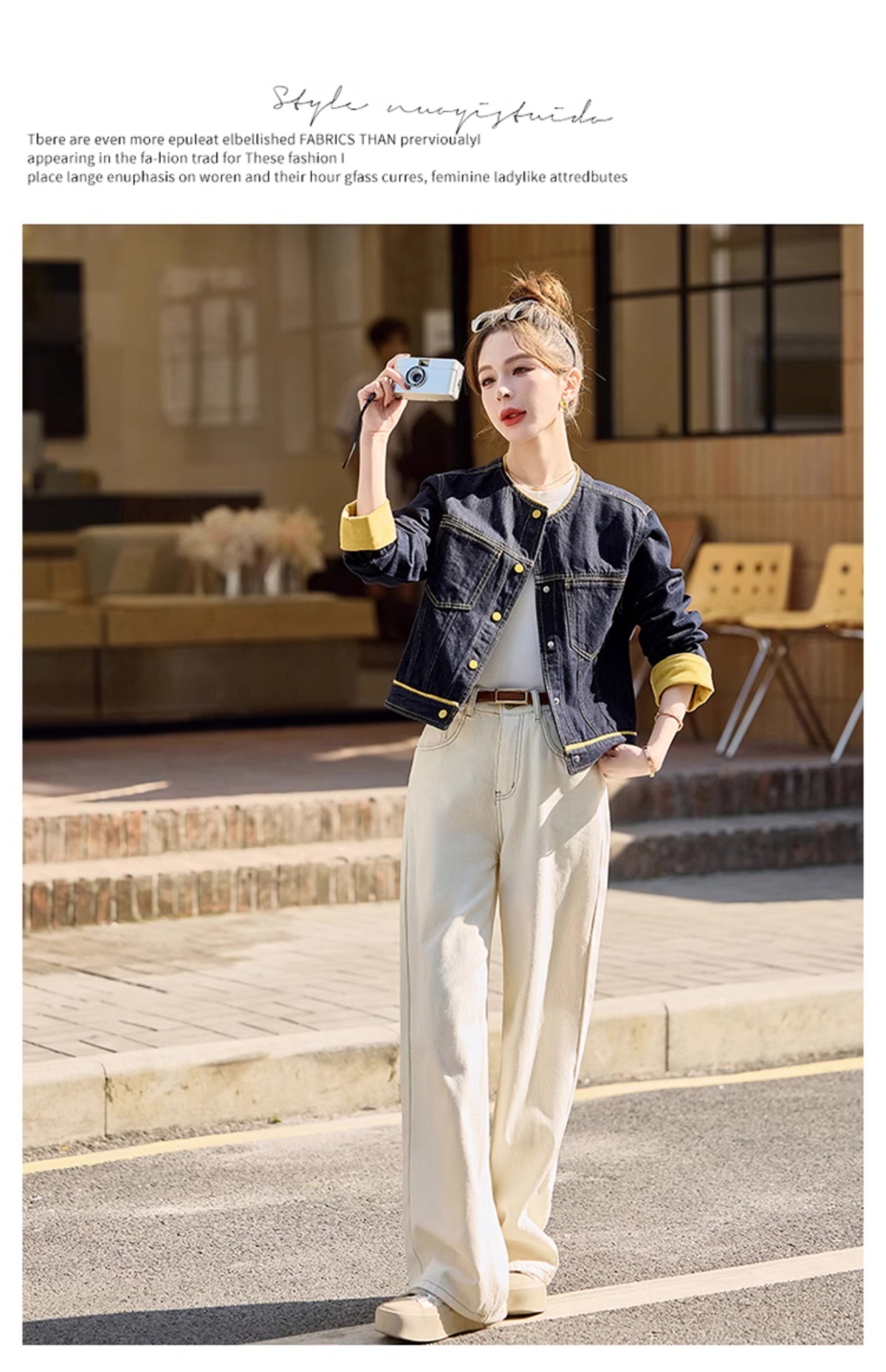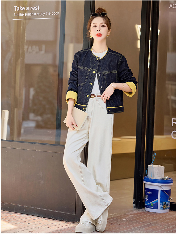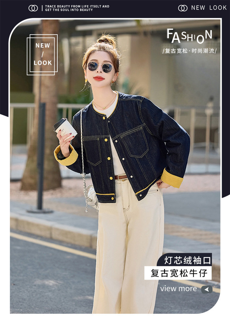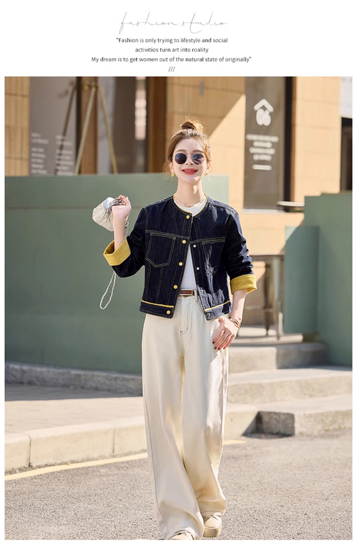 디자인 센스 대비 컬러 스티칭 데님 코트 여성용 짧은 2025 봄 캐주얼 슬리밍 라운드 넥 루즈 재킷 탑스토어 가기