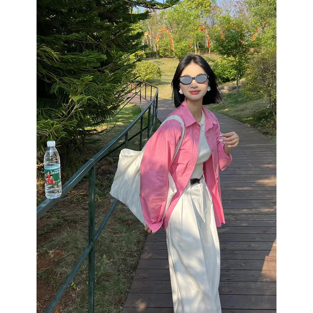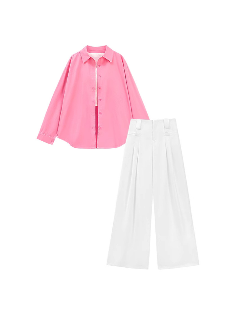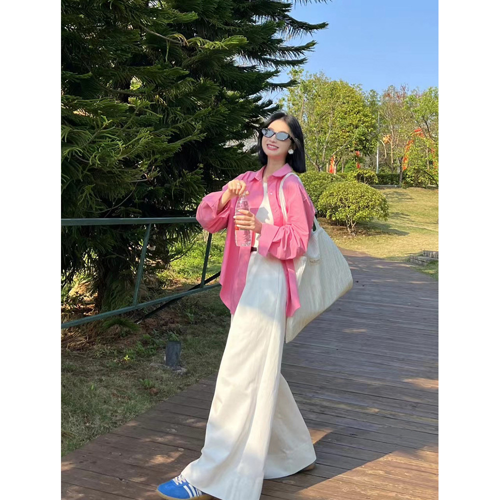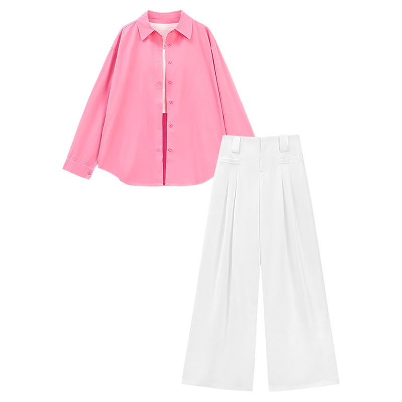한국식 세트 여성용 봄 핑크 긴팔 셔츠, 카미솔 화이트 캐주얼 와이드 레그 바지 3 피스 세트