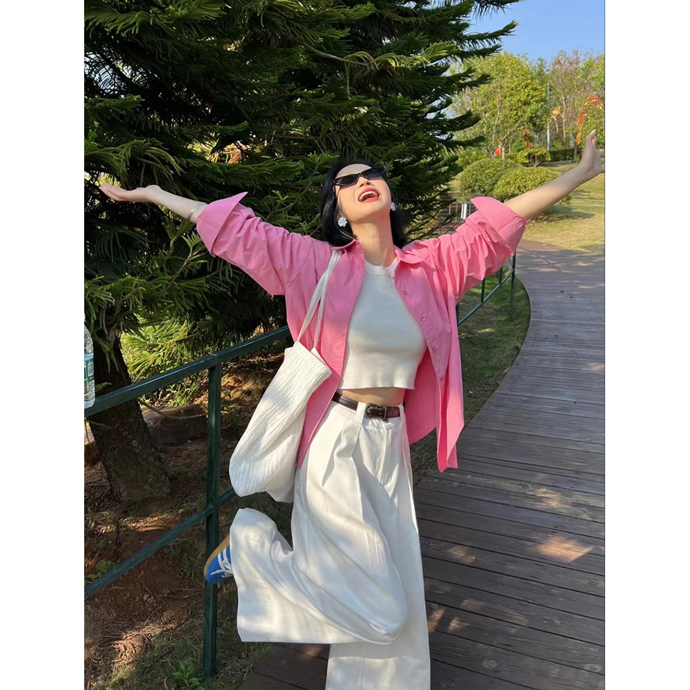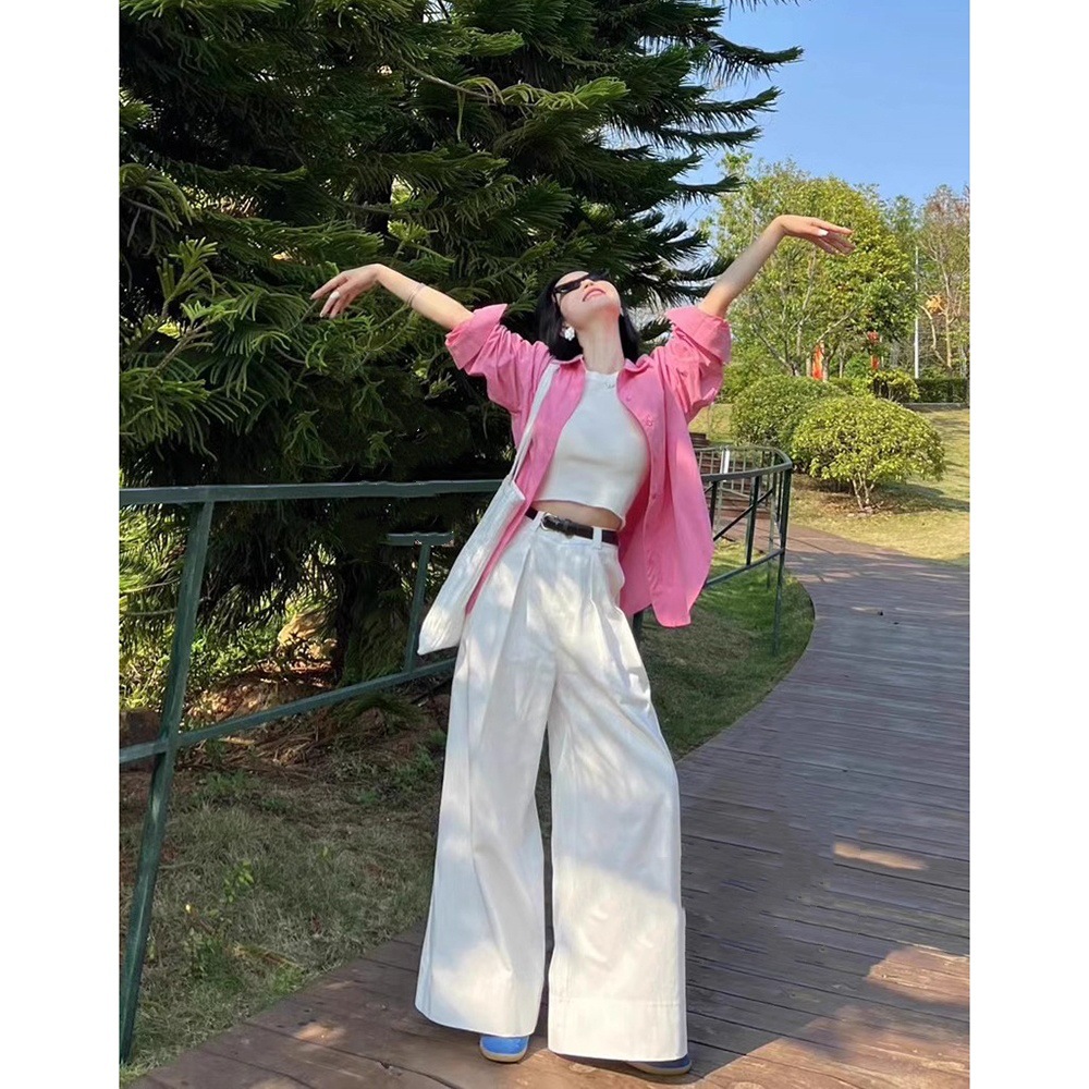 한국식 세트 여성용 봄 핑크 긴팔 셔츠, 카미솔 화이트 캐주얼 와이드 레그 바지 3 피스 세트스토어 가기
