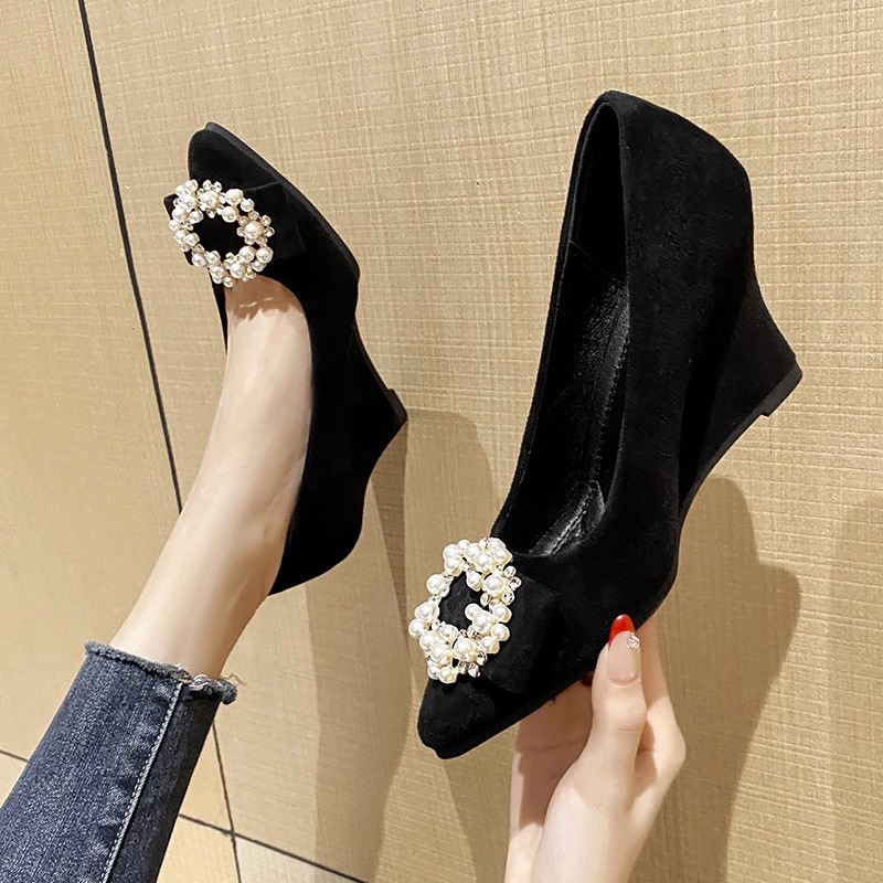 웨지 패션 싱글 레이어 신발 여성의 2025 봄 새로운 도착 패션 라인스톤 포인팅 얕은 입 부드러운 밑바닥 여성을위한 피곤하지 않은 하이힐