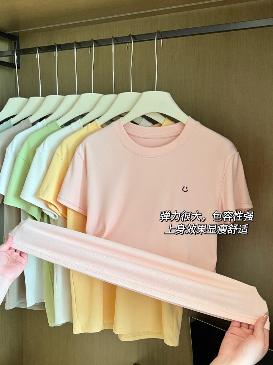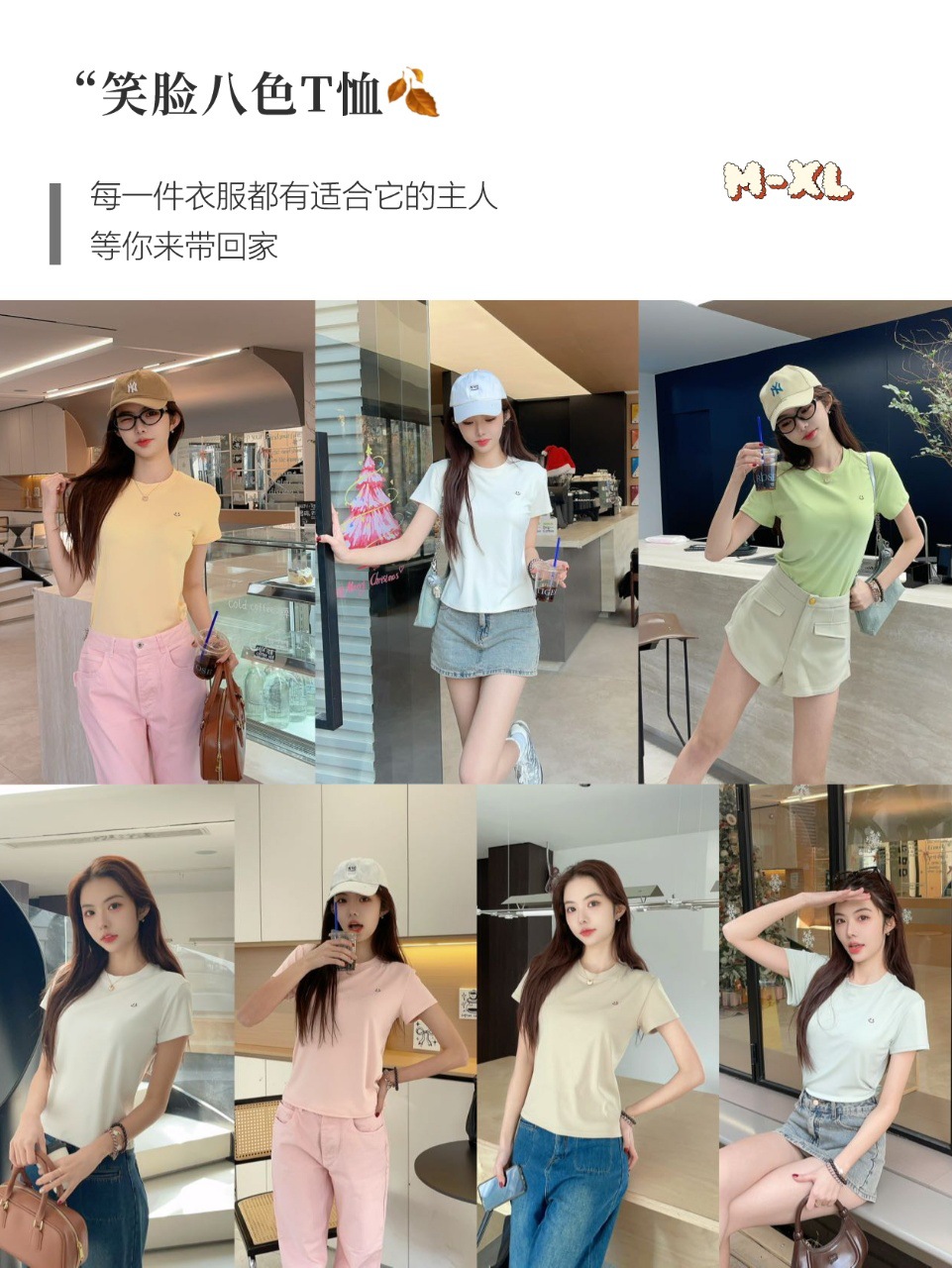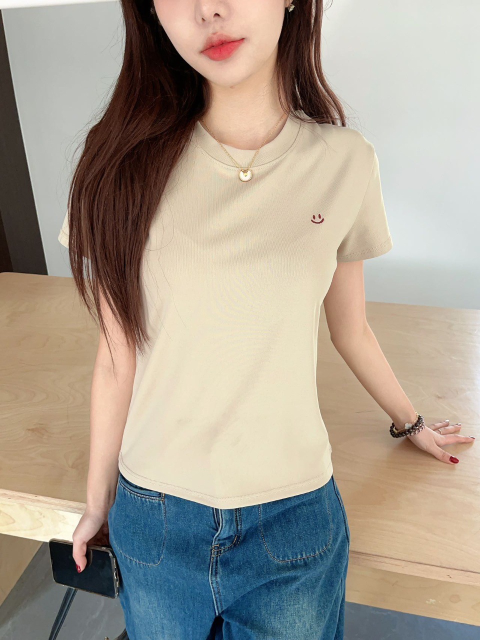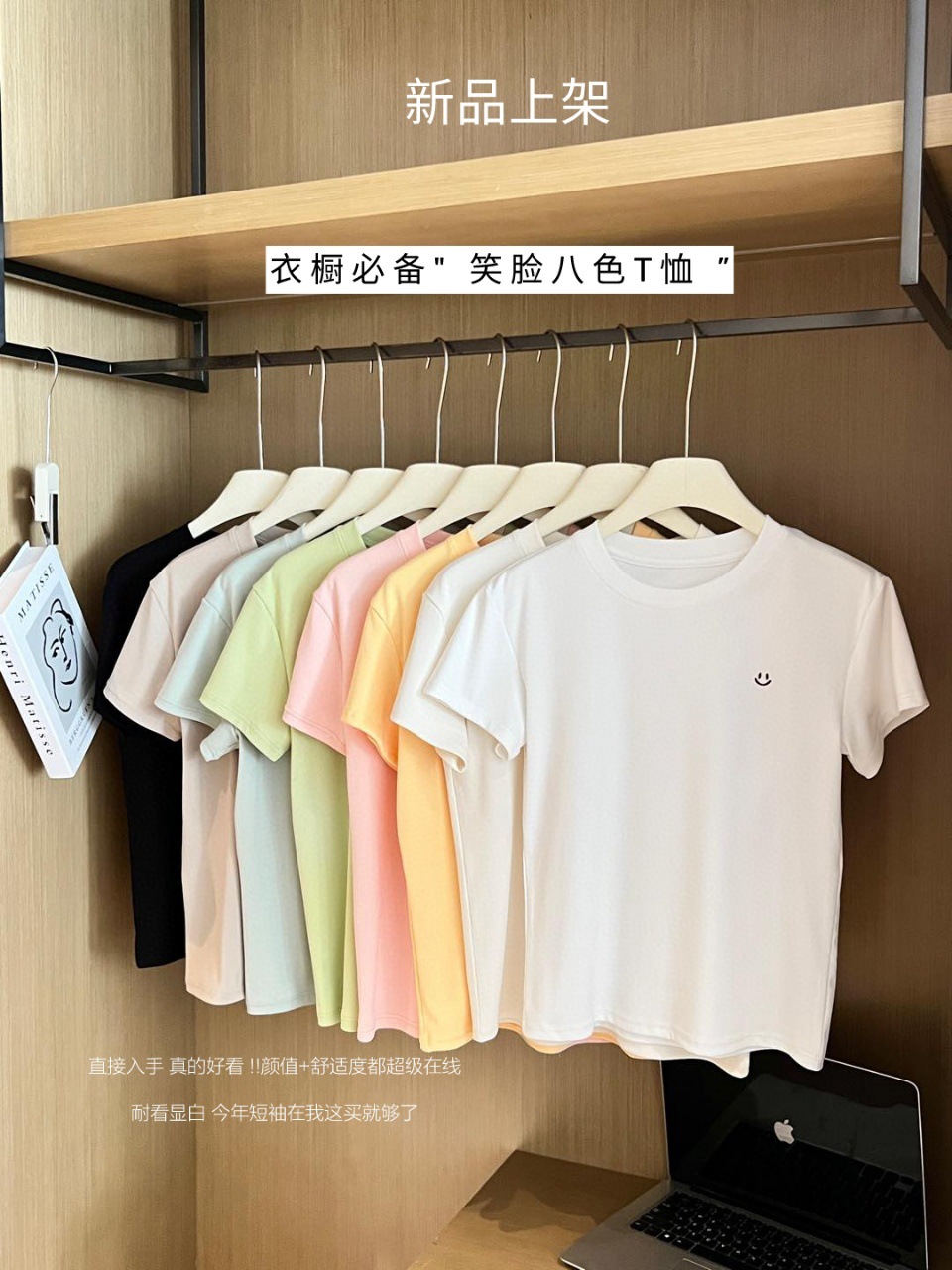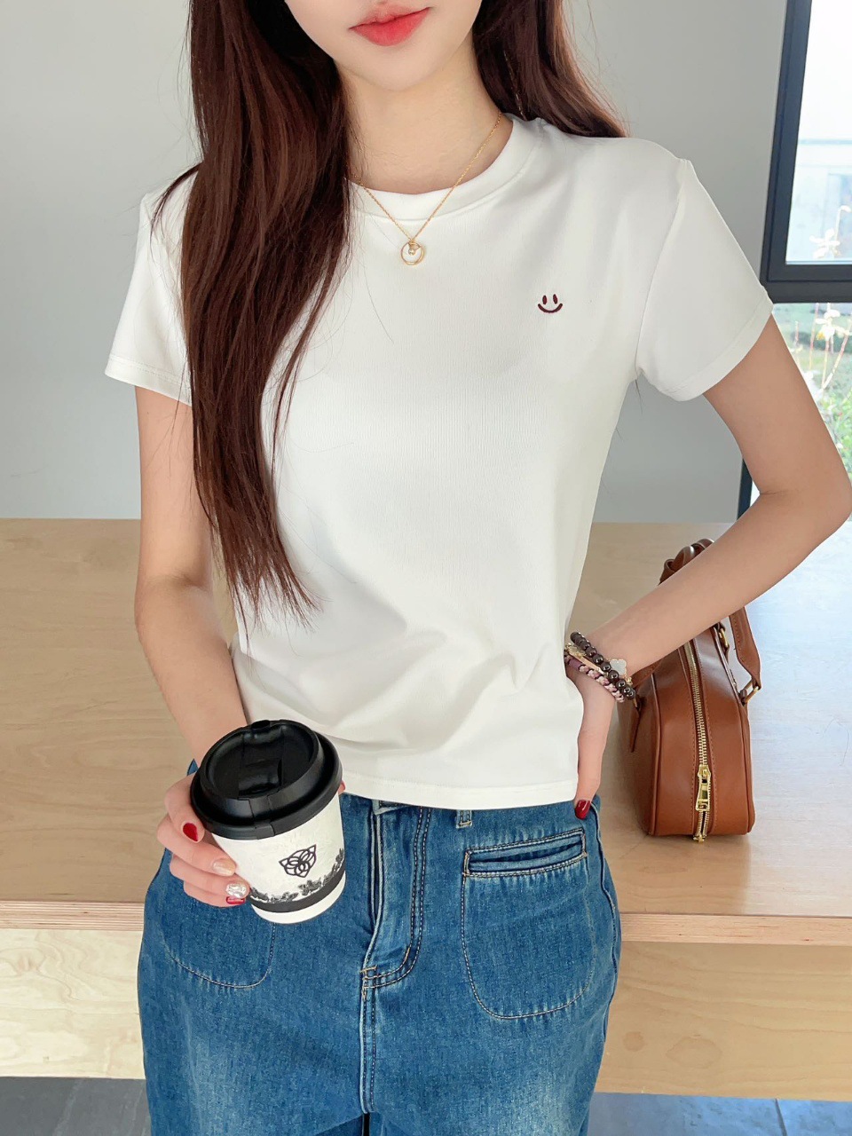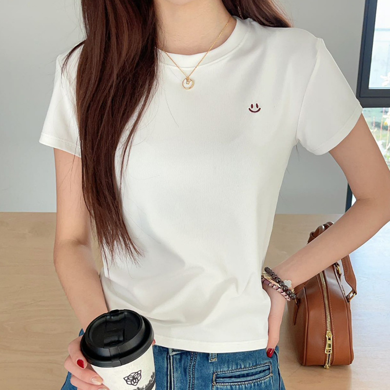 스마일리 크루 넥 사랑스러운 여름 반팔 티셔츠 여자 올 매치 숄더 탑 반소매 스트레치 슬림 핏 도매 티셔츠스토어 가기